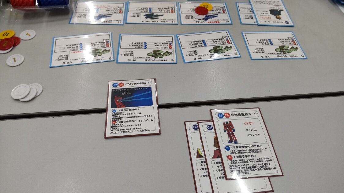 主たる目的は「イデオン・デッキ」の特殊ルールを忘れないためだったりして。地球連合軍(イデオン)デッキは、キャラの人数やその死亡(!)によるゲージの使用やイデオンの理不尽なまでの特殊攻撃が売りで、多くのキャラがいればいるほど、また、1名以上が犠牲になれば攻撃力が上がるという、超変則デッキです。本来は艦載機のイデオンは、その大きさと特殊性から艦船扱いというのも、独特です。