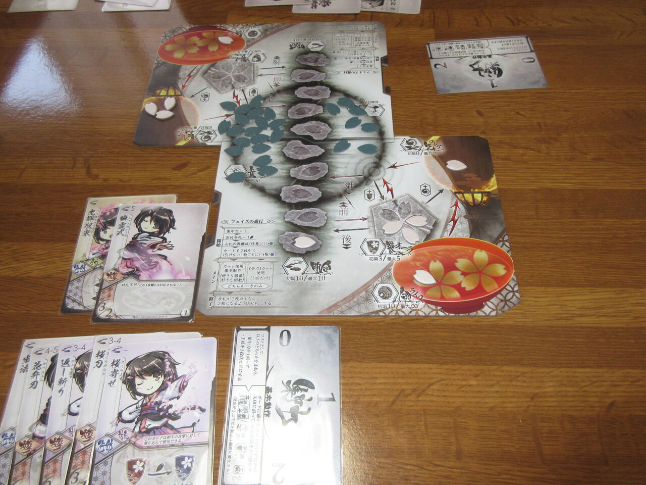 これならいけそうと、第5戦も前回の作戦を踏襲し、反応カードによる防御強化で、一進一退の攻防になります。ともにHPが1となったところで、ホノカ(mitsu)が「桜刀」を放ち、やっと勝ったと思いきや、ウツロ(BIBI)がここで「潜り」。距離を取ってもう一撃と勇むも、あれ、山札がない?!またもカード切れで、ライフを失い、5連敗。ああ、どうしたら勝てるんだぁ(泣き)。