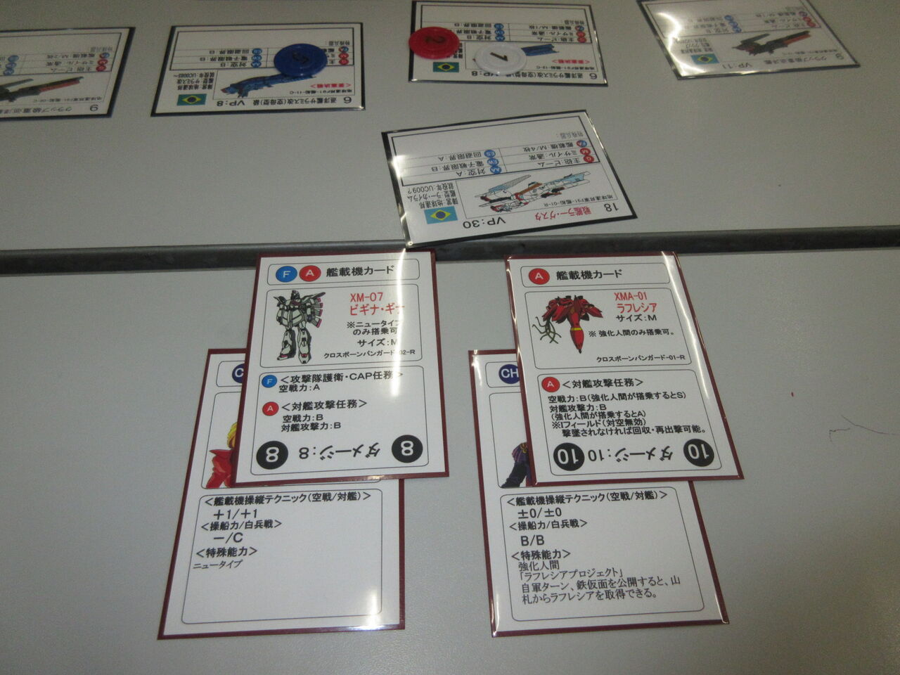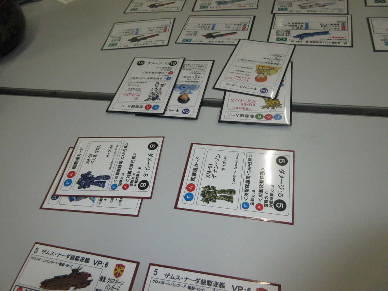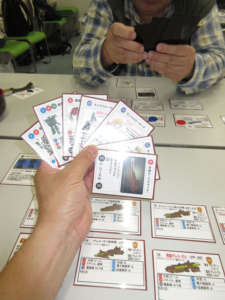艦載機(MS)の攻撃力はやや高いものの、飛び道具(波動砲系)もなく、艦砲の威力も弱い両陣営。ある意味、S&T最弱デッキと言えますが、その「実力」を遺憾なく発揮して、撃てども一撃では沈まず、空戦力は高いが2攻撃しかないバグなどで、序盤はちまちました牽制合戦に。
