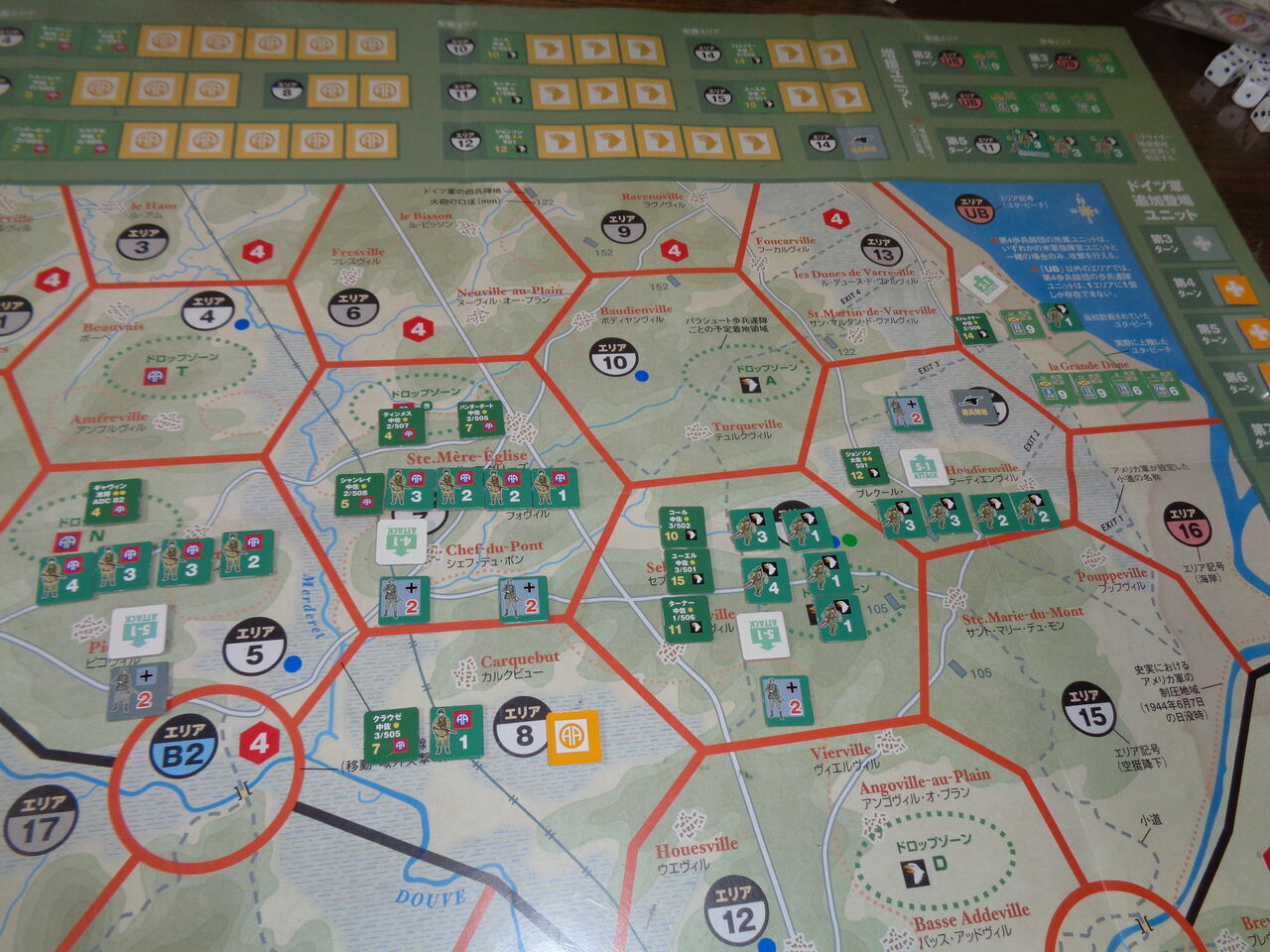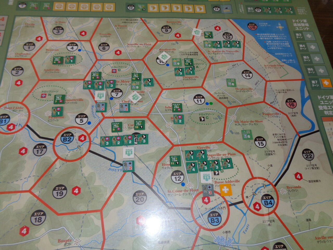 残り3ターンとなった第6ターン、アメリカ軍はエリア7とエリア8の掃討を進めるとともに、海岸堡から前進した第4歩兵師団と共同で、北部エリアを攻めます。これにより、エリア13を占領しますが、エリア7とエリア8では、いまだドイツ軍が抵抗しています。