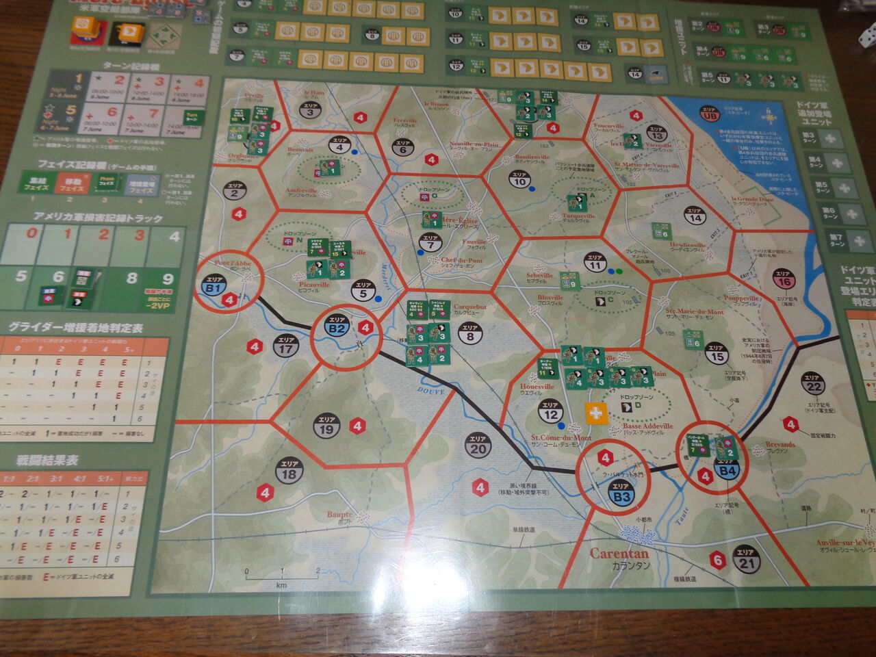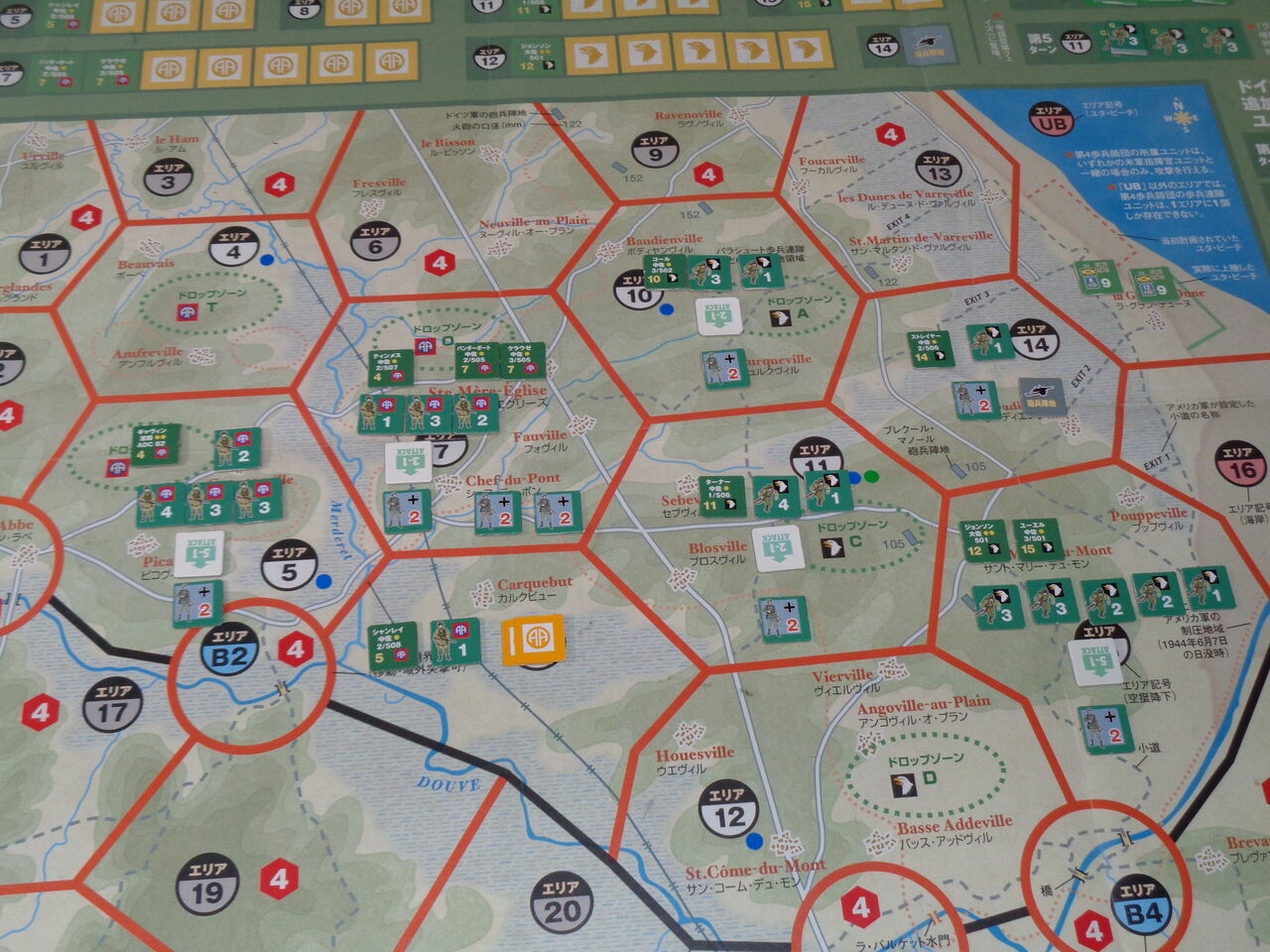第5ターン、再び、夜のとばりが訪れ、アメリカ軍第101空挺師団は、グライダー連隊3ユニットの増援を得ます。一方のドイツ軍は、前ターンにエリア7へ、このターンにカランタン手前のエリア12へ増援が登場します。