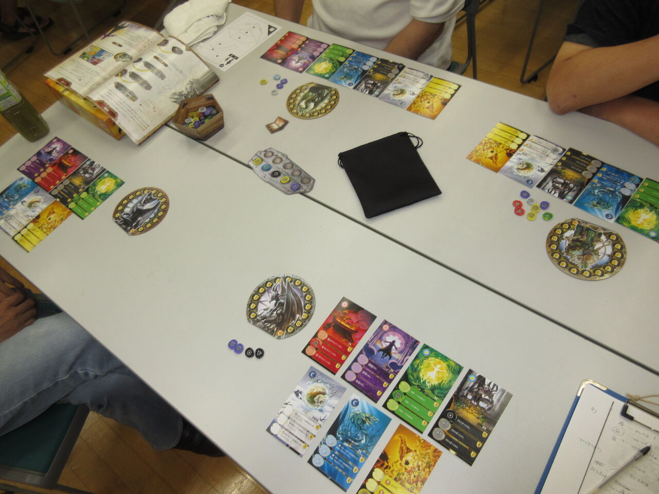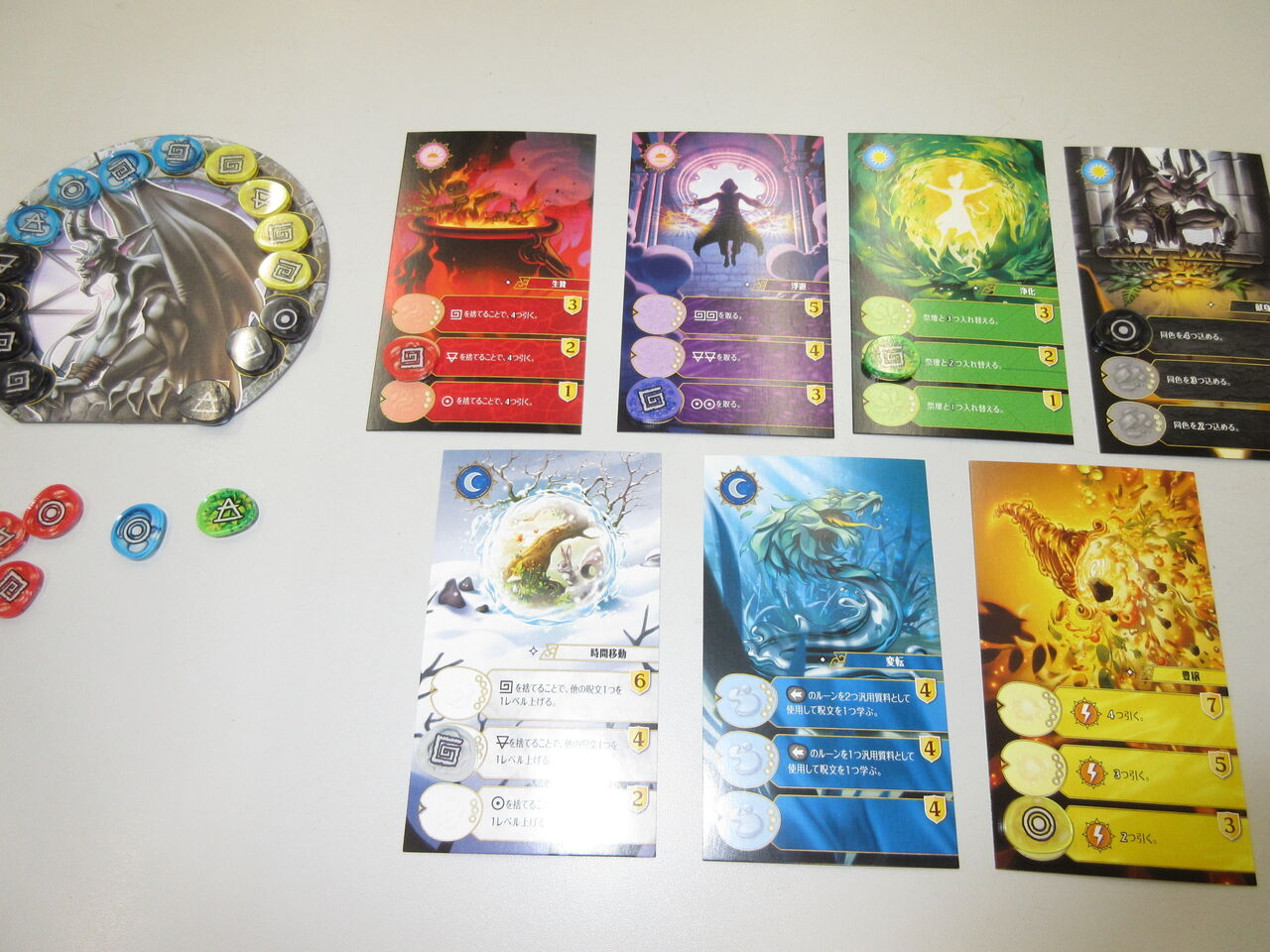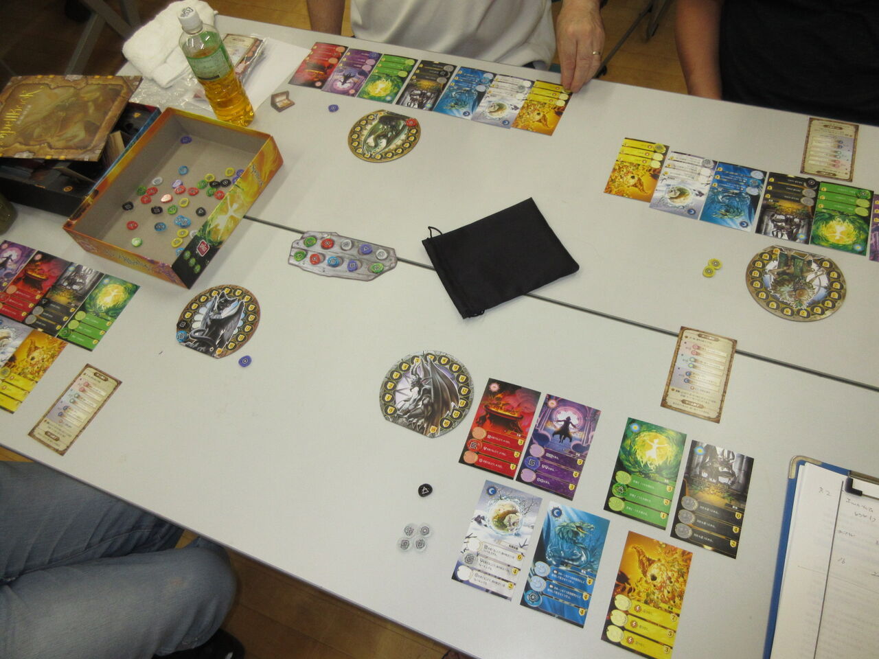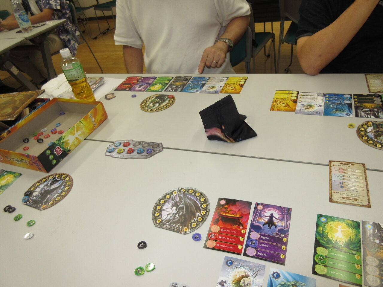 第1戦は、トークン一つの消費で4つまでランダムに引ける赤の呪文で、先行したmitsuが他の呪文を次々に開発。使い魔ボードへの捧げ物をする黒の呪文で一気にVPを重ね、そのまま、勝利に。ただ、全プレイヤーとも、本当は1つの行動を全て行っていたことがわかり、次から修正します。