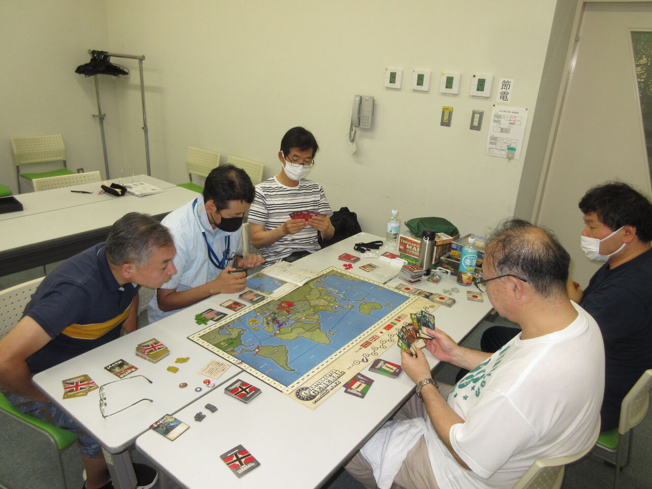 午後になり、人数が揃ったところで、BIBIさん希望の「主計将校」(HJ)を6名で対戦しました。以前にちはら会でもプレイしたWWⅡの戦略級で、プレイヤーは枢軸軍(ドイツ・イタリア・日本)と連合軍(イギリス・アメリカ・ソ連)に分かれて、勝利を競います。特徴的なのは、各国の専用カード(リソース)が用意されていて、非常に潤沢なアメリから最も貧弱なイタリアまで、枚数と内容がそれらしくなっているところです。プレイはドイツから順に枢軸軍-連合軍が交互にプレイする点と、基本プレイでは攻撃か侵攻(占領)しかできないため、味方同士の「慮る」連携が肝になります。