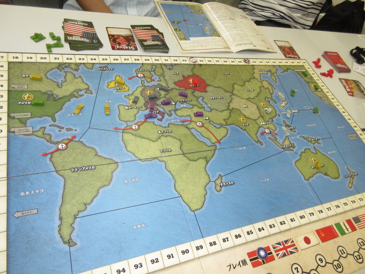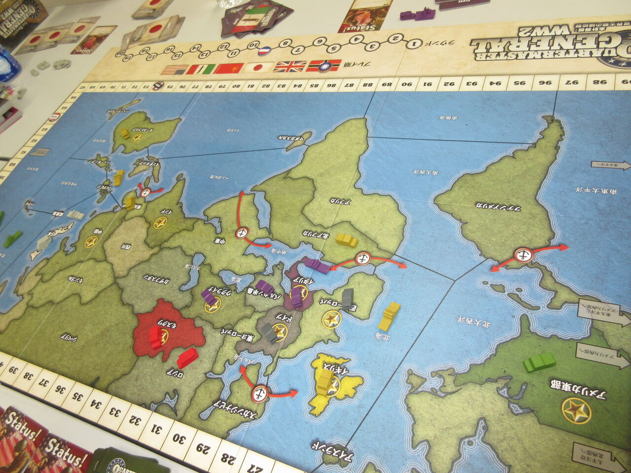 第1戦は、枢軸軍(mitsu・バーネット・平)対連合軍(BIBI・若月・ライン)です。序盤、イギリスとドイツ、アメリカと日本がにらみ合っている内に、枢軸に有用なカードが来て、対ソ戦を有利に進めます。特にイタリア軍が史実を上回る活躍で、地中海を押さえた後、ウクライナと中東まで占領します。これにより、第5ターンに枢軸軍が8ポイントのリードをします。