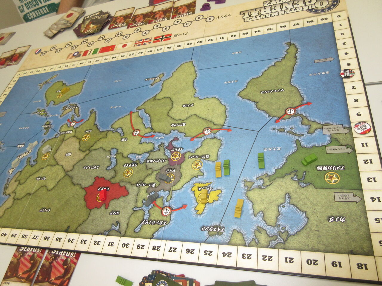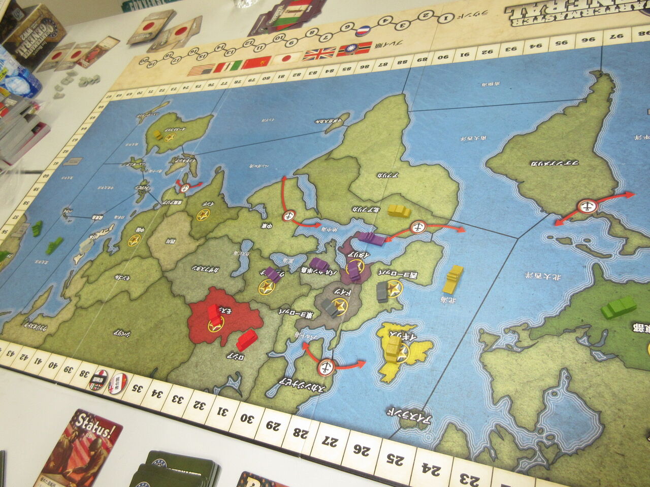 イギリスは一度、アフリカに進出し、ヨーロッパの下腹部を狙いますが、イタリア軍が頑強でこちらは海軍同士の潰し合いに。ならばと、イギリスはイベントでオーストラリアを占拠し、そのまま、アジアに逆上陸し、インドを押さえ、得点差を広げないようにします。
