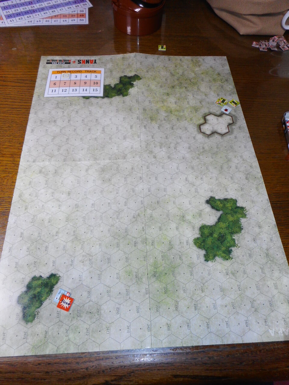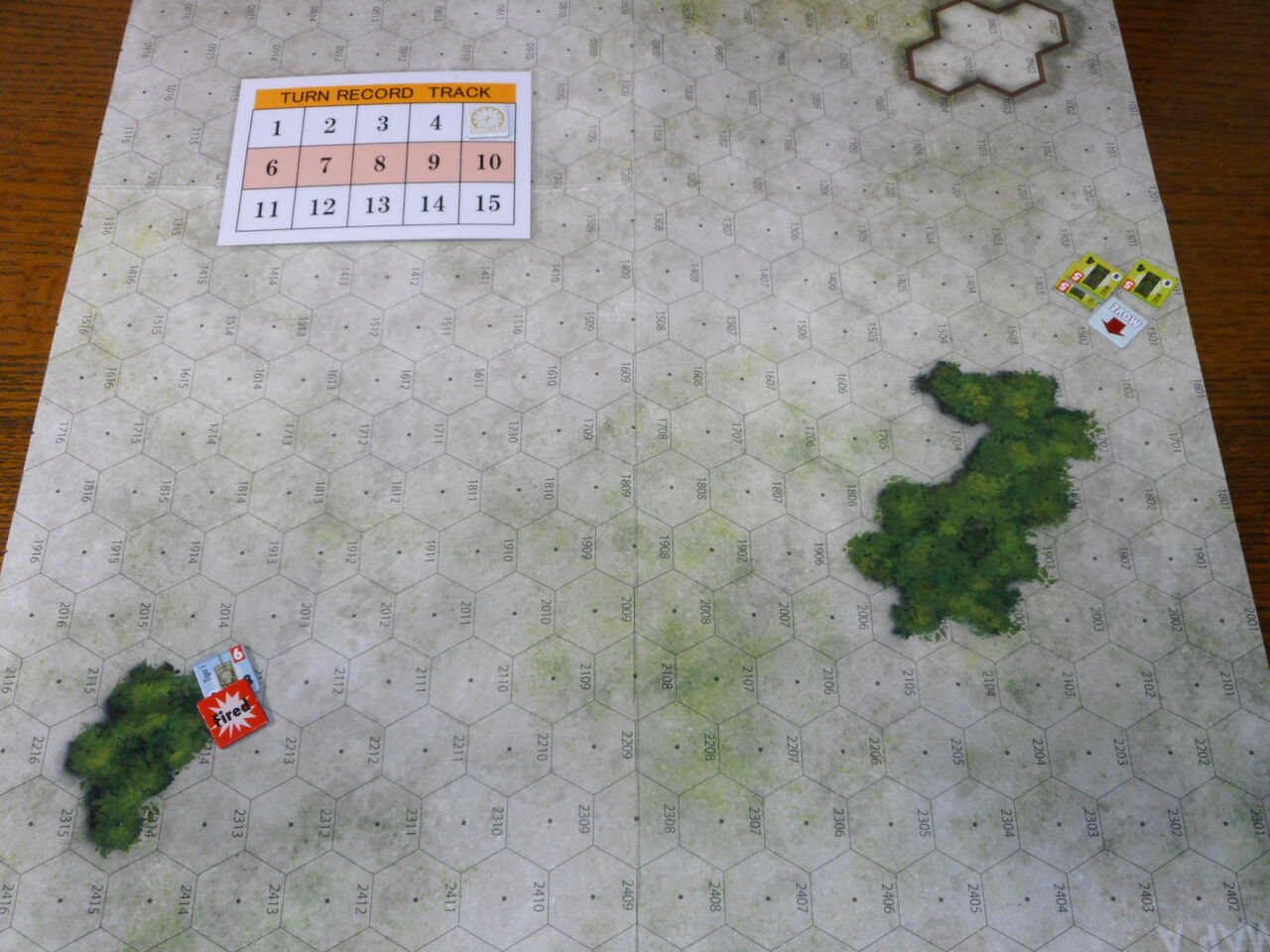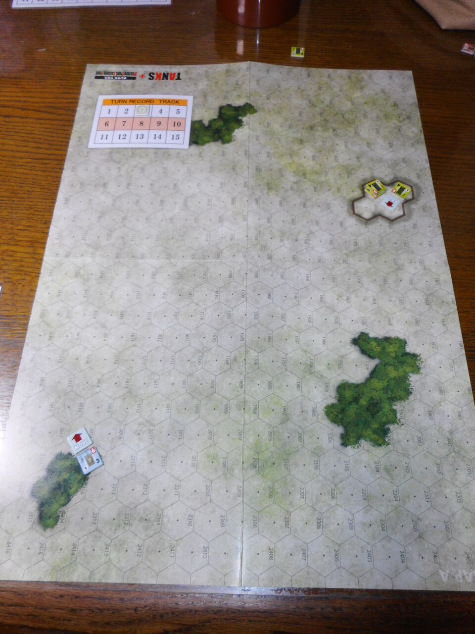 第1ターン、障碍物を利用したいアメリカ軍は、マップの西側寄りに登場します。一方のドイツ軍は、広い射界を得るべく、東寄りに登場します。1輛でも減らしておきたいドイツ軍は、弾薬切れのルールが適用されないことを活用し、超長距離射撃を実施しますが、さすがにこれは外れます。