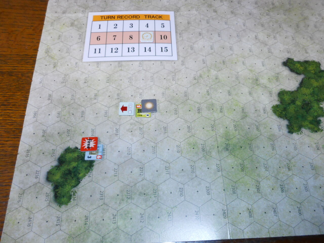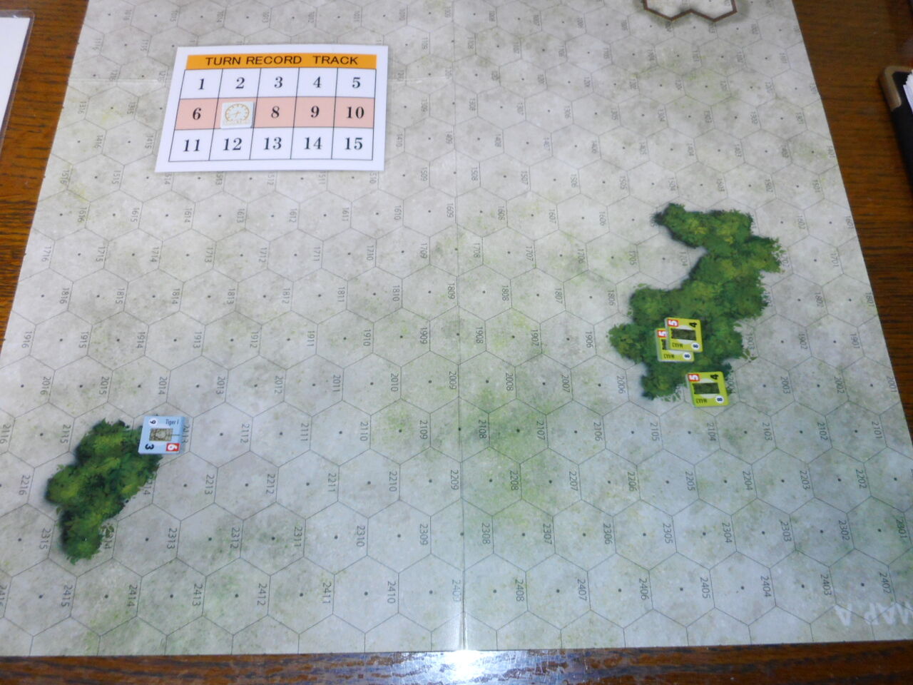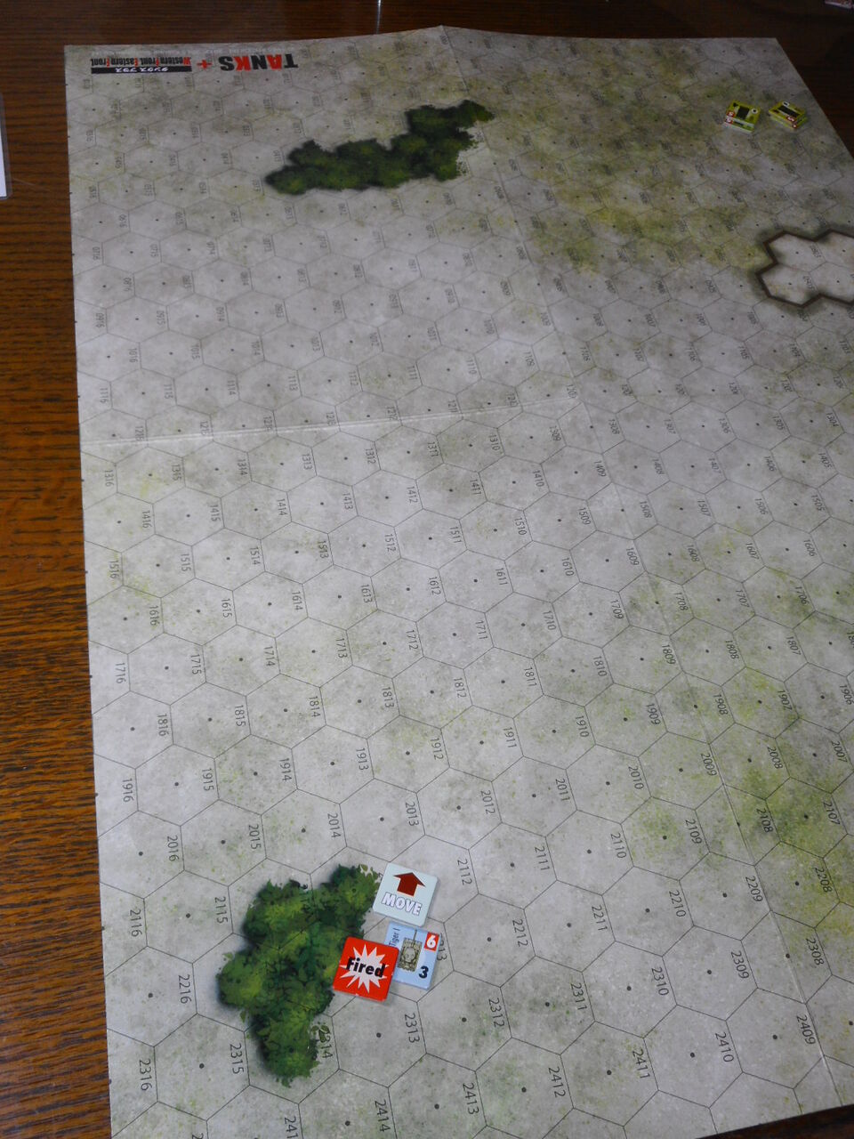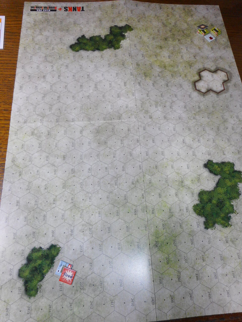 第1ターン、障碍物を利用したいアメリカ軍は、マップの西側寄りに登場します。一方のドイツ軍は、広い射界を得るべく、東寄りに登場します。1輛でも減らしておきたいドイツ軍は、弾薬切れのルールが適用されないことを活用し、超長距離射撃を実施しますが、さすがにこれは外れます。