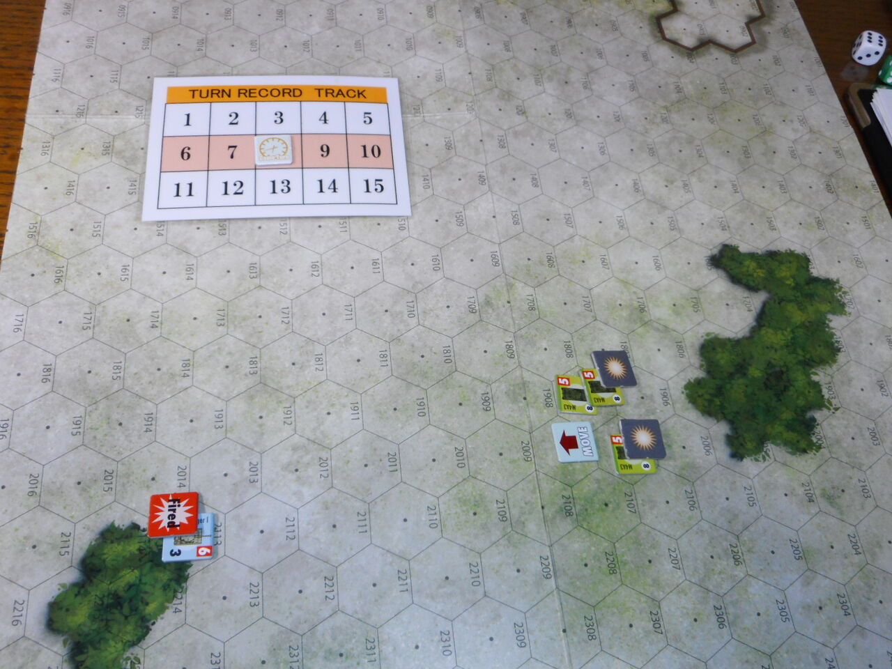 アメリカ軍が突撃を開始したのは、第8ターンでした。森から飛び出したM4隊は全速力で、敵に接近を図ります。待ち構えていた虎は十分に照準を付けて、砲弾を発射。これが一撃でM4を吹き飛ばし(ピンゾロで追加射撃!)、なおも走り寄るM4に連続射撃を実施し、こちらも火だるまにします。M4も必死に前進射撃をするも、車体の振動と森林効果により、全く当たらず。