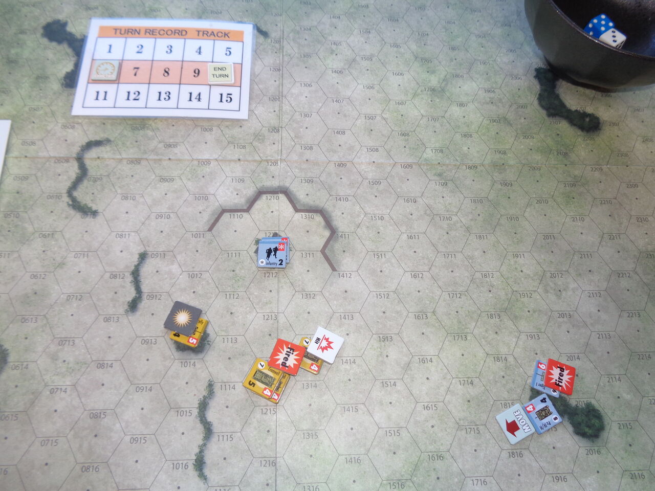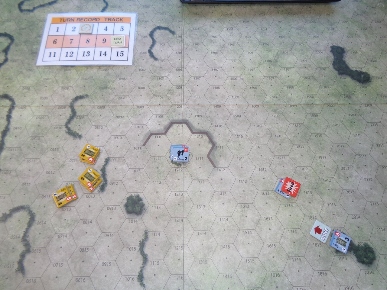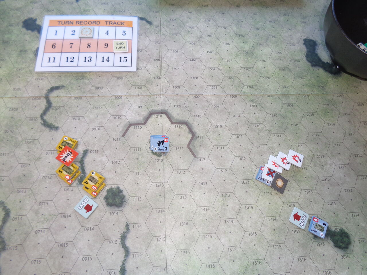 第1ターン、両軍は前進をしますが、お互いの戦車は射界外で撃てず。イギリス軍のみが建物に籠もる歩兵を射撃しますが、撃破に至らず。