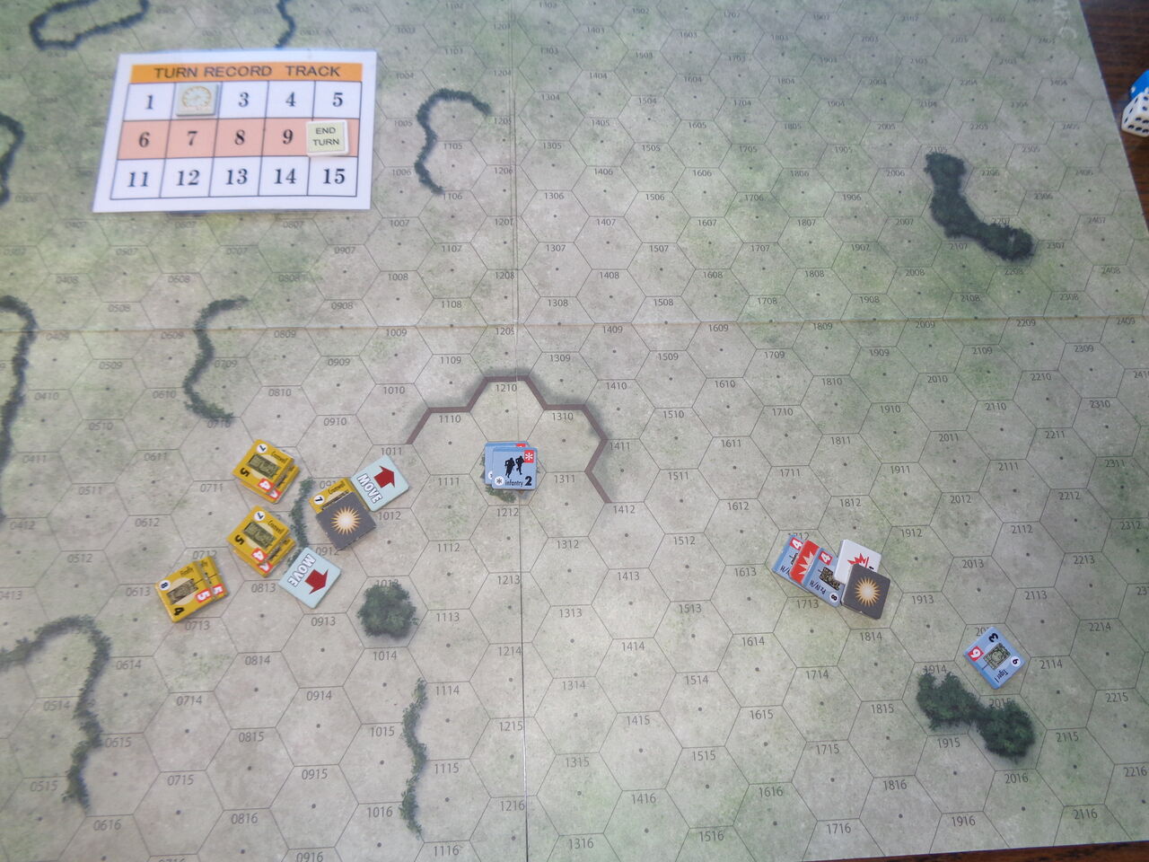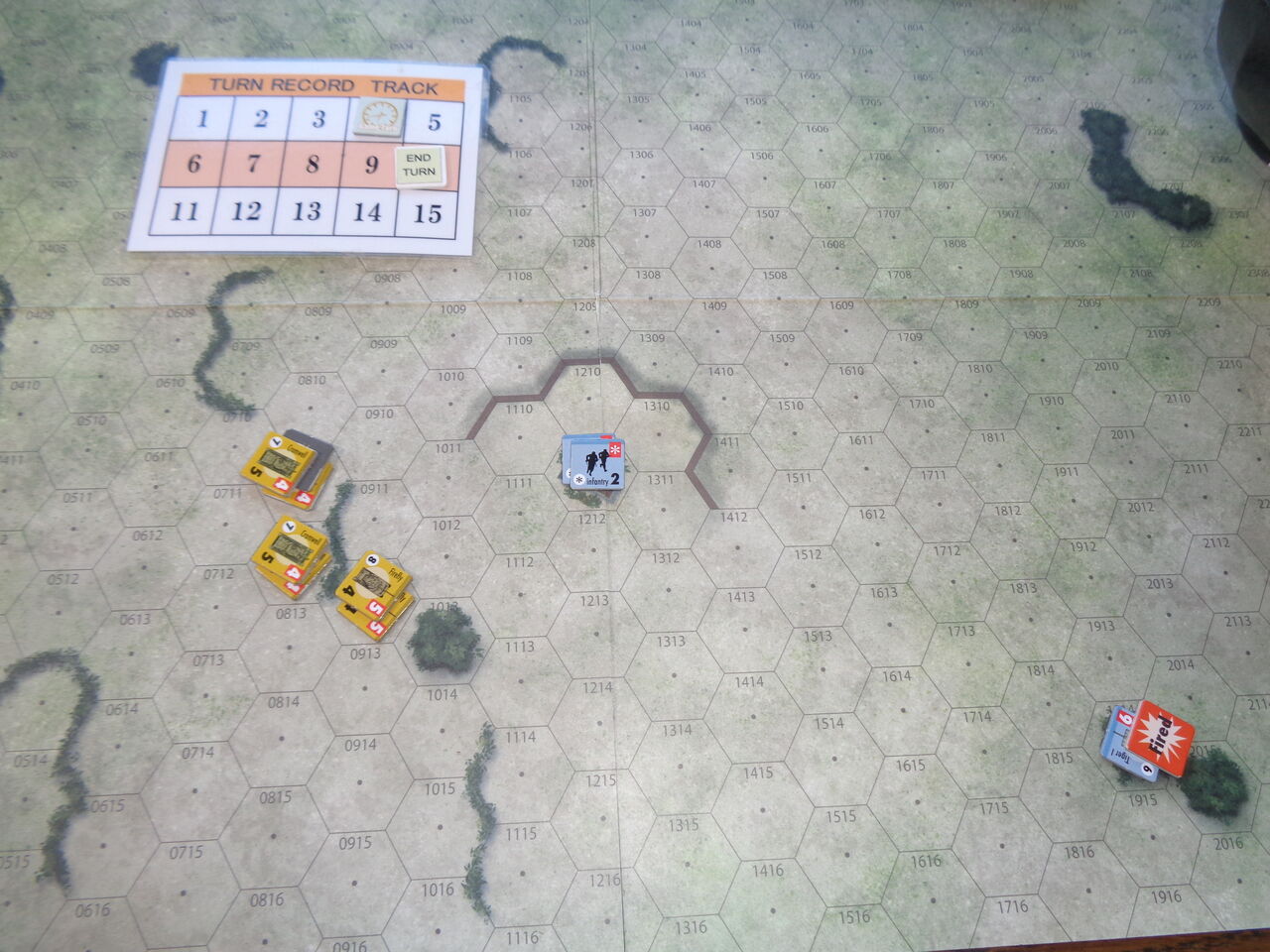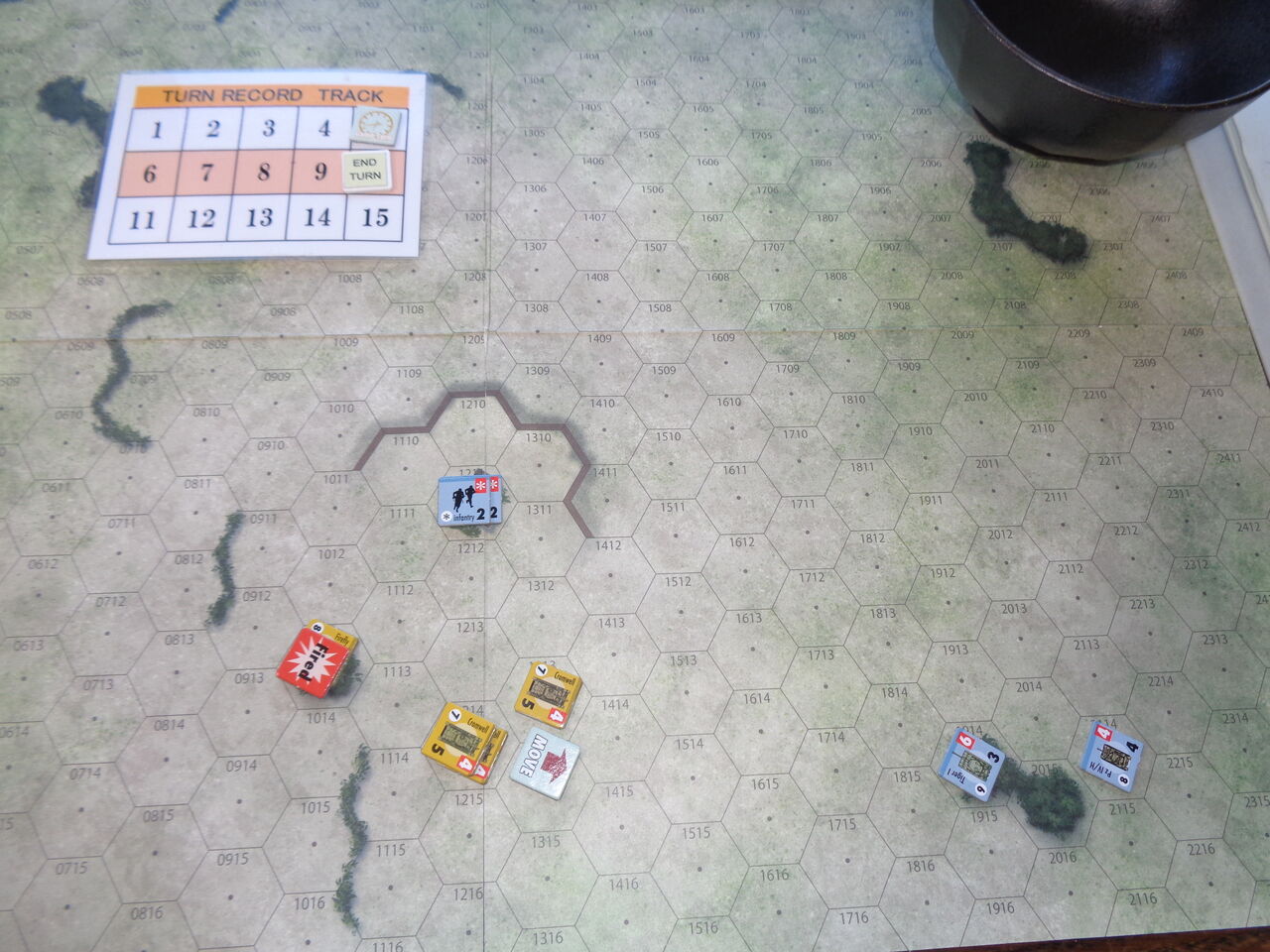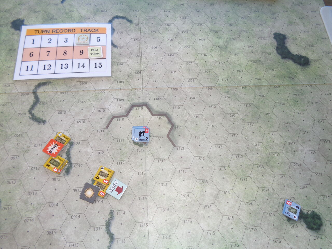 第1ターン、両軍は前進をしますが、お互いの戦車は射界外で撃てず。イギリス軍のみが建物に籠もる歩兵を射撃しますが、撃破に至らず。