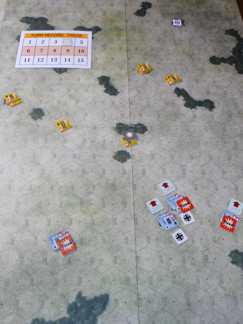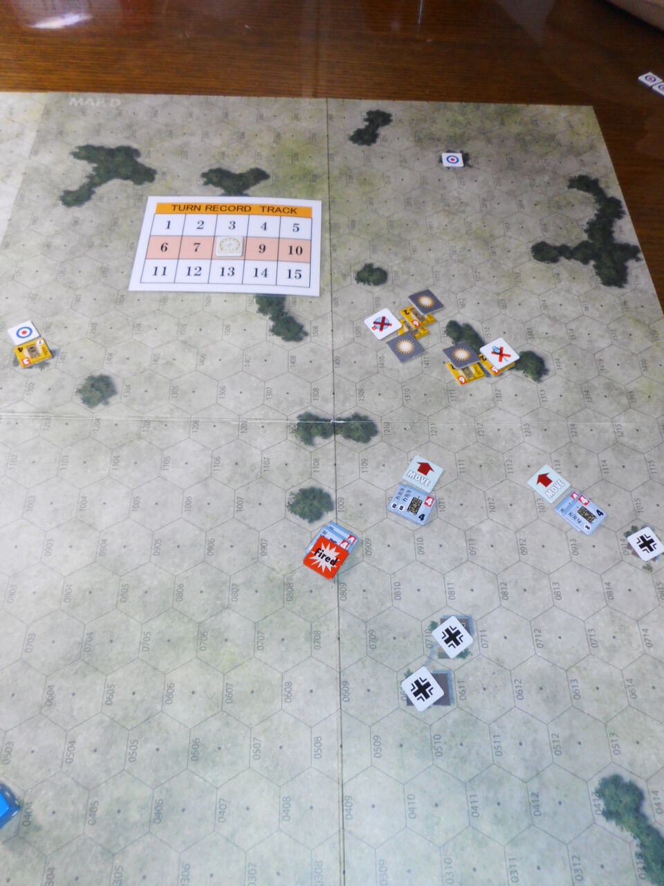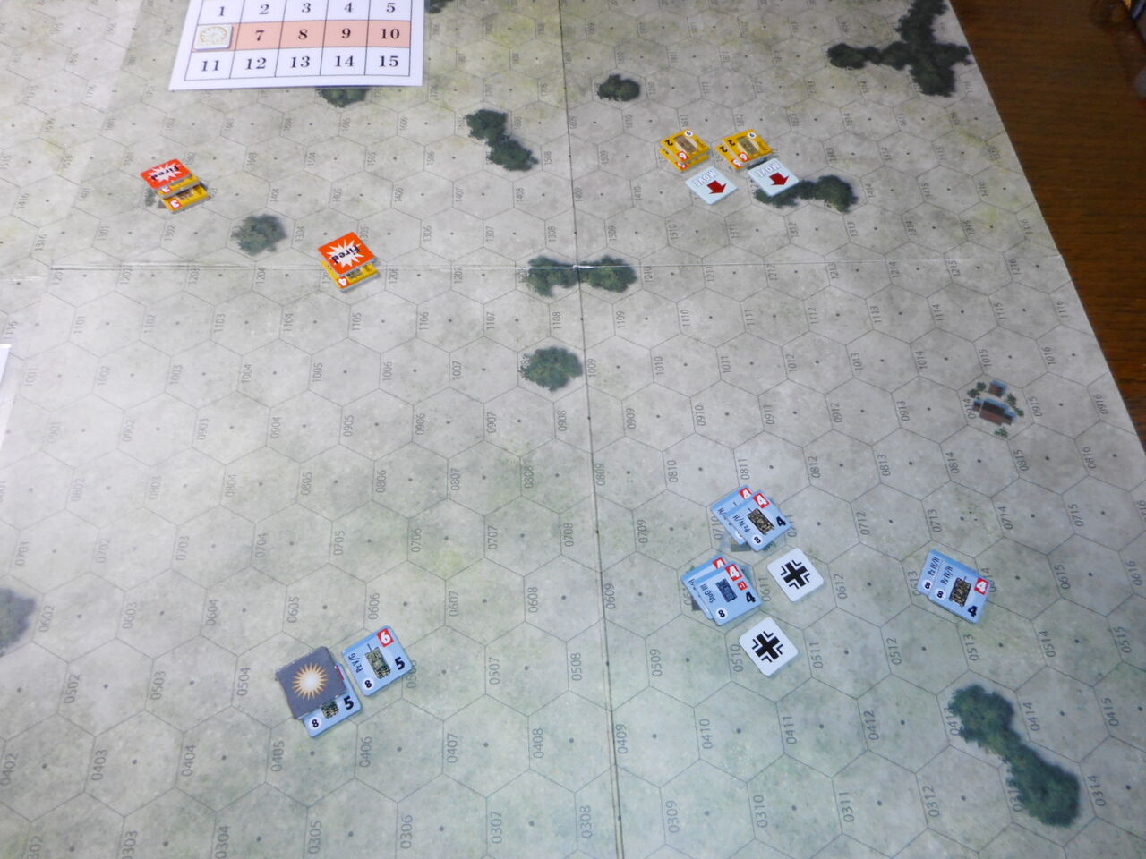 さらに、ドイツ軍ターンに、中央で遮蔽できなかったクロムウェルを準備射撃で撃破し、援護役として敵の動きを掣肘します。この間に、主隊は森林の陰から飛び出し、VPの建物群に向かって前進を行います。中央で唯一、射撃位置にいるクロムウェルが、4号戦車に準備射撃を命中させるも装甲に弾かれます。