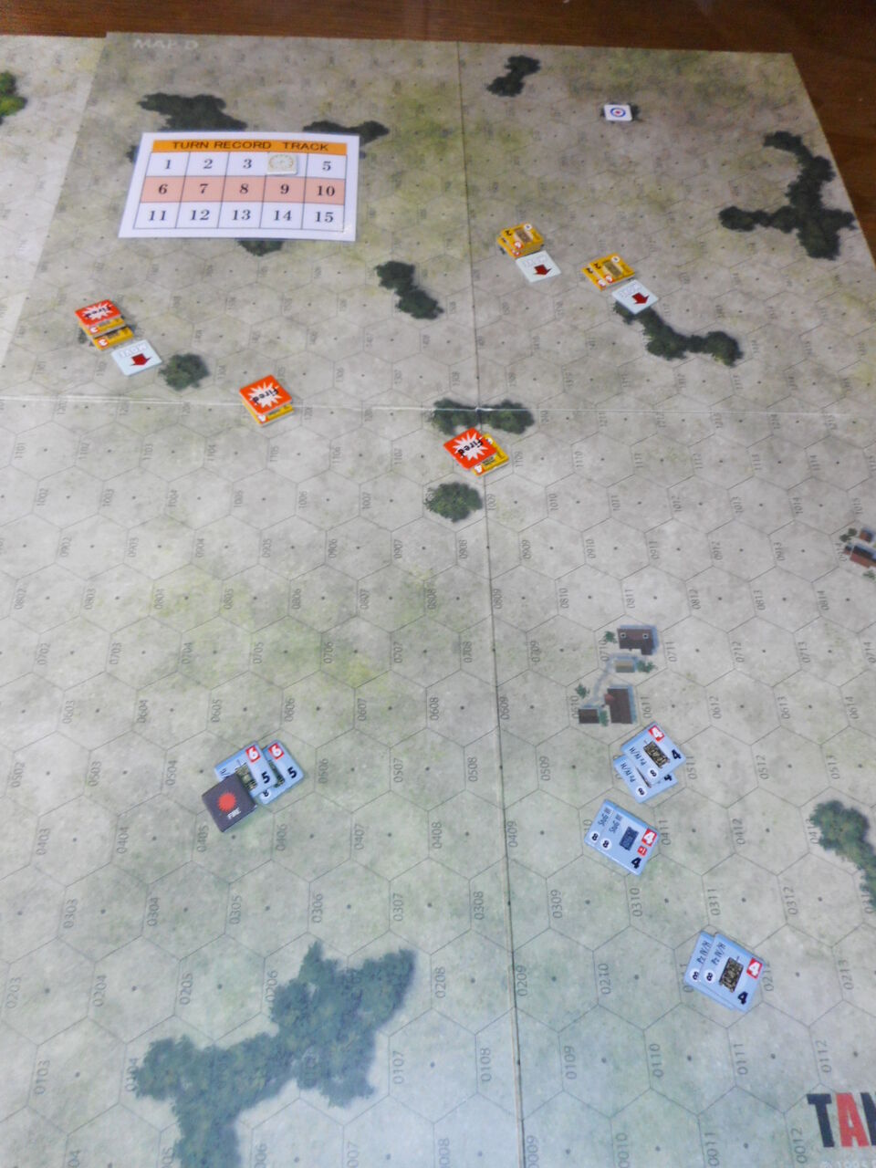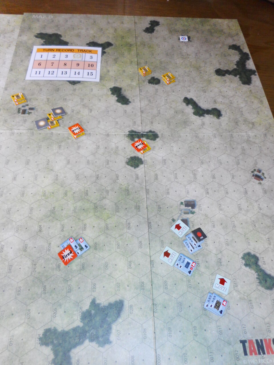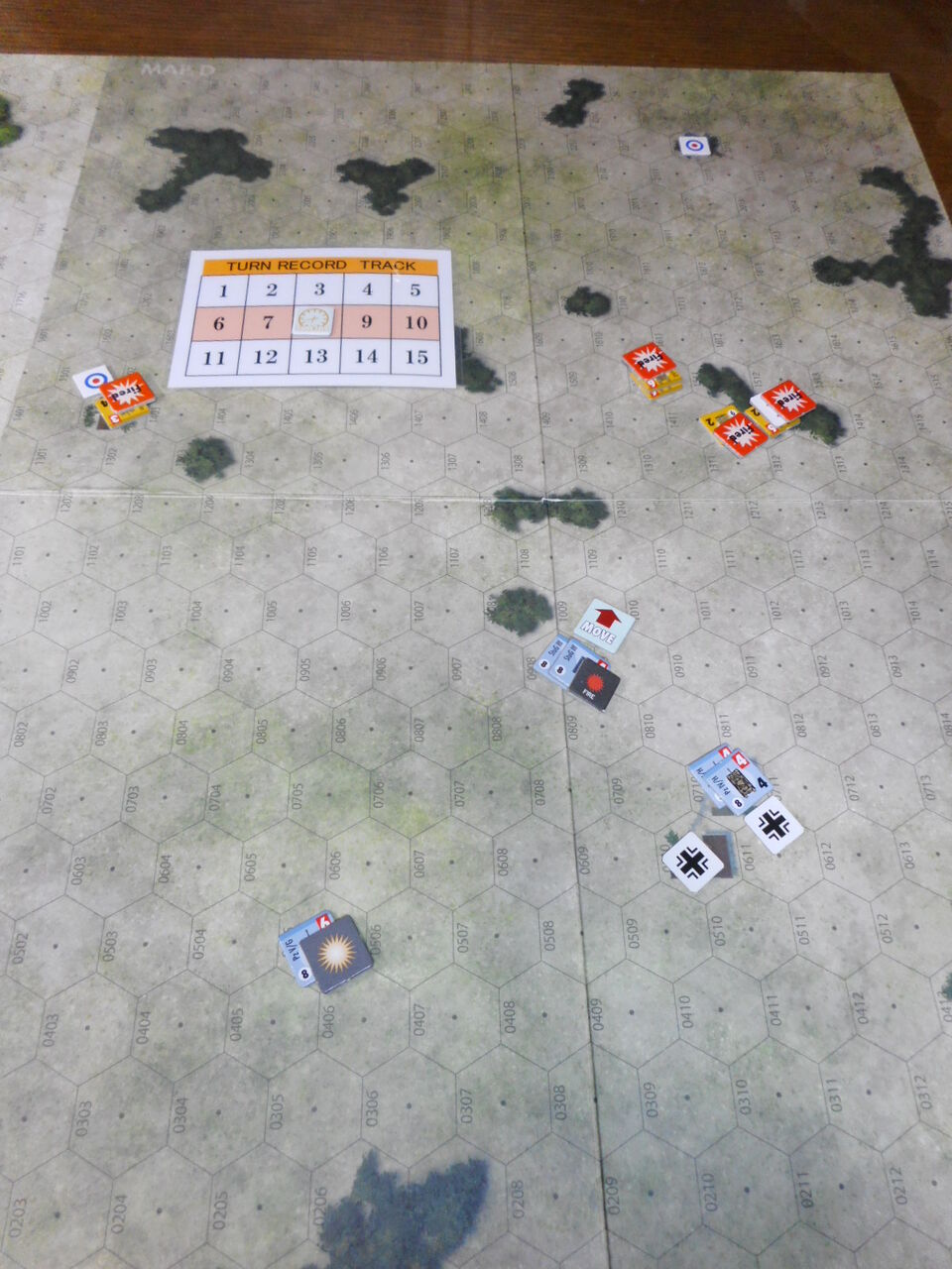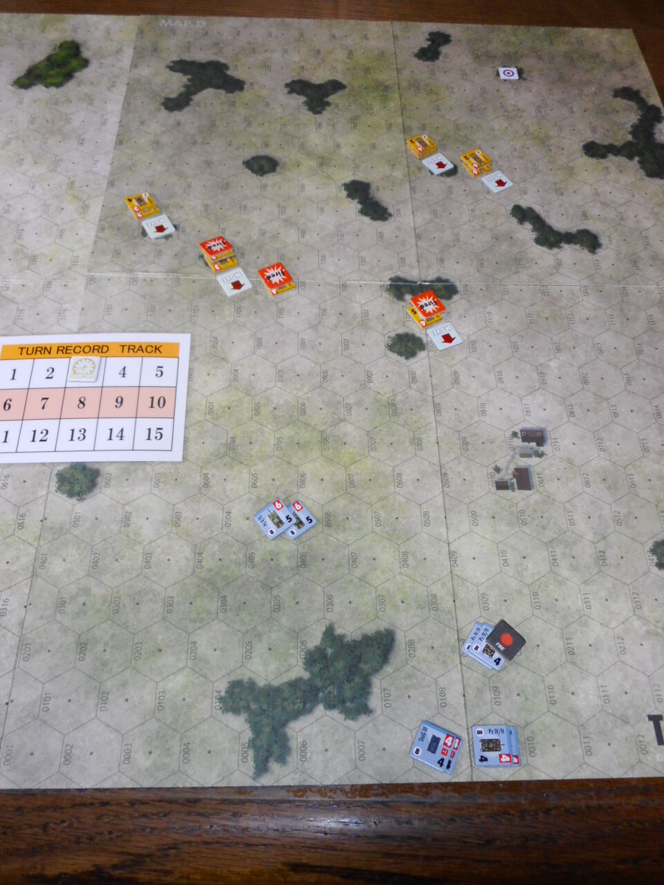 さらに、ドイツ軍ターンに、中央で遮蔽できなかったクロムウェルを準備射撃で撃破し、援護役として敵の動きを掣肘します。この間に、主隊は森林の陰から飛び出し、VPの建物群に向かって前進を行います。中央で唯一、射撃位置にいるクロムウェルが、4号戦車に準備射撃を命中させるも装甲に弾かれます。