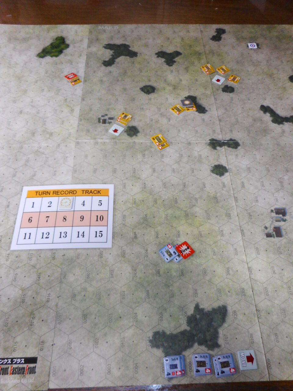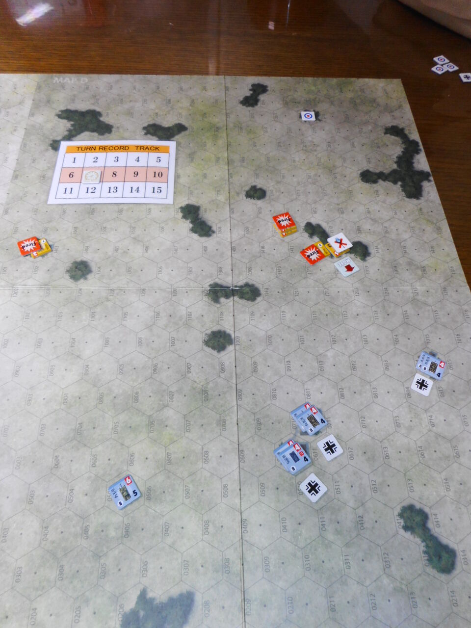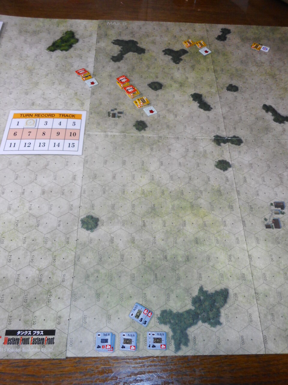 今回はドイツ軍は、占領に1ターン分、余計に掛かるものの、敵から距離が取れ、より安全なマップ南端付近にセットアップをします。