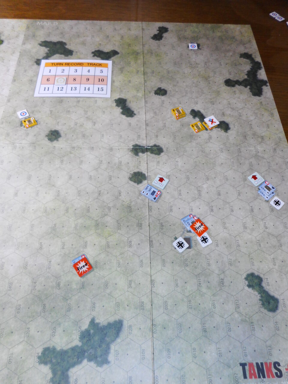 続くドイツ軍ターン、パンターがアキリーズを狙うも、地形効果もあり当たらず。お互いにどちらが先に当てるか、緊迫した中距離戦に。この間にドイツ軍主隊は建物に到着し、これを確保します。さらに前進射撃で近距離にいたクロムウェルを撃破し、これでVPはドイツ軍10点:イギリス軍9点と逆転します。