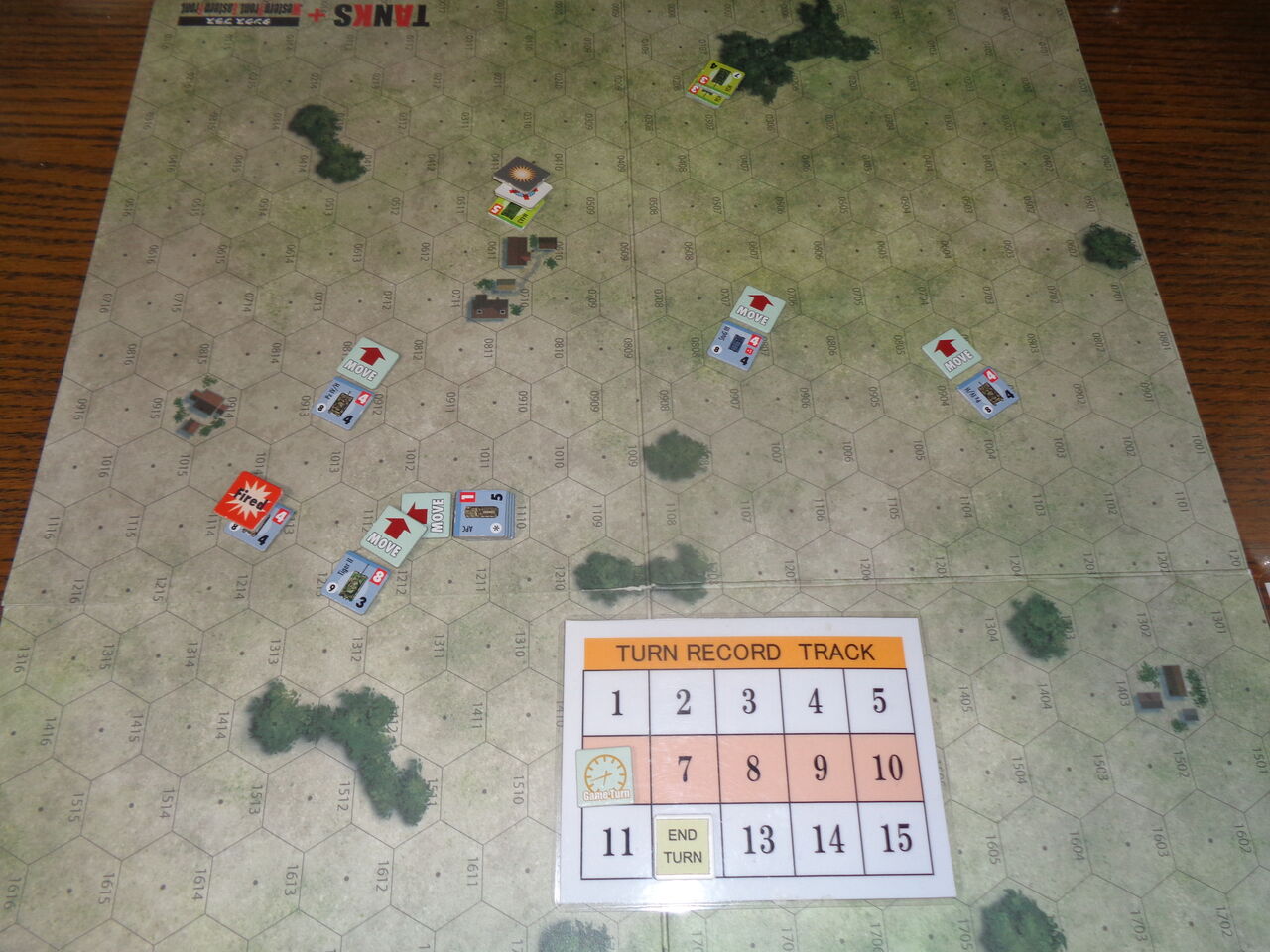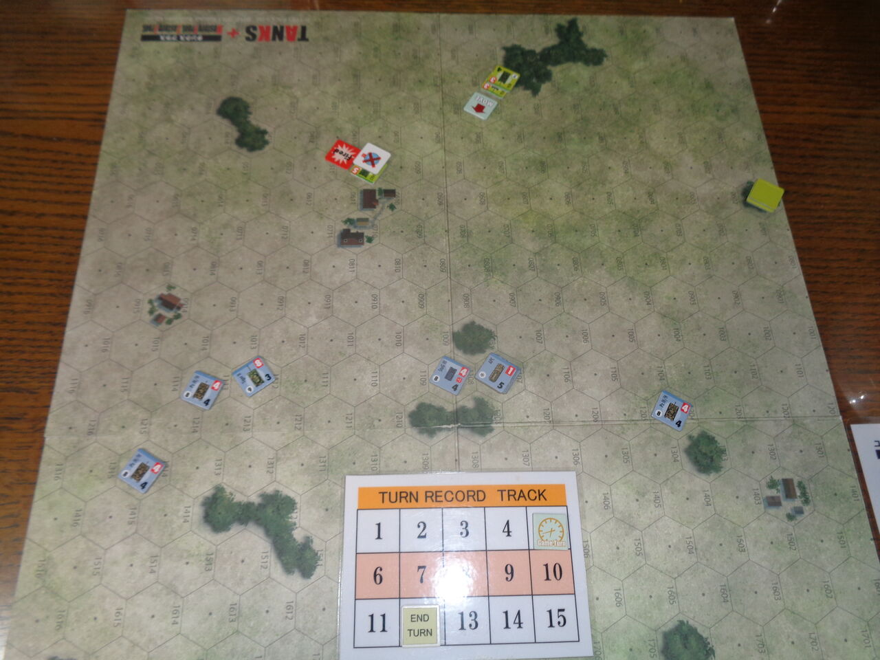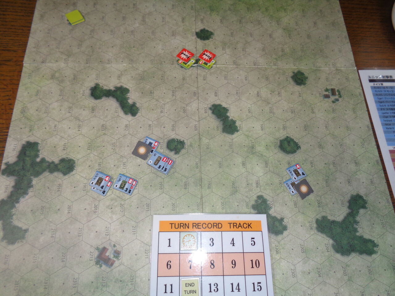 第4ターン、先頭を行くⅣ号が西端の対戦車砲を発見!TigerⅡと残りの4号が全力で展開し、前進射撃を浴びせます。こちらもdrに恵まれ、前進射撃の修整にもかかわらず、命中。対戦車砲が火を吹く前に、2台とも撃破してしまいます。