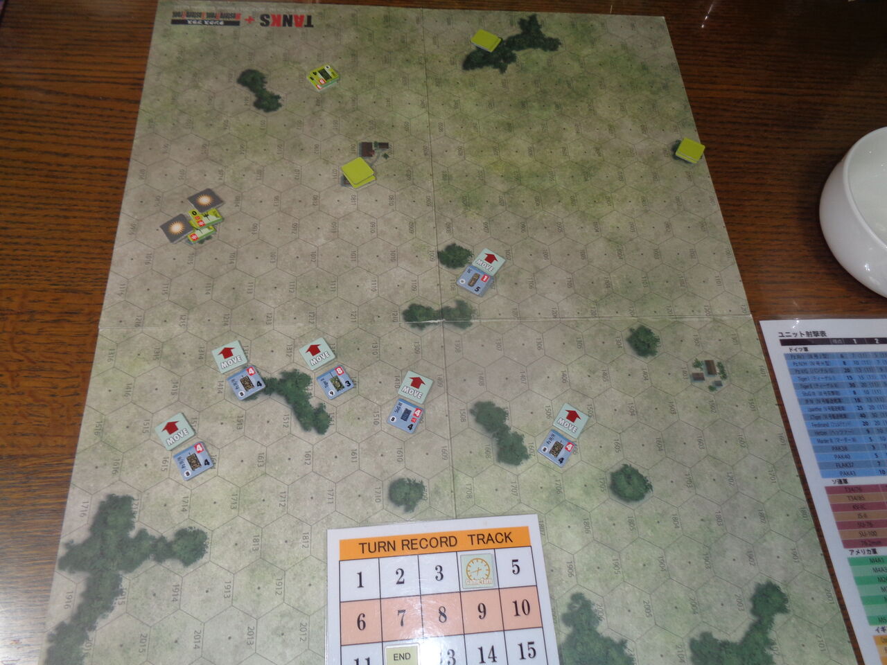 第1ターン、時間がないドイツ軍は、とりあえず、優秀な射撃力を生かせるように、主力を東寄りに北端から突入させ、一部を偵察用に西寄りに展開します。アメリカ軍は、時間稼ぎのため、隠蔽状態を保ったまま、発砲せず。
