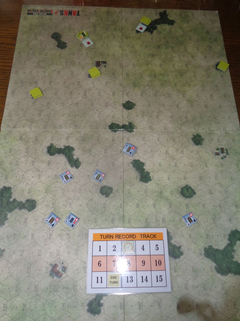 第5ターン、対戦車砲を狩ったTigerⅡとⅣ号チームは、全速で前進し、建物の背後に隠れるM4/A3を発見します。今度は、先にM4が発砲し、Ⅳ号に2発の命中弾を出しますが、ああ、跳弾!3両のドイツ軍AFVの反撃を受け、M4/A3の1両が撃破され、1両が移動不能になります。この間に、突破を狙う右翼隊(2両のAFVと歩兵搭載のハーフトラック)は、粛々と前進をしてきます。