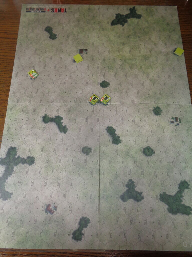 アメリカ軍は、必ず、通過する(または側面攻撃できる)中央の森林に、M10駆逐戦車を配置します。対戦車砲は、西または東の森林に配置し、残りのダミーは中央後方の建物か、上記のいずれかの森林に配置します。初めのセットアップは、以下のとおりです。