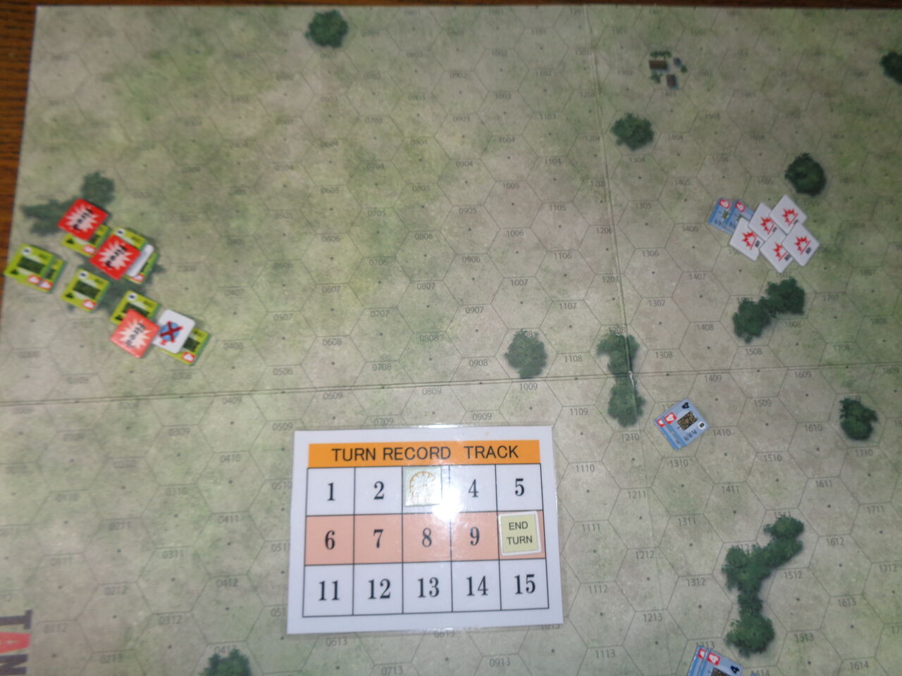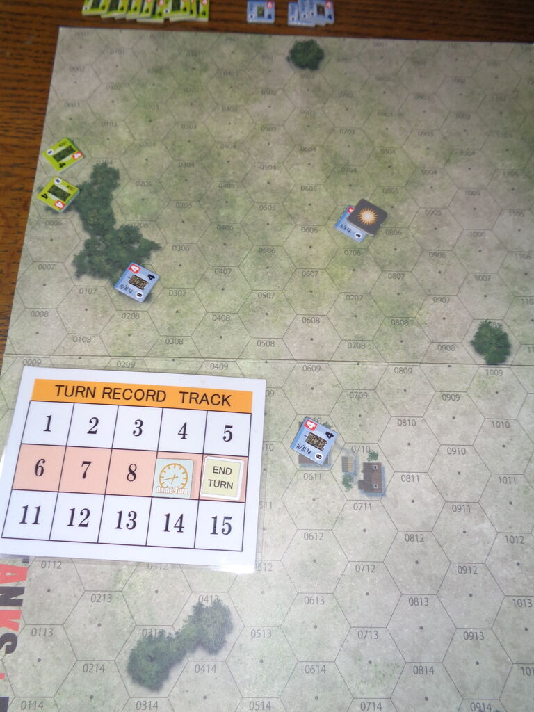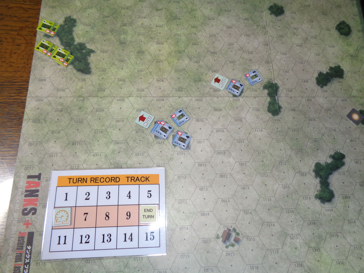 第8ターン、ドイツ軍は、一気呵成に左翼の4輛を突進させます。森の中の近距離戦で、Ⅳ号とM4A1の各1輛が差し違えます。これで、AFV数は5:5と同数に。