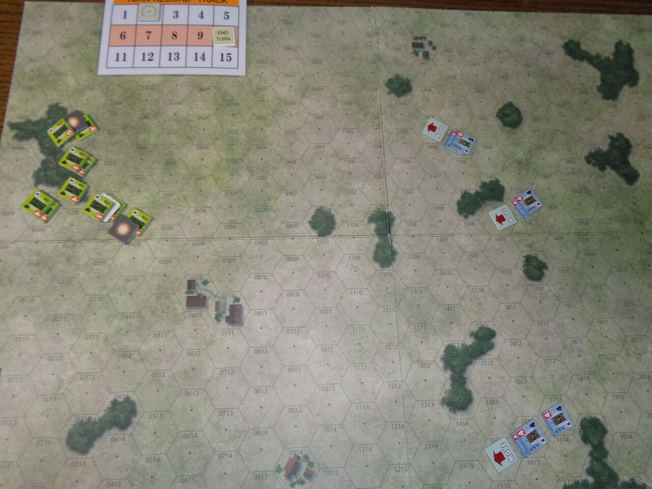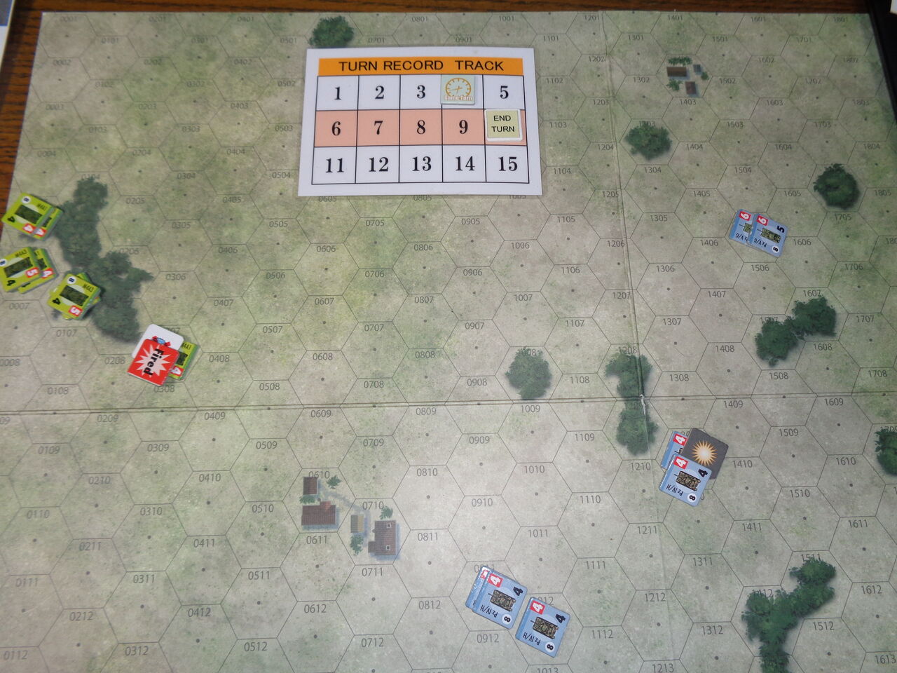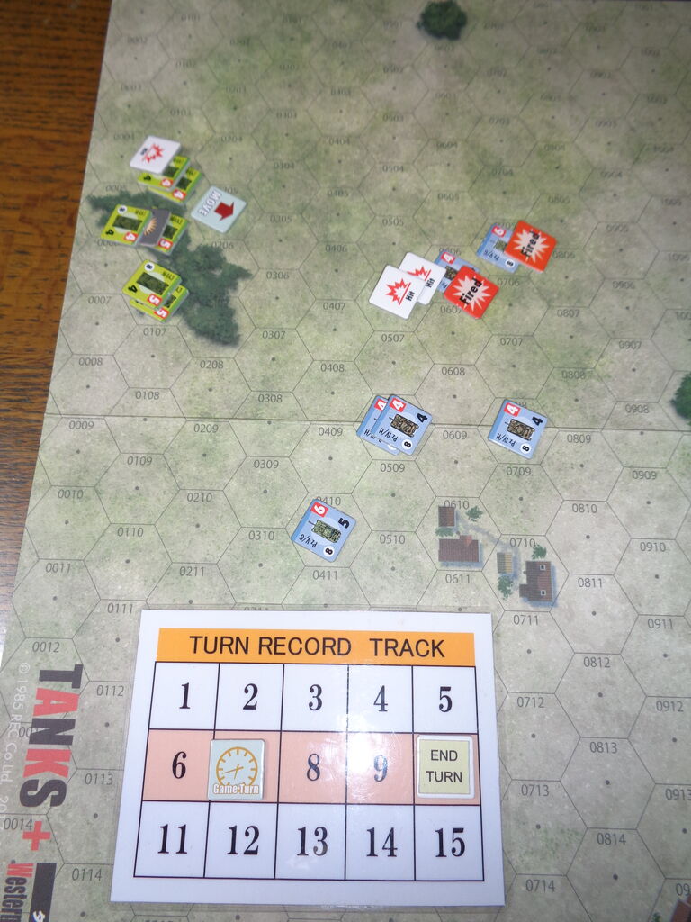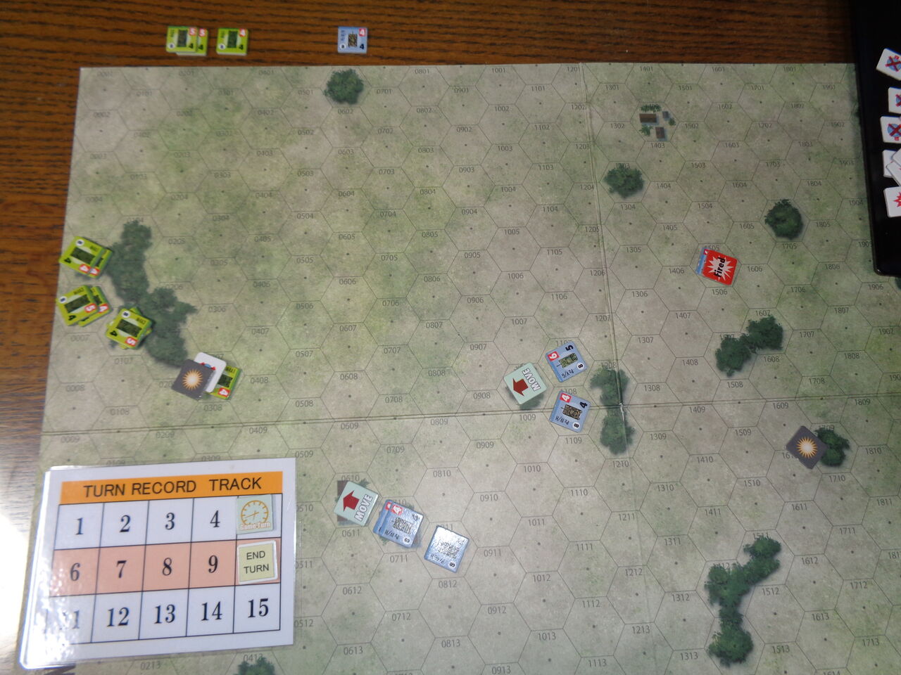 第9ターン、ドイツ軍は空からの脅威を認識しながらも、目の前の敵に集中します。2輛の準備射撃により、M4A1が昇天。これで、AFV数は2:3と、初めてドイツ軍有利に。