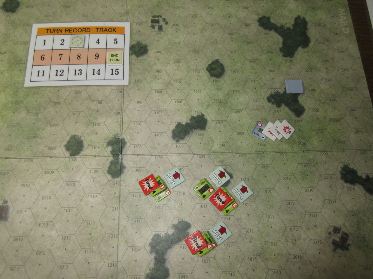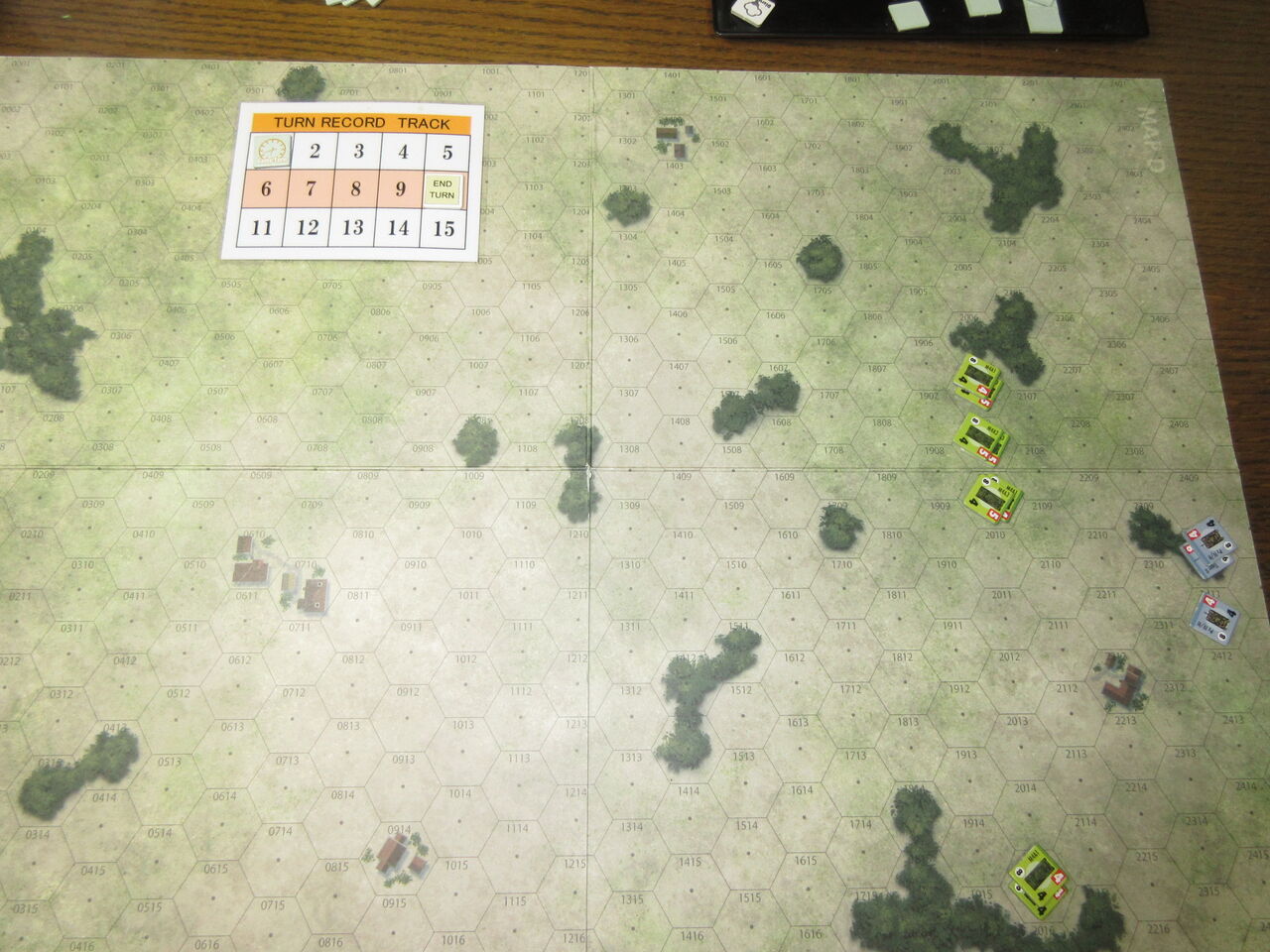 第1ターン、アメリカ軍は、敵の前進路である中央に向けて、全車輌を前進させます。