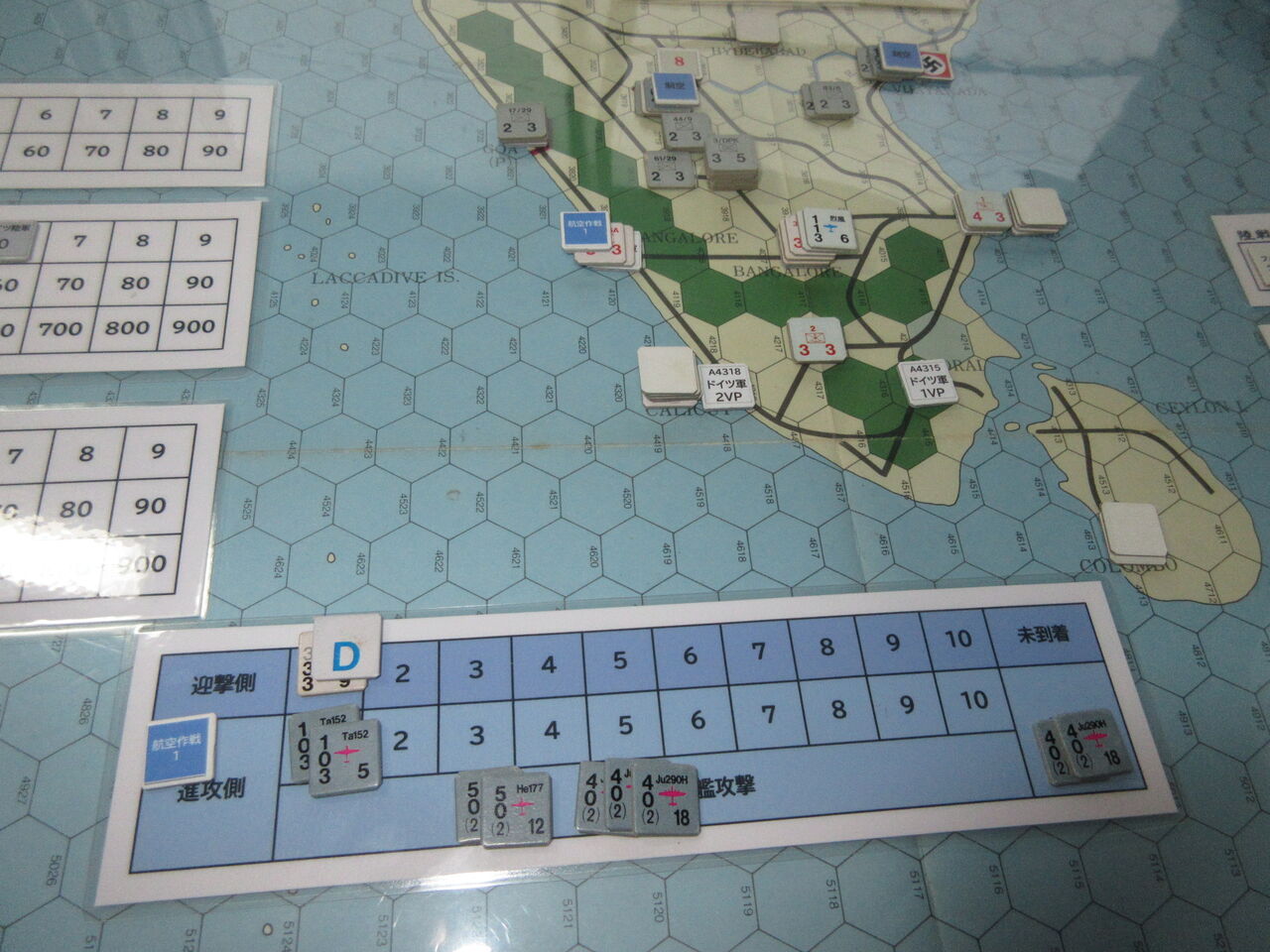 補給フェイズに全装甲部隊を回復させると、戦果のなかった第1航空作戦の後、一か八かのCULICUT強襲を実施します。ここには増援の日本軍1個歩兵師団しかおらず、ほぼ全力を投入したドイツ装甲軍団の攻撃は5:1。DEの確率は1/2だったのですが、見事に成功!これによって、守備隊の敵1個師団及び駐機していた烈風3ユニット、大洋1ユニット、第16軍の補給基地が全滅します。この戦果は大きく、MADRASを除く、全ての日本軍の陸上ユニットが補給切れに。