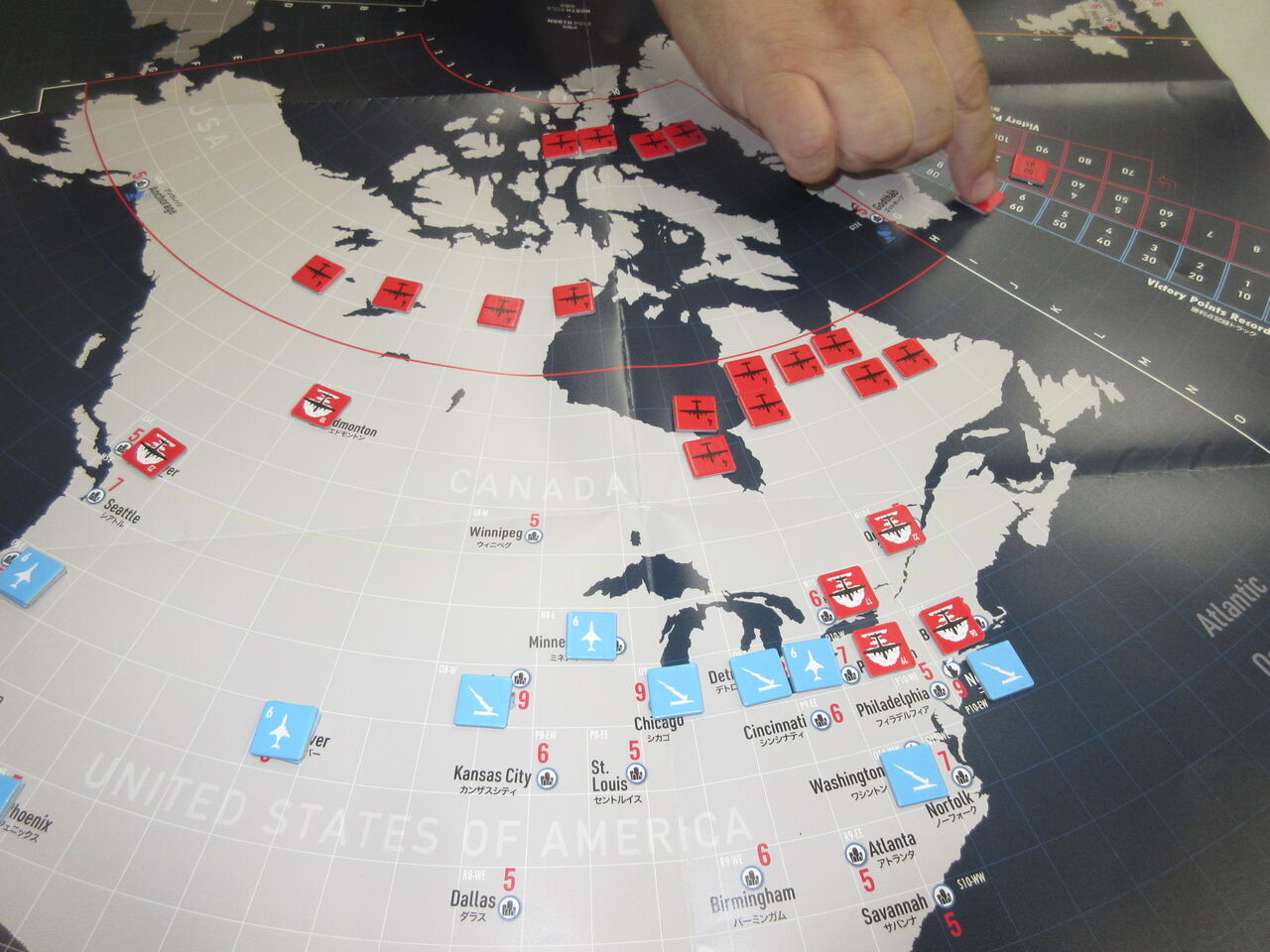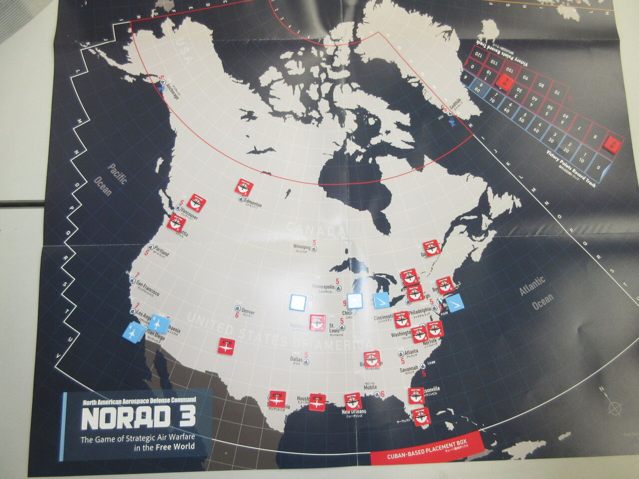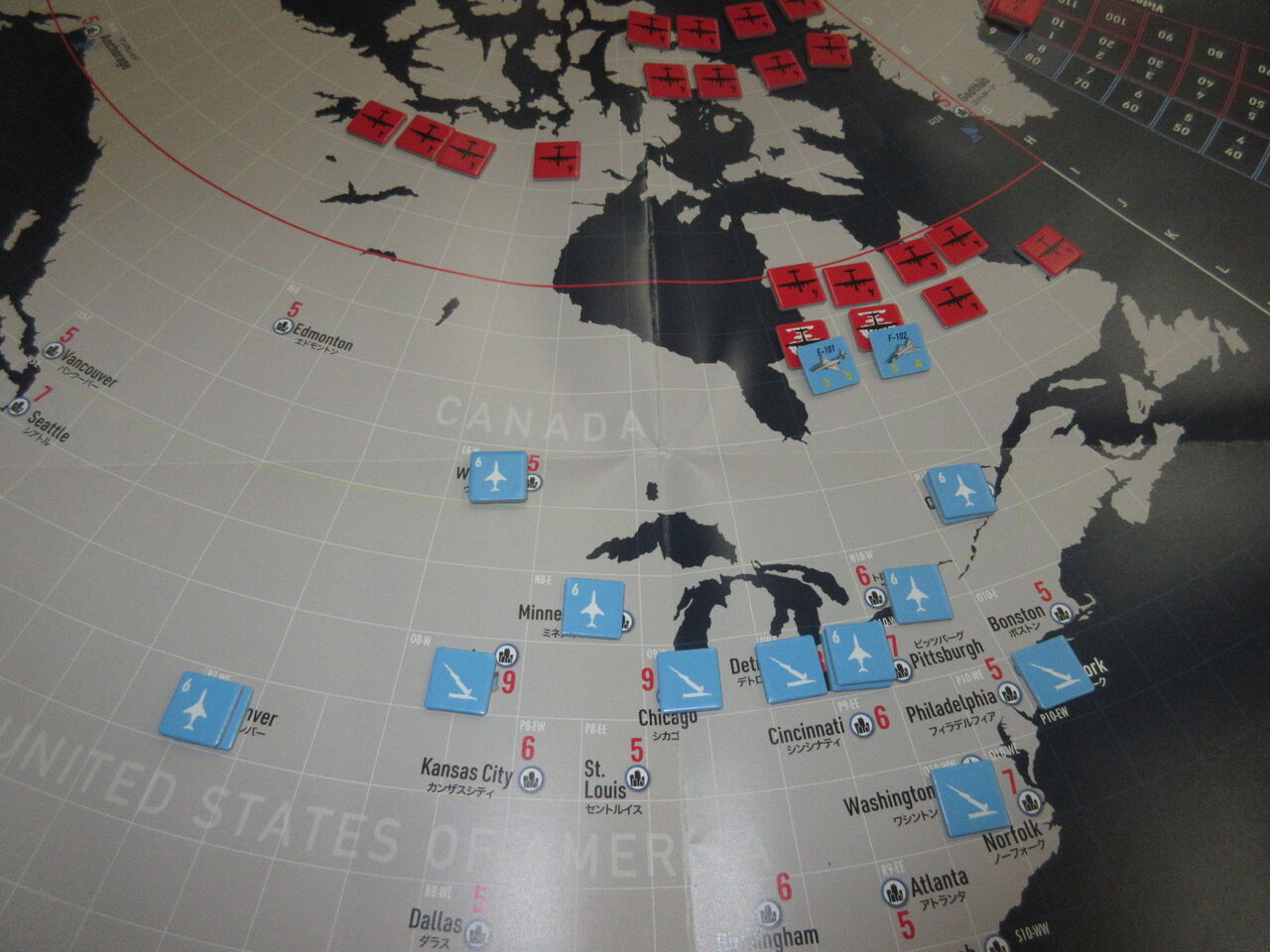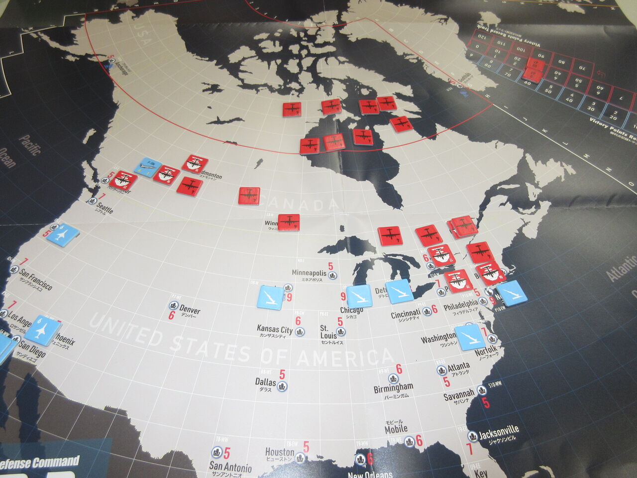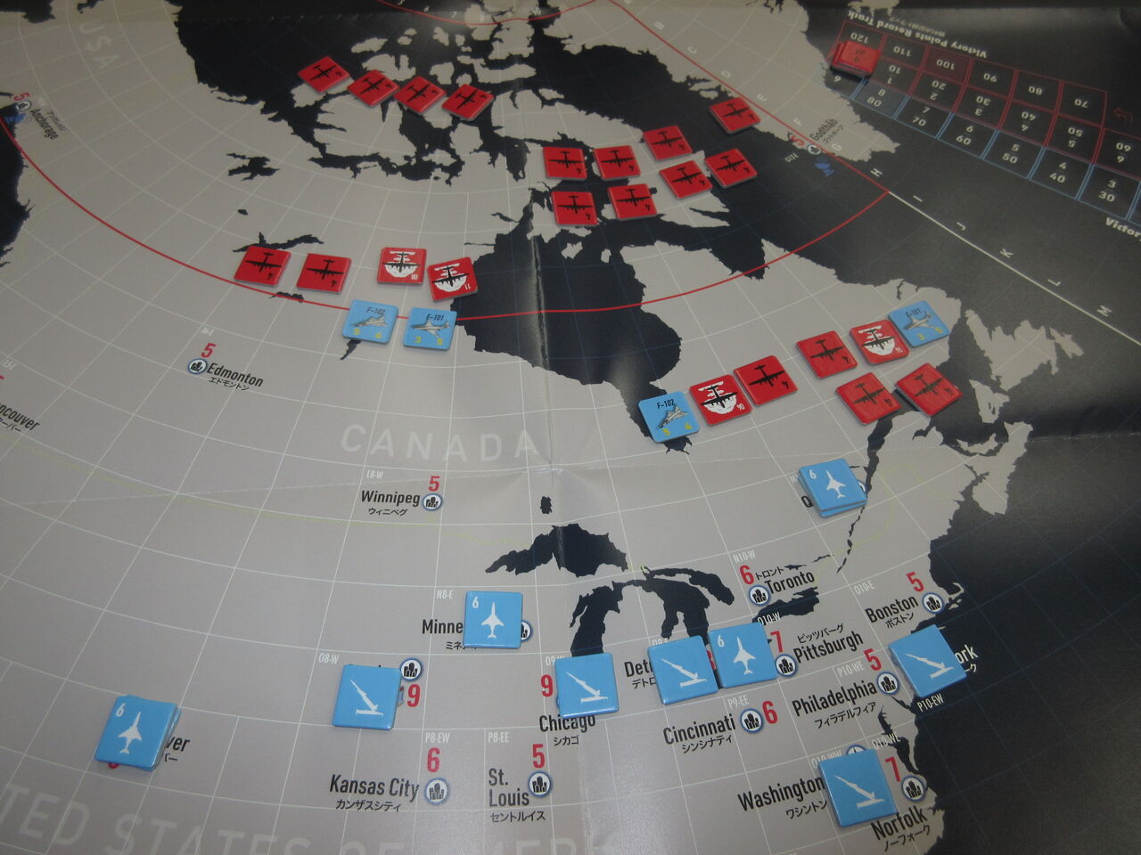 手順としては、ソ連軍の移動・爆撃-アメリカ軍戦闘機の迎撃のみ。ソ連軍は4移動力を持ち、北極圏から飛来します。アメリカの各都市には重要度に応じてVPがあり(ニューヨークやワシントンは9VP、デトロイトやサンディエゴは8VP)、到着できれば自動で爆撃が成功します。この時、SAMがある場合は、自動命中の迎撃ができます。