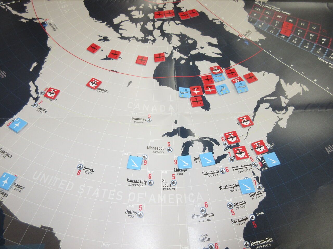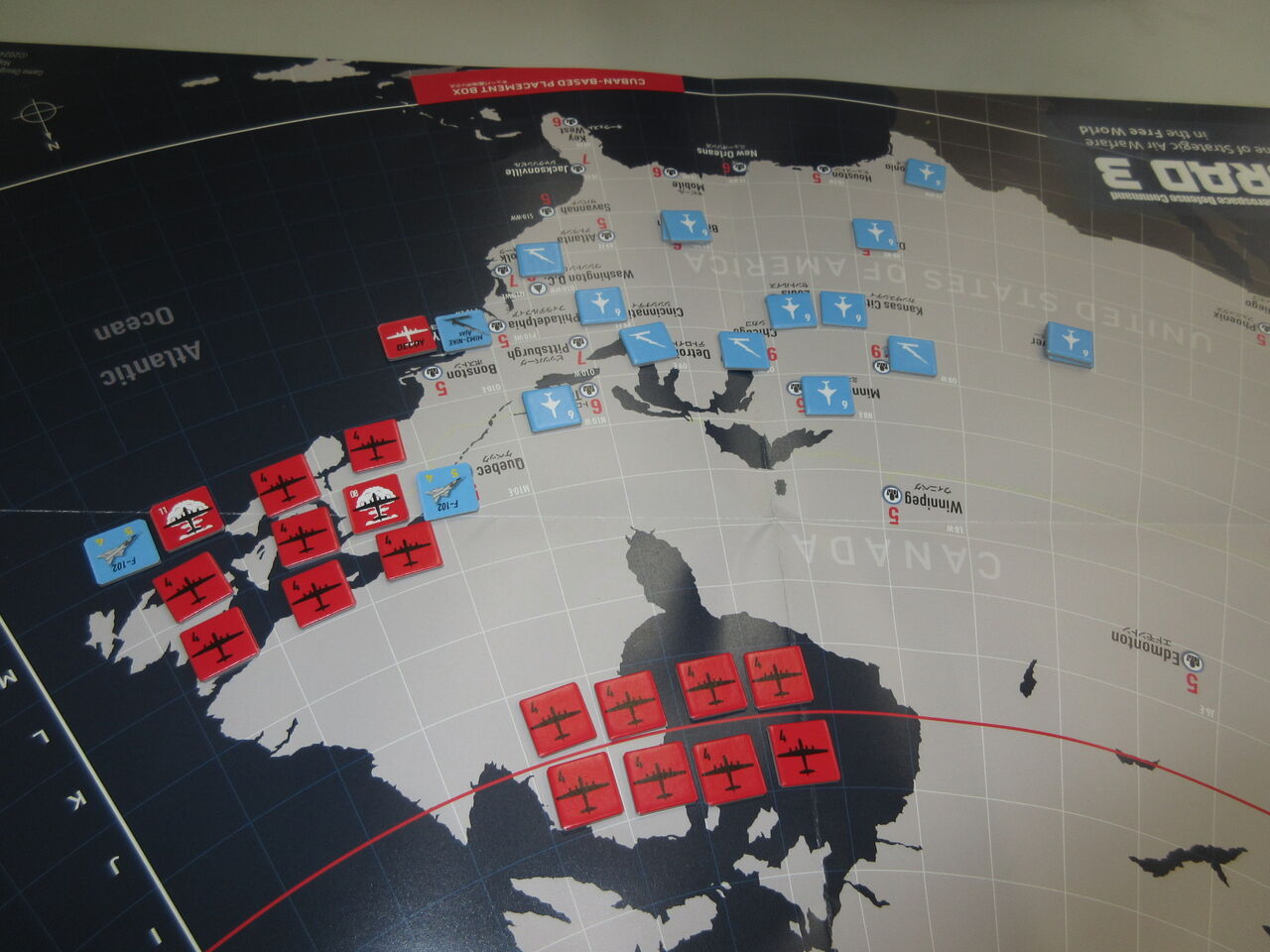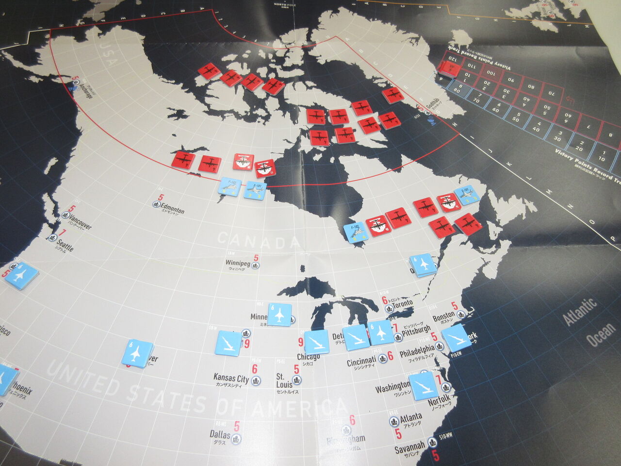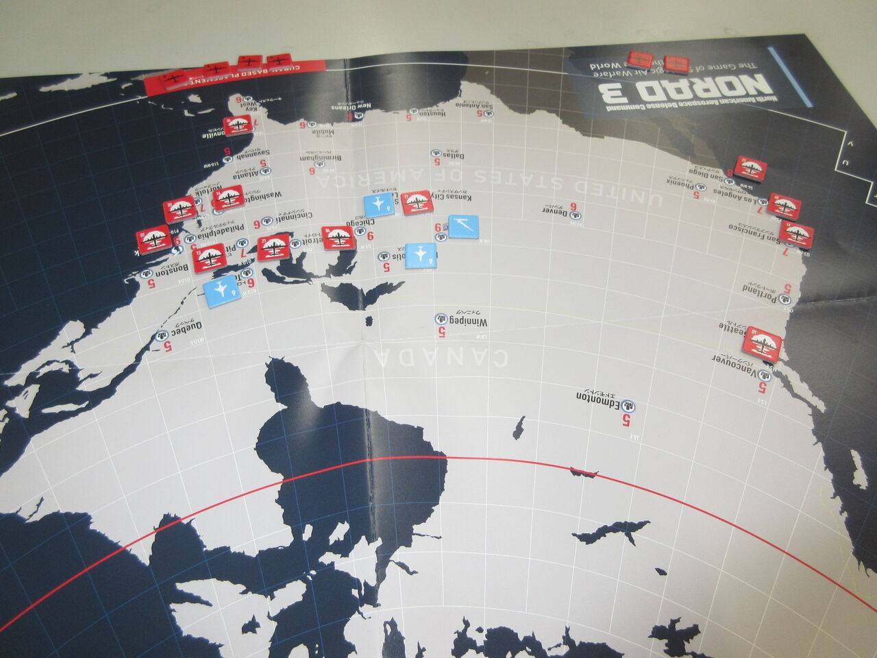 手順としては、ソ連軍の移動・爆撃-アメリカ軍戦闘機の迎撃のみ。ソ連軍は4移動力を持ち、北極圏から飛来します。アメリカの各都市には重要度に応じてVPがあり(ニューヨークやワシントンは9VP、デトロイトやサンディエゴは8VP)、到着できれば自動で爆撃が成功します。この時、SAMがある場合は、自動命中の迎撃ができます。