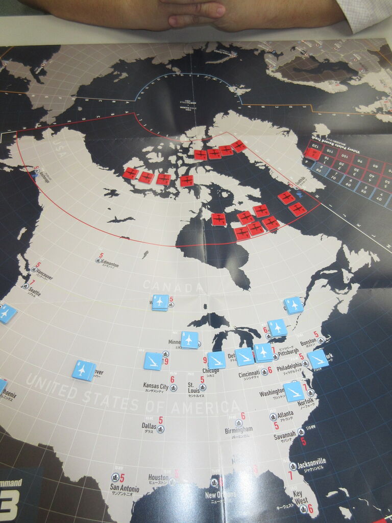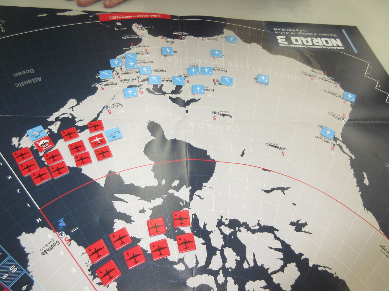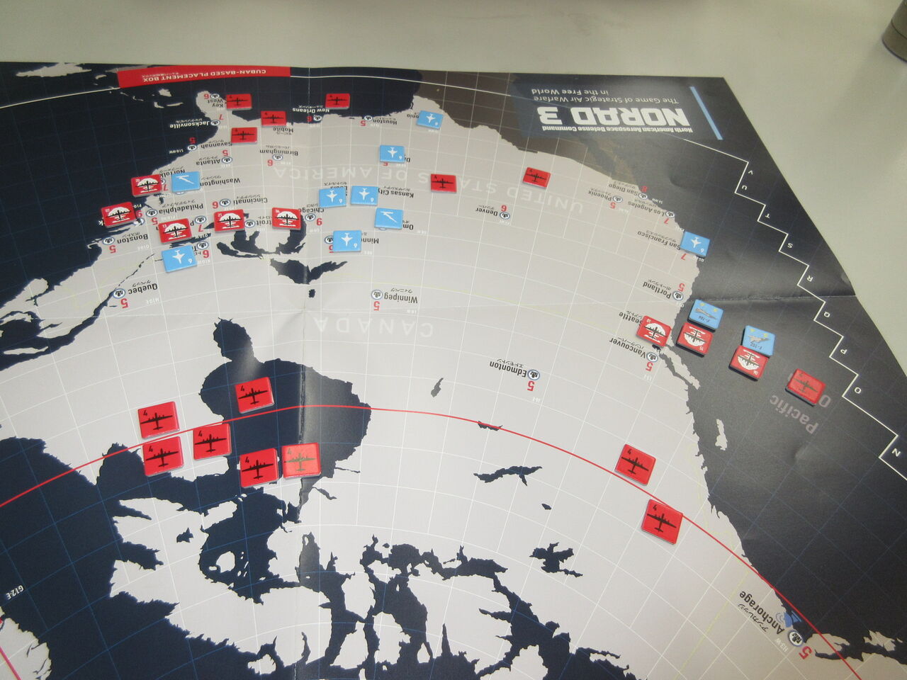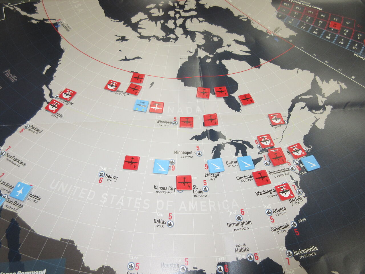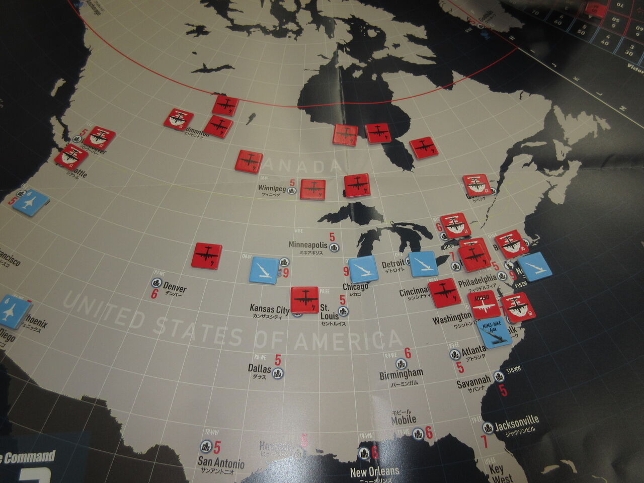 手順としては、ソ連軍の移動・爆撃-アメリカ軍戦闘機の迎撃のみ。ソ連軍は4移動力を持ち、北極圏から飛来します。アメリカの各都市には重要度に応じてVPがあり(ニューヨークやワシントンは9VP、デトロイトやサンディエゴは8VP)、到着できれば自動で爆撃が成功します。この時、SAMがある場合は、自動命中の迎撃ができます。