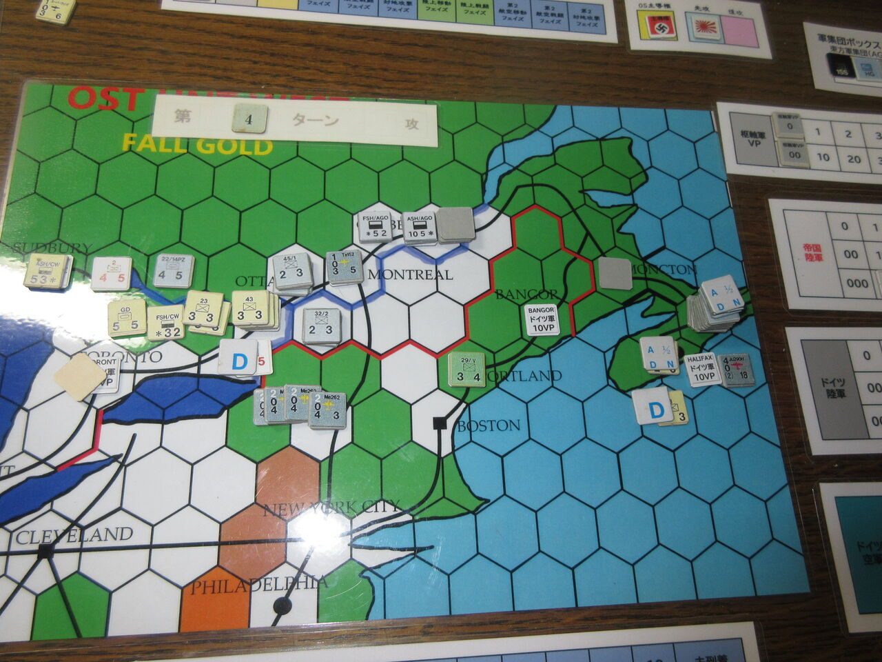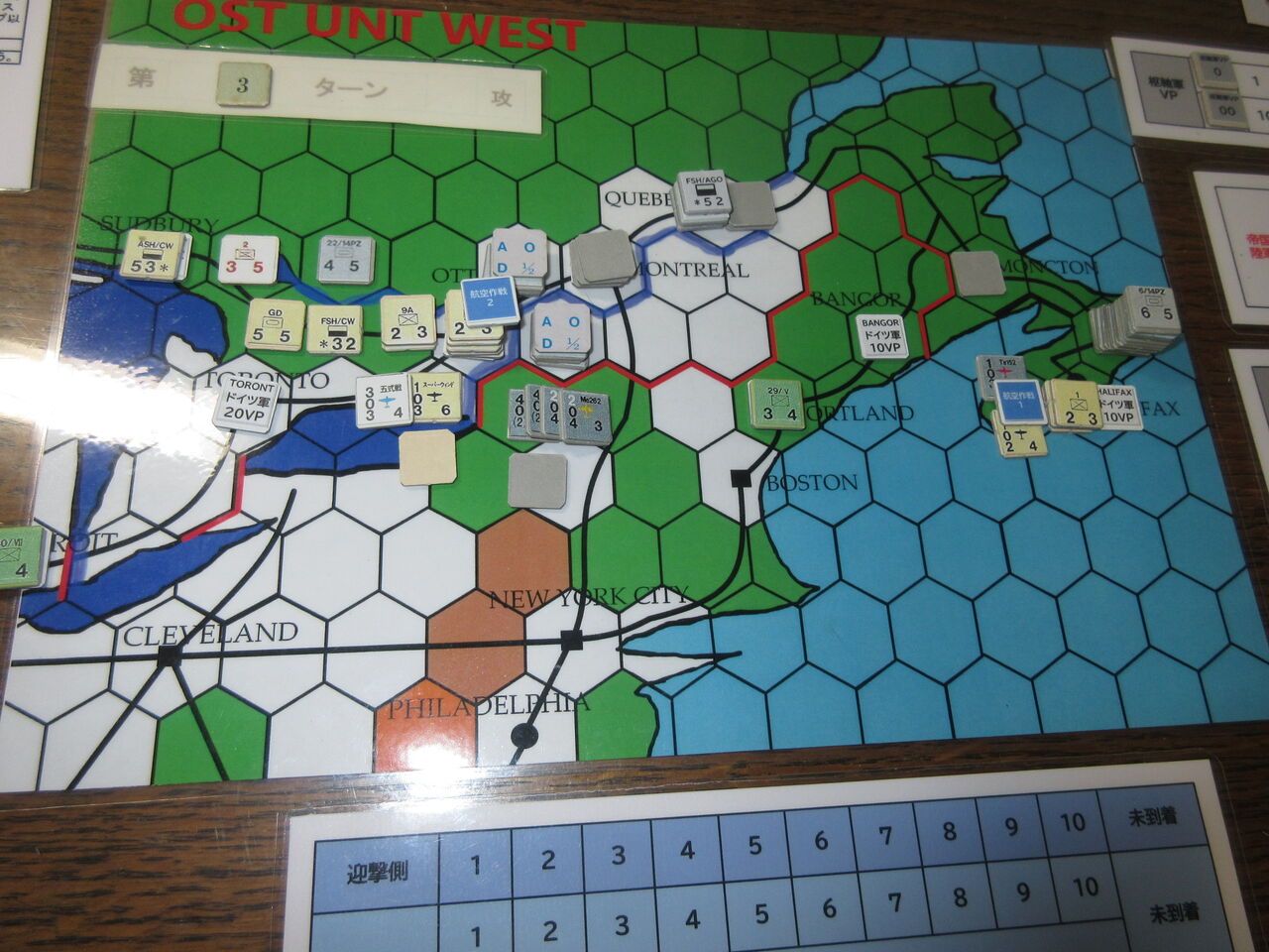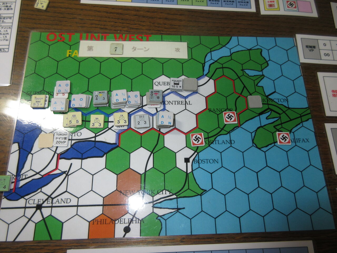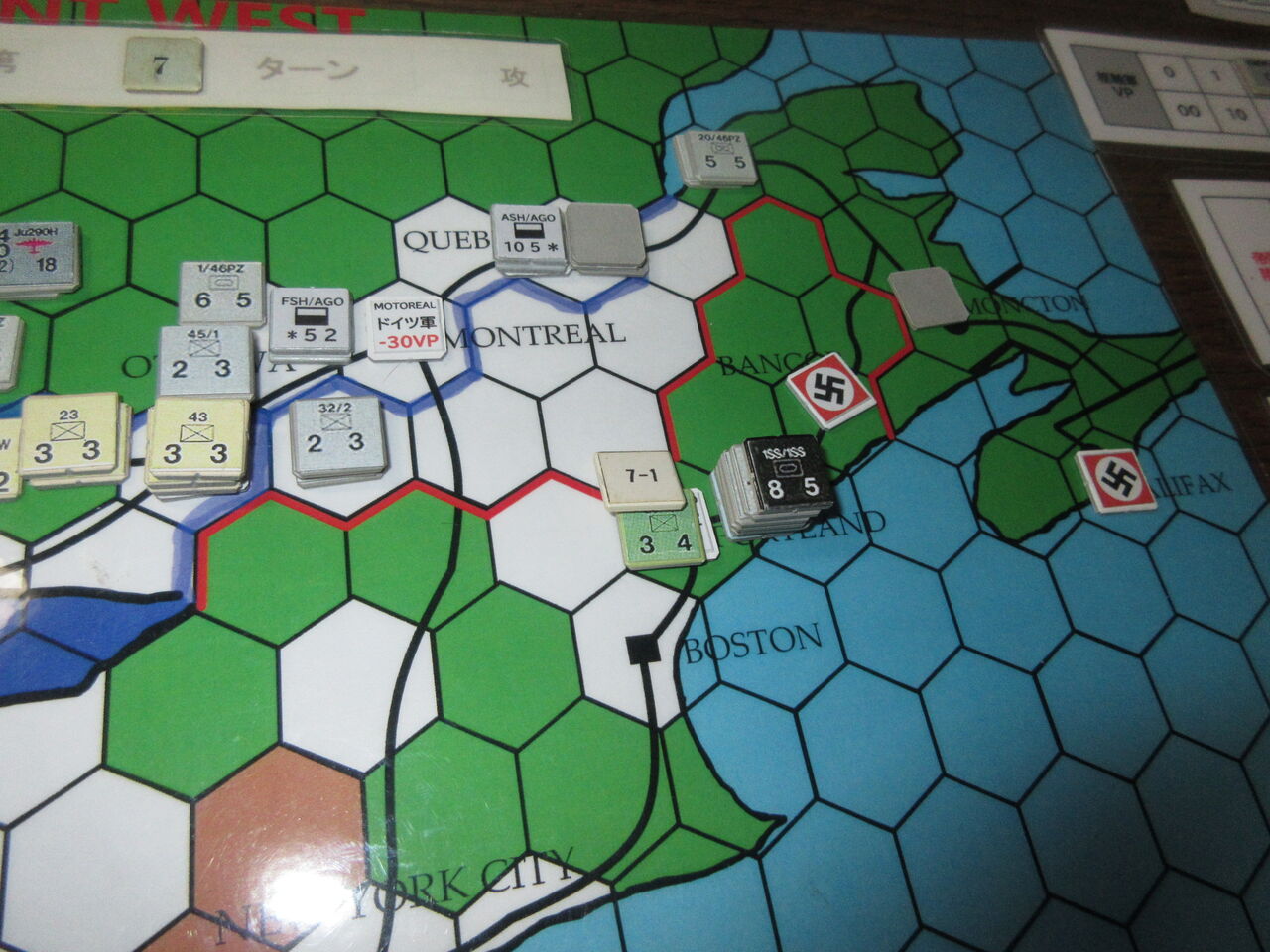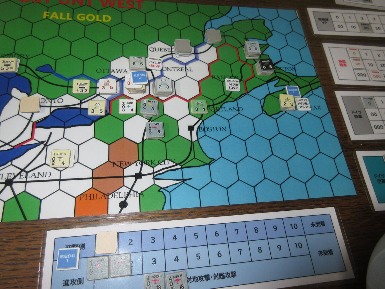 基本的な作戦としては、ドイツ軍が全力を持ってHALIFAXを確保し、アメリカ国内に突入し、PORTLANDまでを占領します。その後、OTTAWAで機動包囲を仕掛け、敵を分散した上で、陸上兵力の殲滅と要所の確保を狙います。ドイツ軍には補給も充分にあり、時間さえあれば、DETROITの占領も夢ではありませんが、使用できるターンはわずかに7。空軍の爆撃が成功し、陸軍の攻撃でDEが続かない限り、100VPの勝利条件はかなり厳しいでしょう。