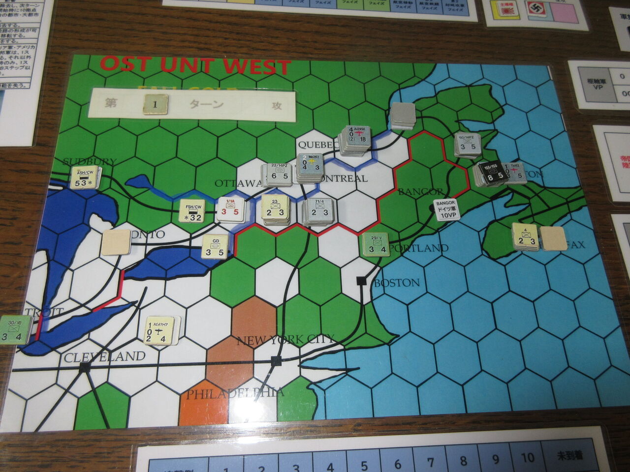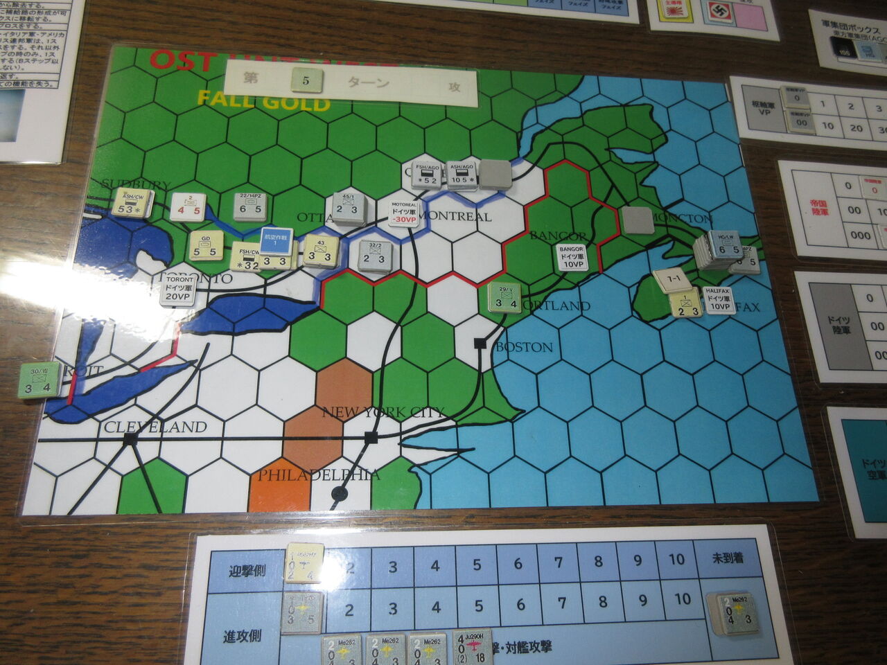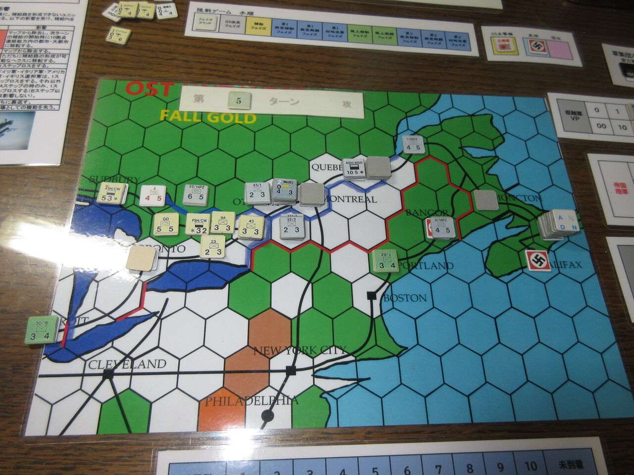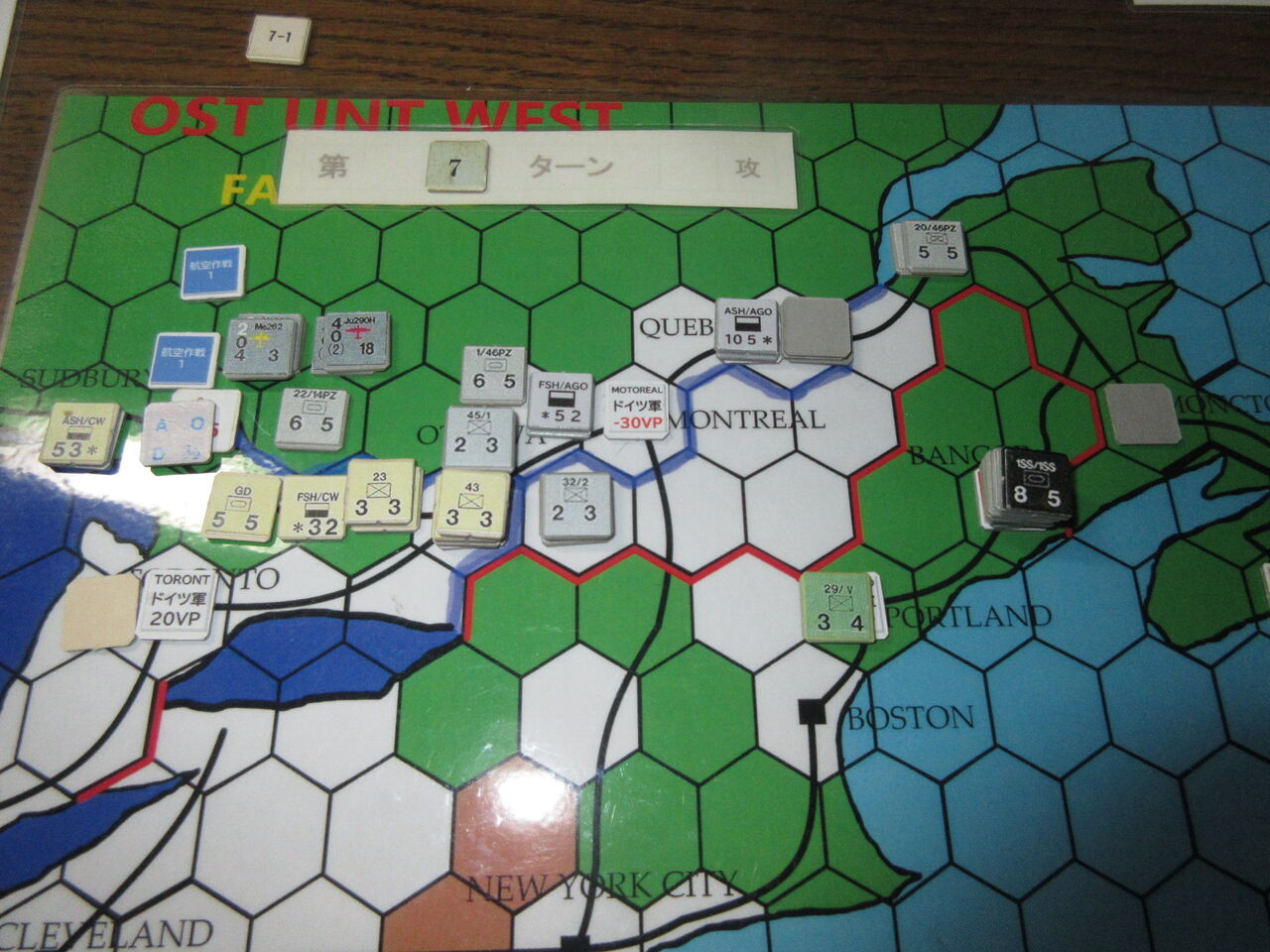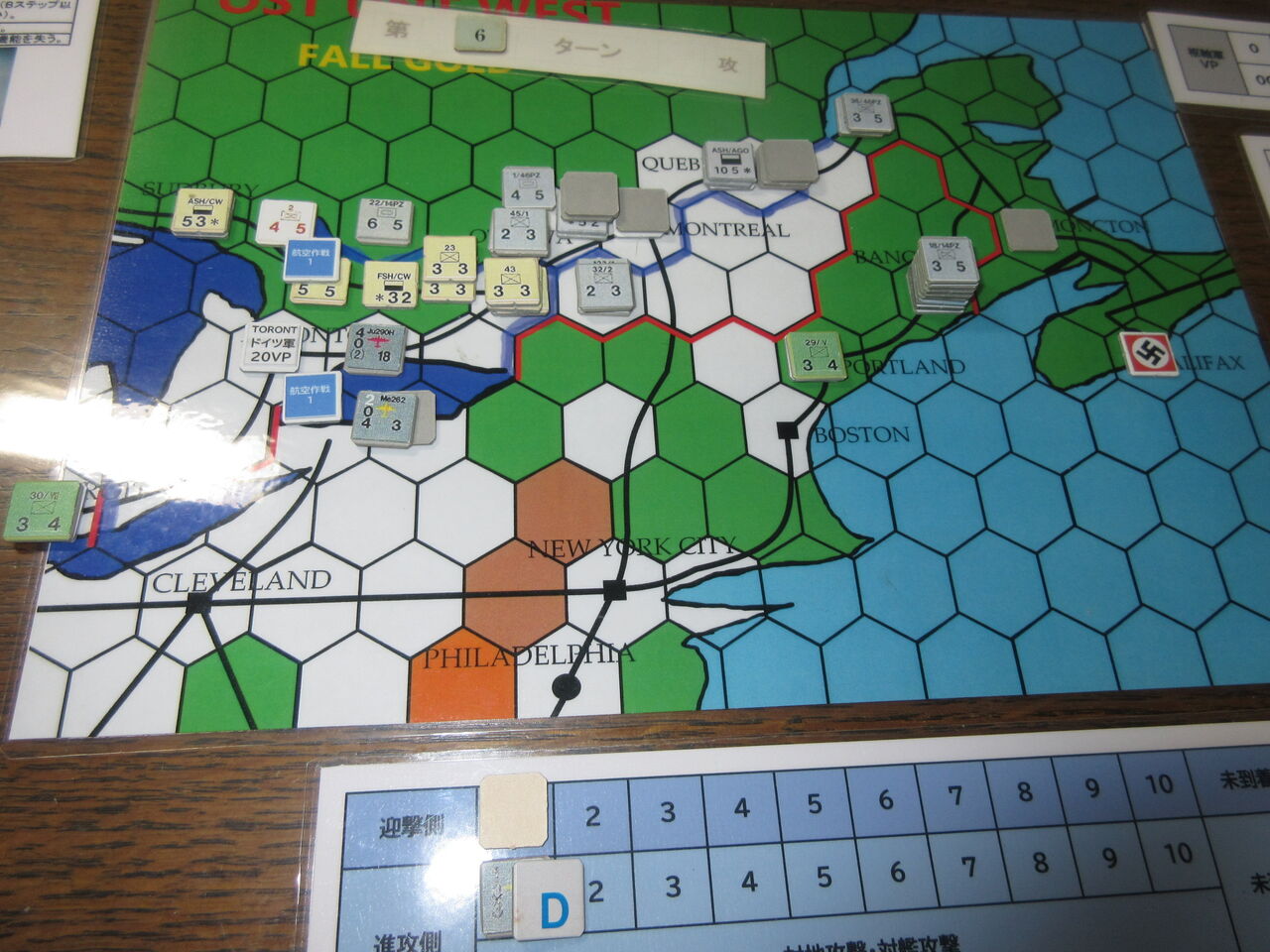 基本的な作戦としては、ドイツ軍が全力を持ってHALIFAXを確保し、アメリカ国内に突入し、PORTLANDまでを占領します。その後、OTTAWAで機動包囲を仕掛け、敵を分散した上で、陸上兵力の殲滅と要所の確保を狙います。ドイツ軍には補給も充分にあり、時間さえあれば、DETROITの占領も夢ではありませんが、使用できるターンはわずかに7。空軍の爆撃が成功し、陸軍の攻撃でDEが続かない限り、100VPの勝利条件はかなり厳しいでしょう。