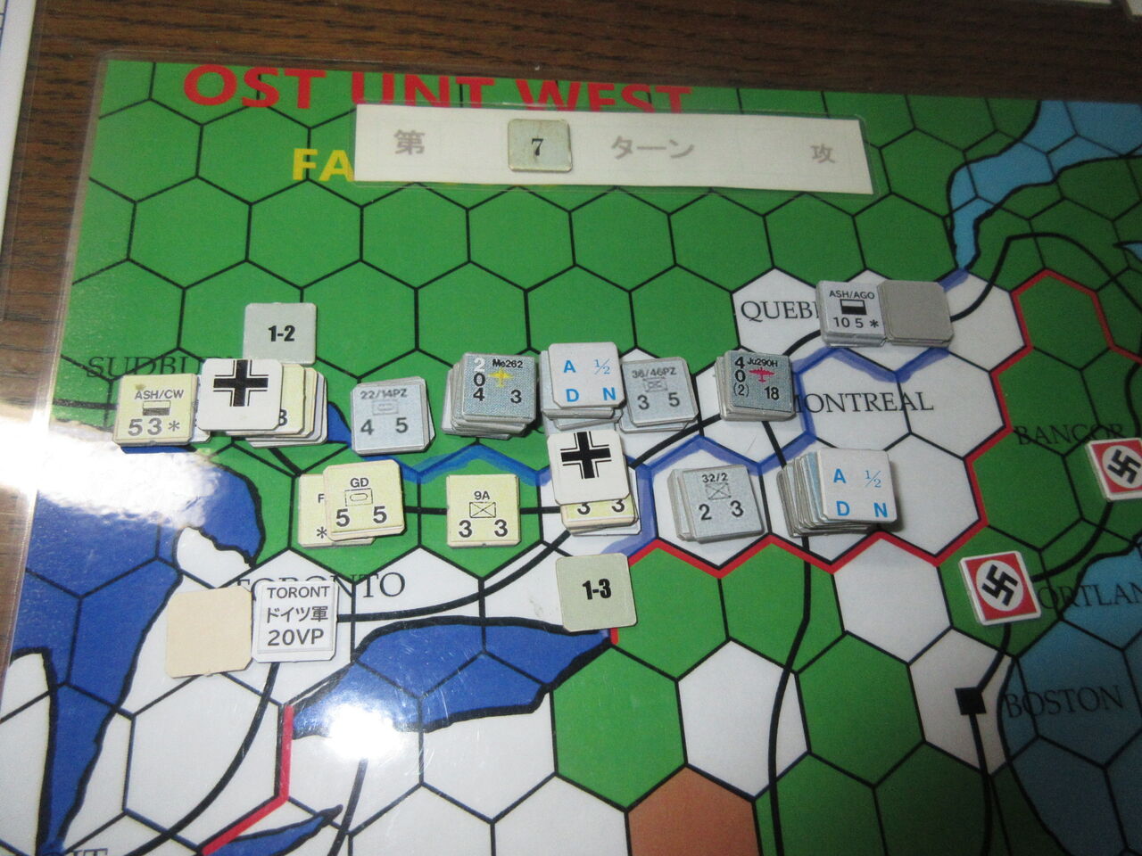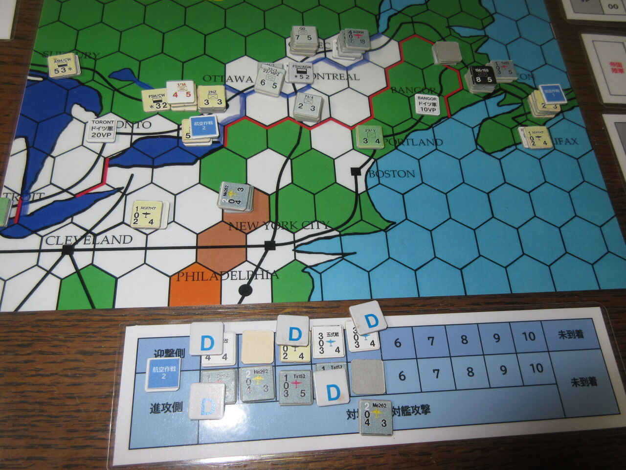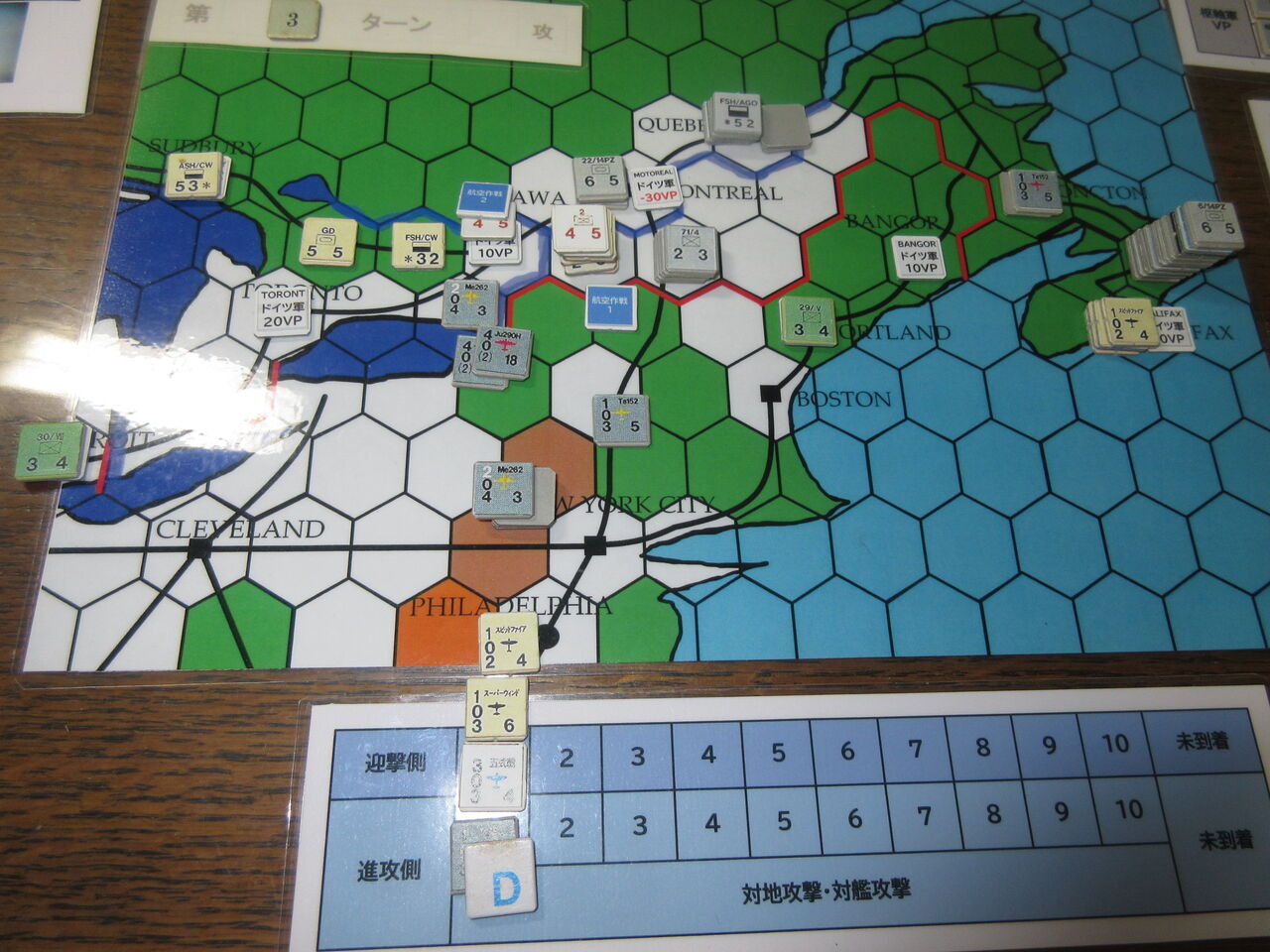 第3ターン、主導権は変わらず、日英連合軍に。第1航空作戦で、独仏枢軸軍は、MONTREAL近郊の敵機動歩兵師団に攻撃をかけます。頼りのMe262の4編隊が未到着という、アクシデントはあったものの、残りの1ユニットとJu290Hが到着し、見事に3ヒットを与えます。