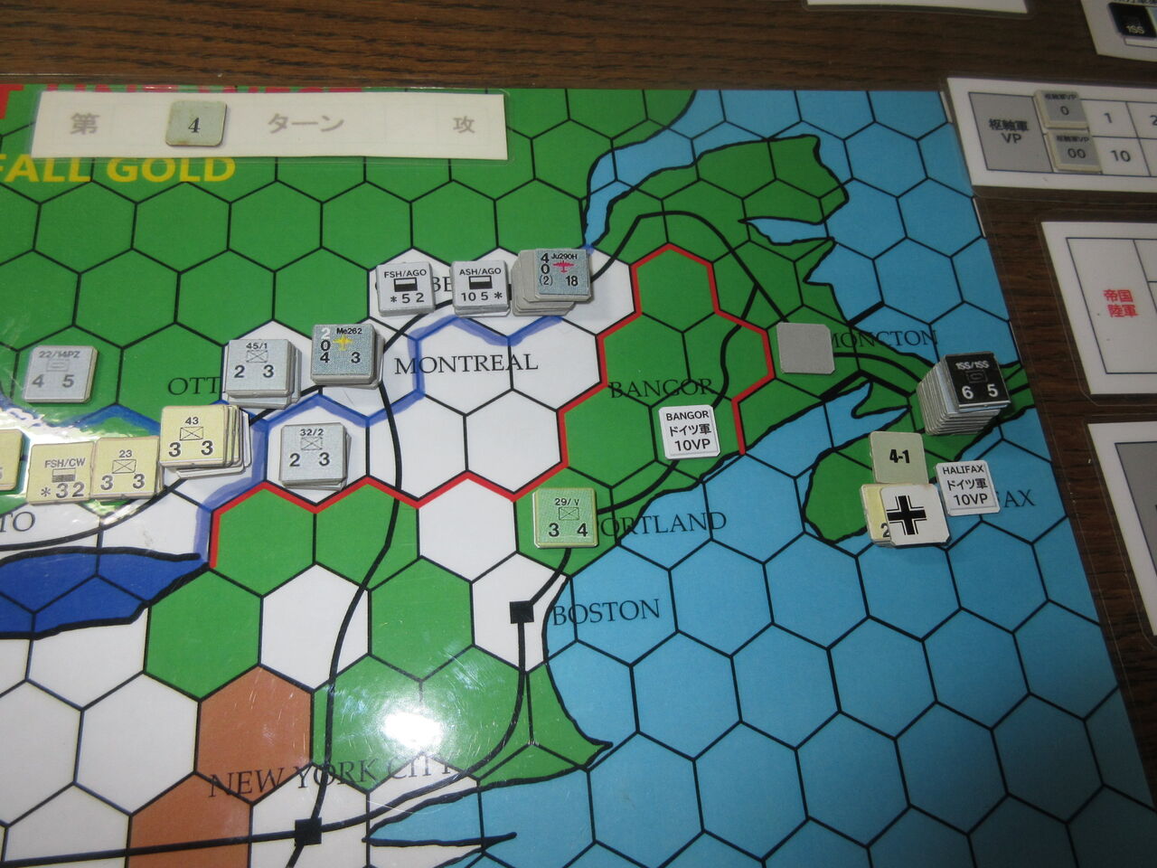 第4ターン、ここで、やっと主導権は独仏枢軸軍に。完全に制空権を得たルフトヴァッフェは、一方的にHALIFAXの混成師団に1ヒットを与え、MONTREAL近郊の機動歩兵師団に2ヒットを加えます。唯一の迎撃スピットファイアは、1を出して消耗するというていたらく。
