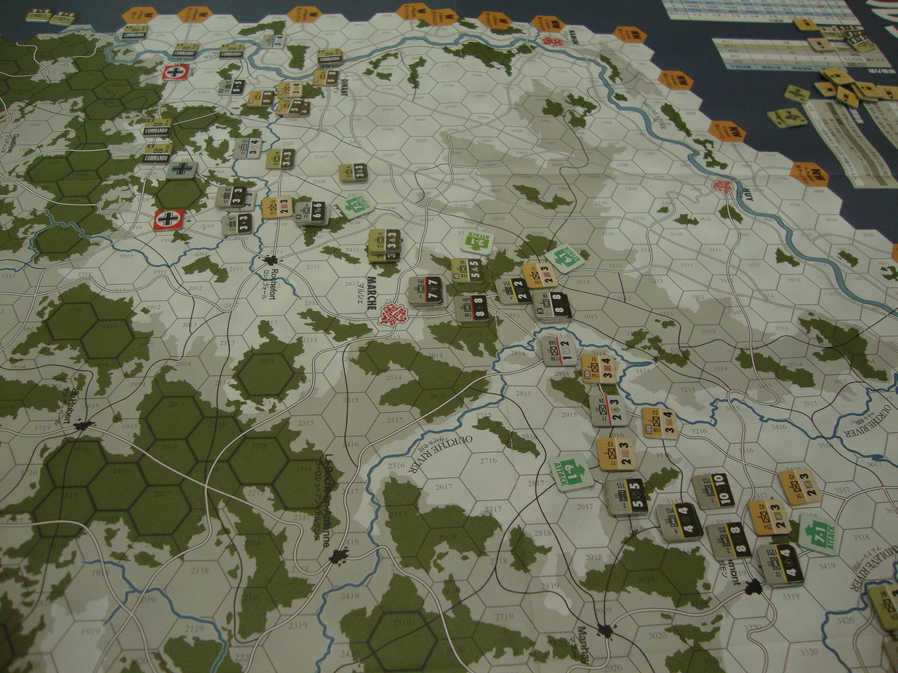 史実ではもっとも薄かった中央に、第106歩兵師団に加え、機甲騎兵と第28師団の2個連隊(境界線域)を投入する。これにより、装甲の早期中央突破は物理的に不可能になる。が、南部はフリーパスに近く、北と中央でも消耗戦略が可能なため、第3ターン以降に連合軍はかなり厳しくなるが、それを覚悟でスコルツィーニ部隊の封鎖と敵主力の大突破を防ぐ作戦である。