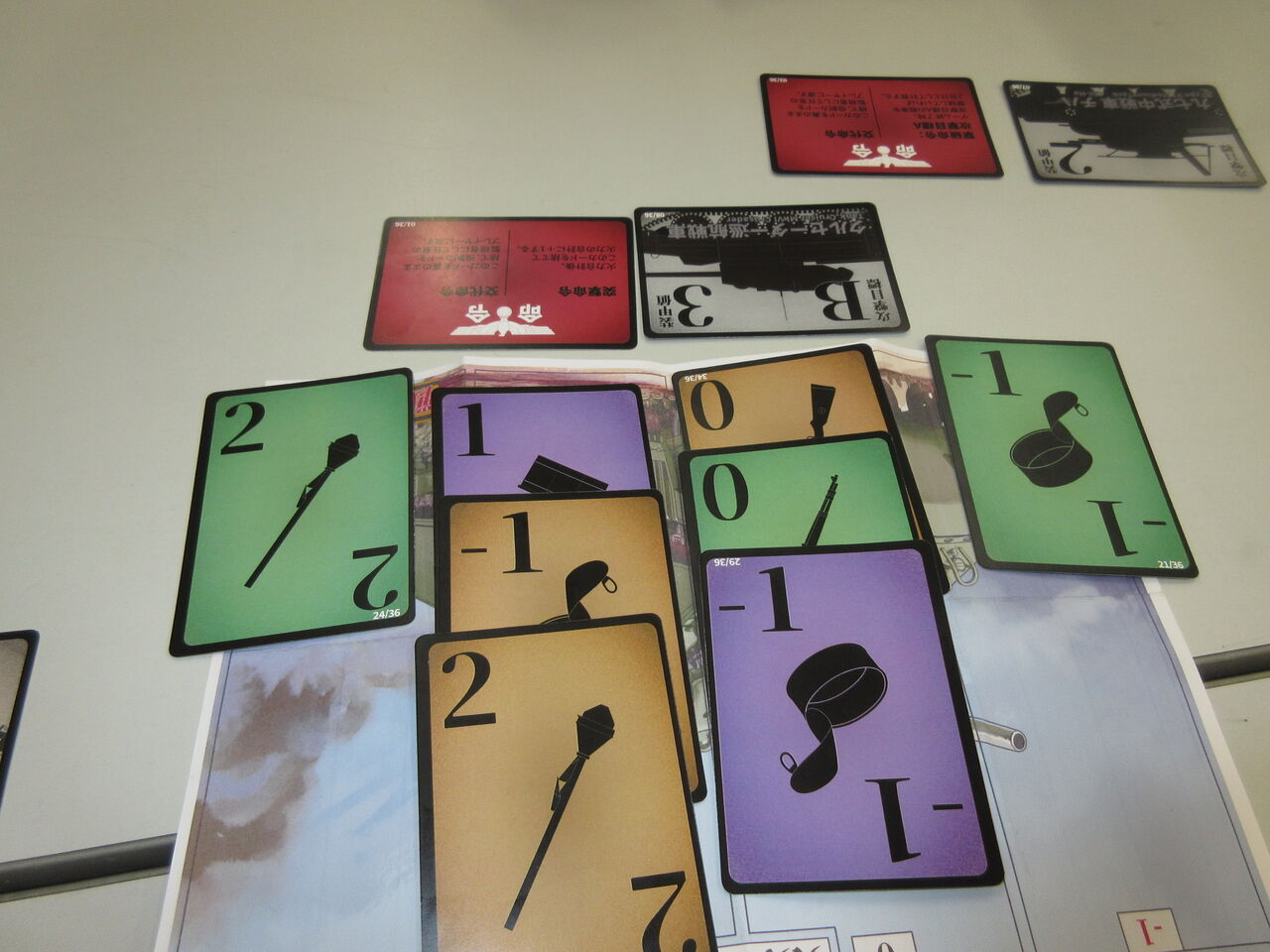 続いて、お手すきのエンジョウさん、ラインさんとゲムマで手に入れた「戦車撃破章」(URA)をプレイしました。各プレイヤーは4枚の攻撃カードを持っていて(-1、0、1、2)、順にブラインドで出していきます(実際のカードと異なる数値を宣言して、出してもよい)。カード枚数を見て、総合計が目標戦車の撃破値(2-6)を越えたと思ったら、攻撃を宣言。カードをオープンにして、達成できれば、撃破となります。最も多くの戦車を撃破したプレイヤーの勝利になります(同数ならば、より撃破値の高い戦車を破壊した方が勝ち)。
