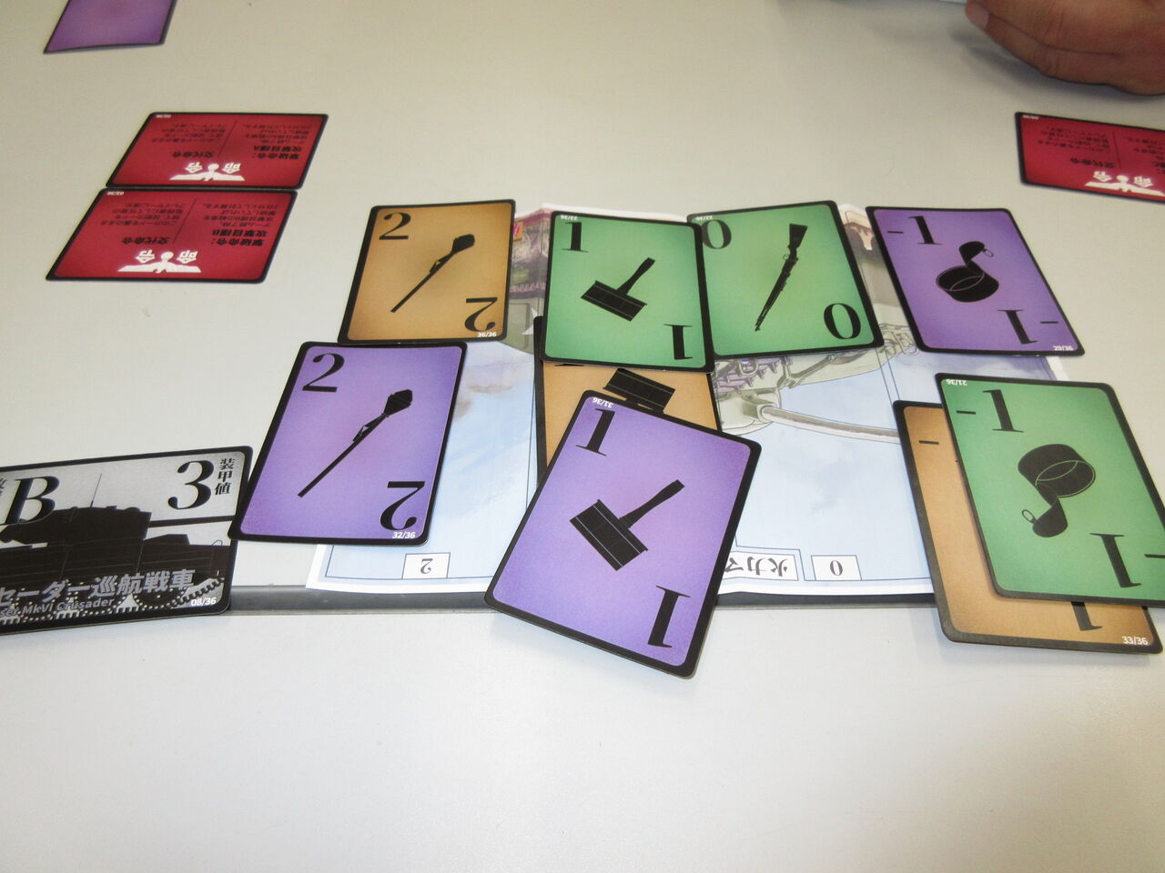 ボーナスの命令カード(撃破時または攻撃時の特典あり)を手に入れ、次のクルセーダー戦車も、なんなく、撃破。ここで、監視役だったラインさんが、ダウトを宣言し、場にある1枚をめくりましたが、ああ、本物!結果、ラインさんはダウトさえできない支援役になってしまいます(誰かが攻撃に失敗するまで、他のプレイヤーのアシストしかできない)。次のmitsuは、実は-1と0しか出していなかったので、まだ、撃破はギリギリ無理かと判断し、攻撃はパス。と、思い切りのいいエンジョウさんは、攻撃を宣言し、またも成功!