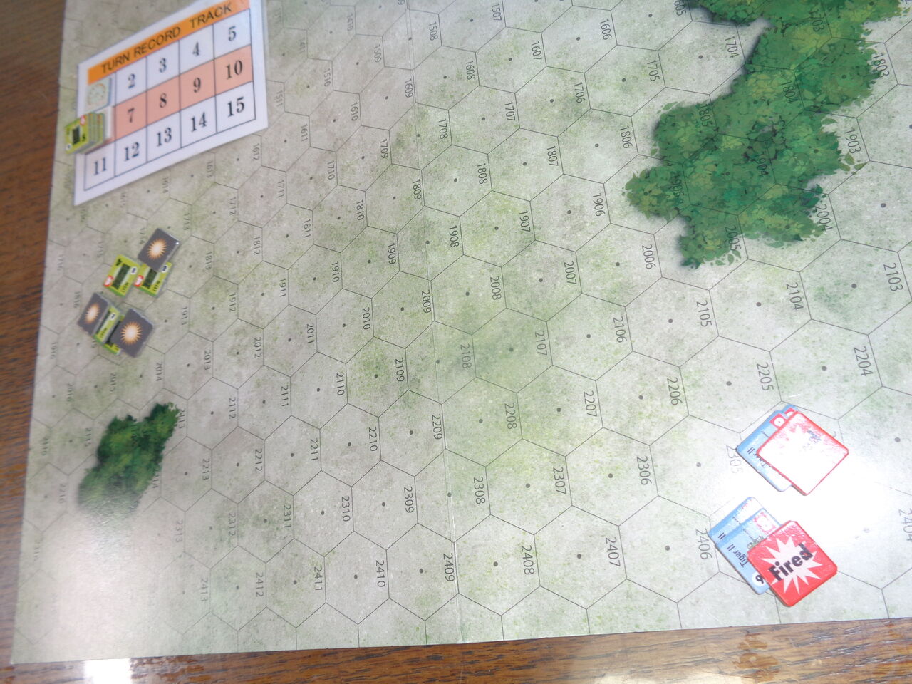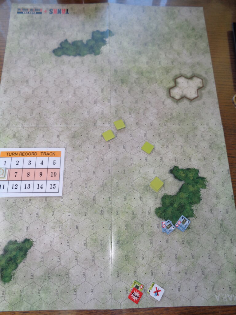 歴戦の勇者は、慌てることなく、M26に照準をつけ、前進射撃で2輛を撃破します。 アメリカ軍ターン、唯一、機能を持って生き残ったM26が4へクスで準備射撃をしますが、これがはずれ。戦後アメリカ軍のMBTとなる重戦車は、全く役に立たず。