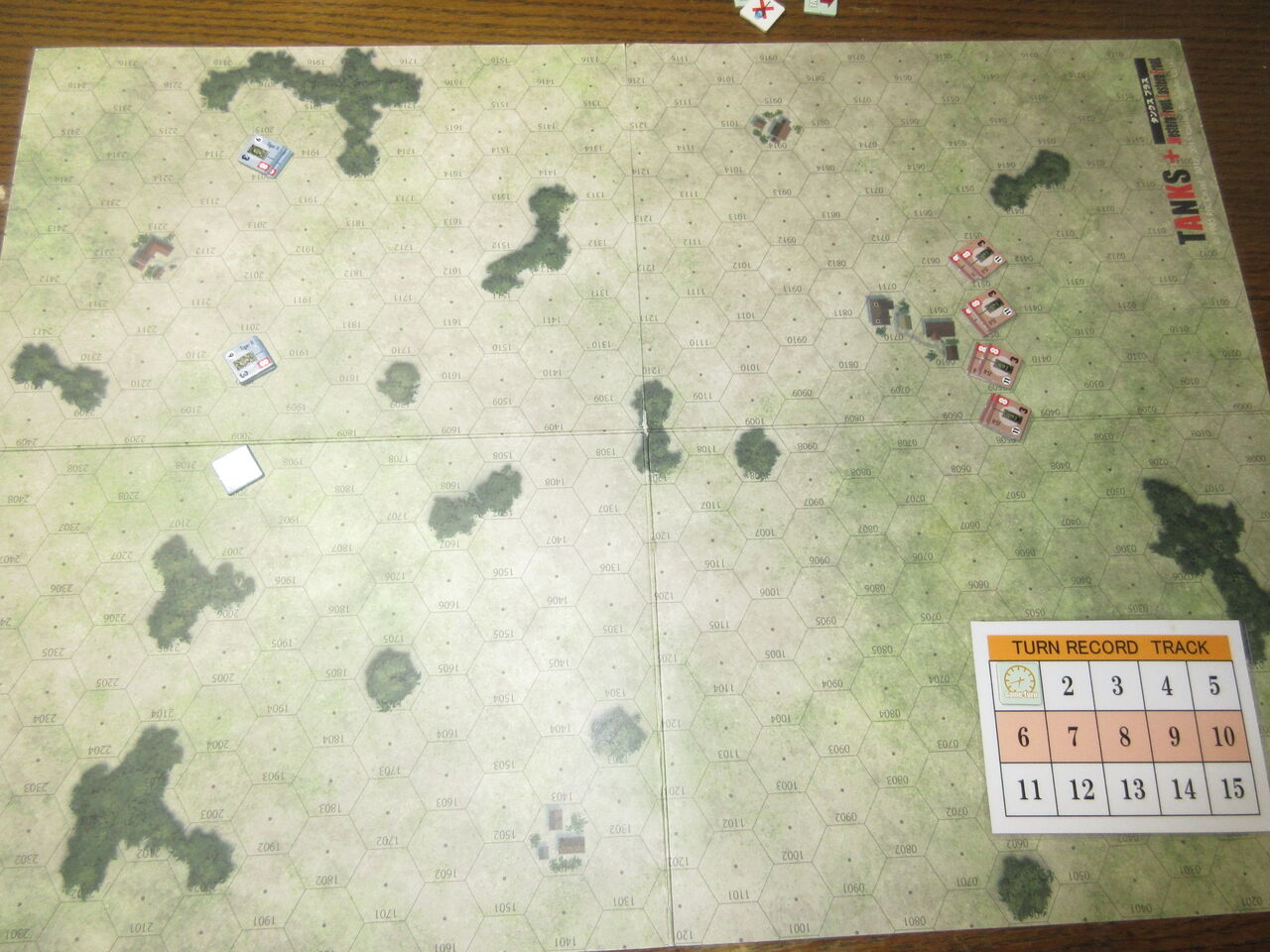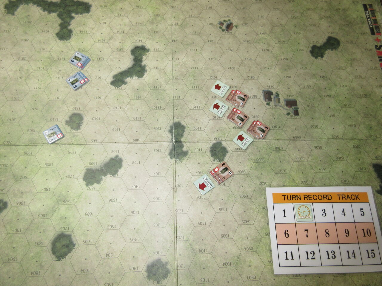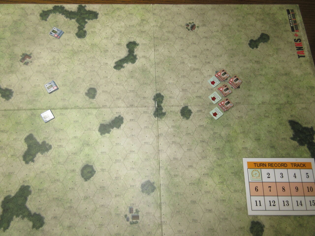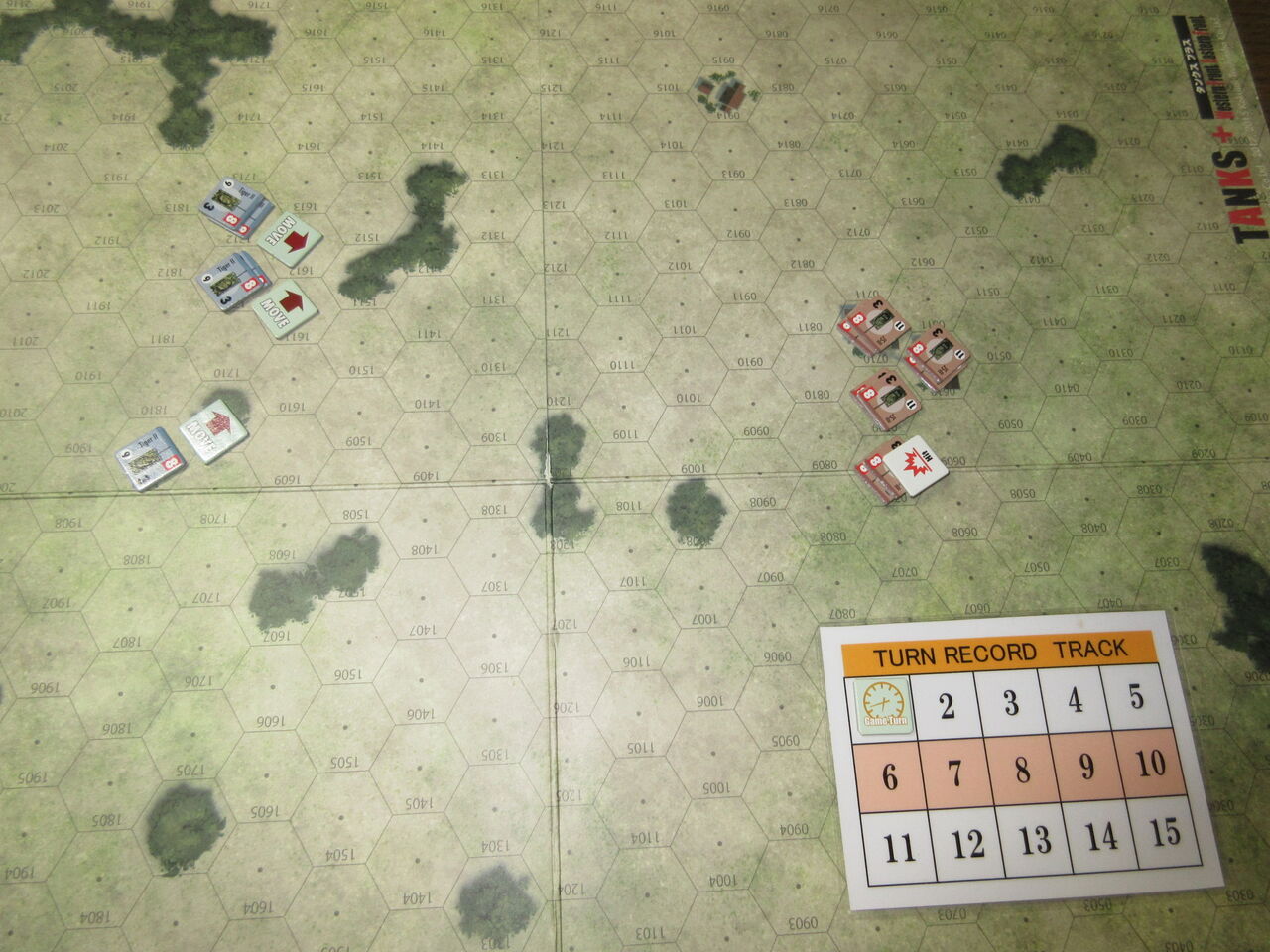 第2ターン、ソ連軍はなおも距離を詰め、命中率の向上に努めます。うち、2両は中央森林の南側へ迂回し、後に数で有利な射撃を行うか、あわよくば側面攻撃を狙います。