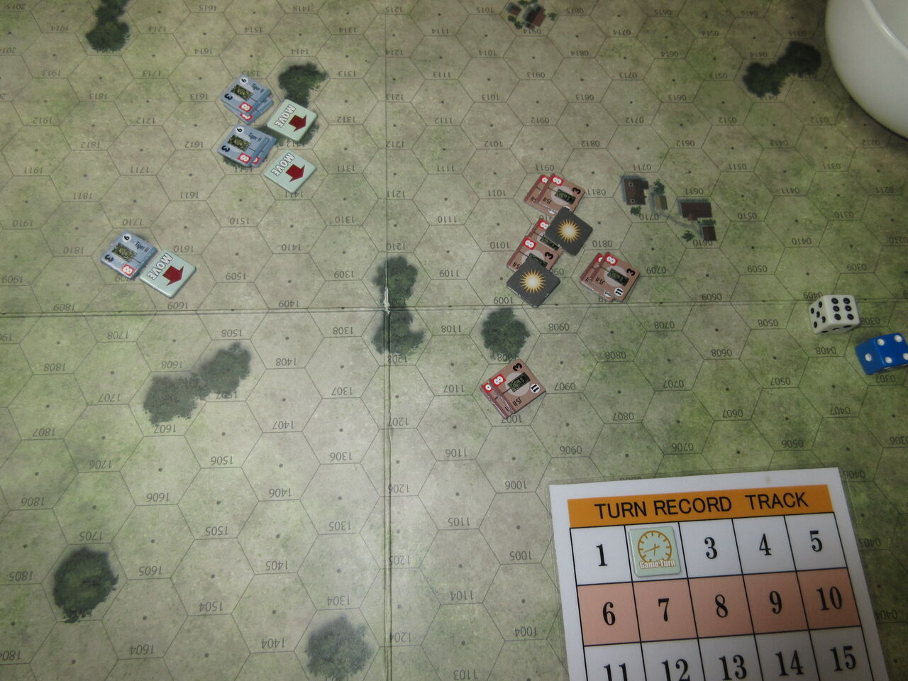 第1ターン、ソ連軍は森林を利用して、射線の通らない中央に前進します。