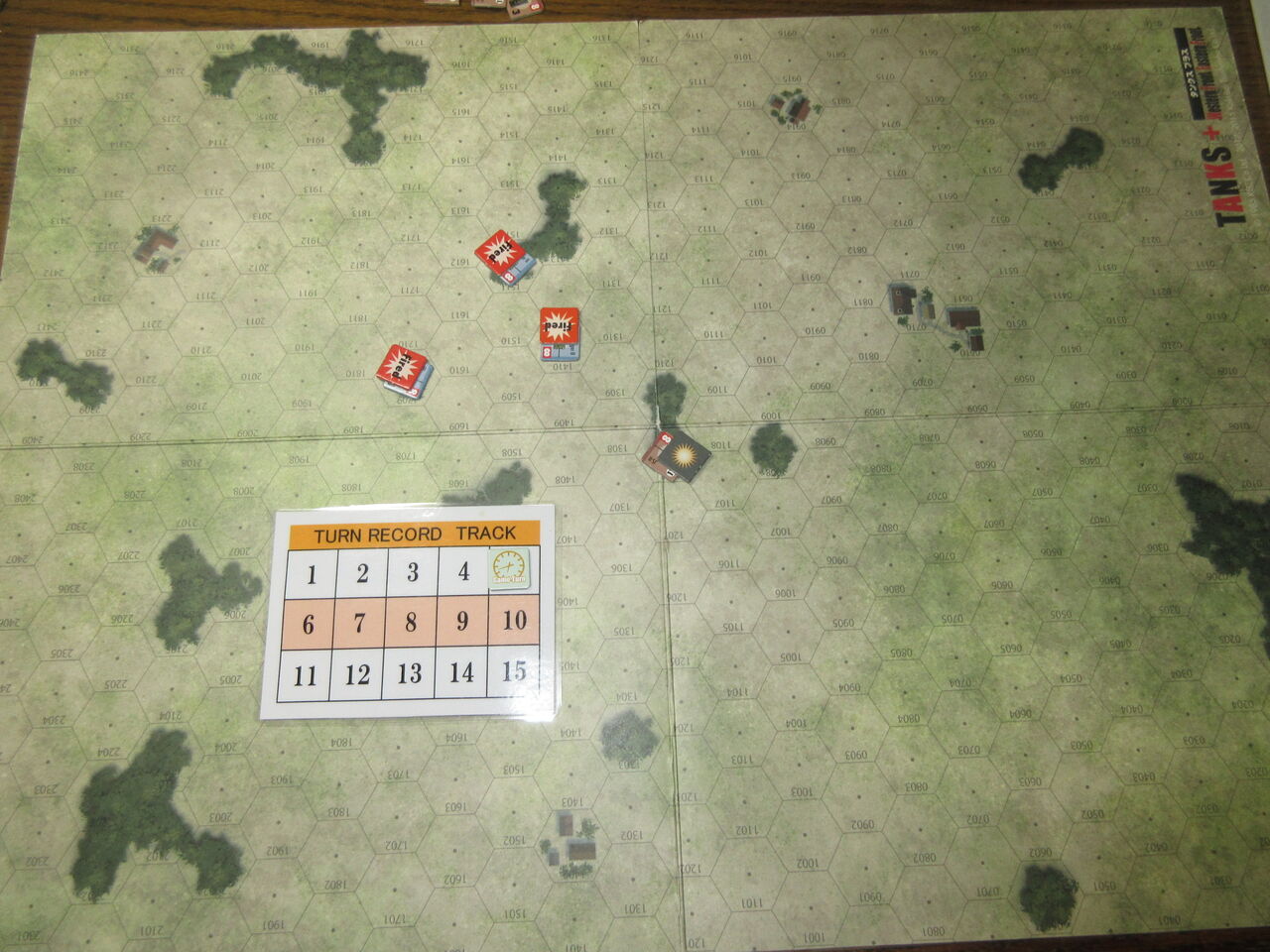 第3ターン、ここが勝負のソ連軍は、4両が足を止め、射撃戦に入りますが、森の効果で命中率が落ち、1発を命中させるのがやっと。それでも巨大な122mm砲弾の威力は高く、ドイツ軍最強のTIGERⅡの装甲を貫通し、これを撃破します。しかしながら、貴重な1両が弾薬切れになり、舞台を去ります(既定により除去扱い)。
