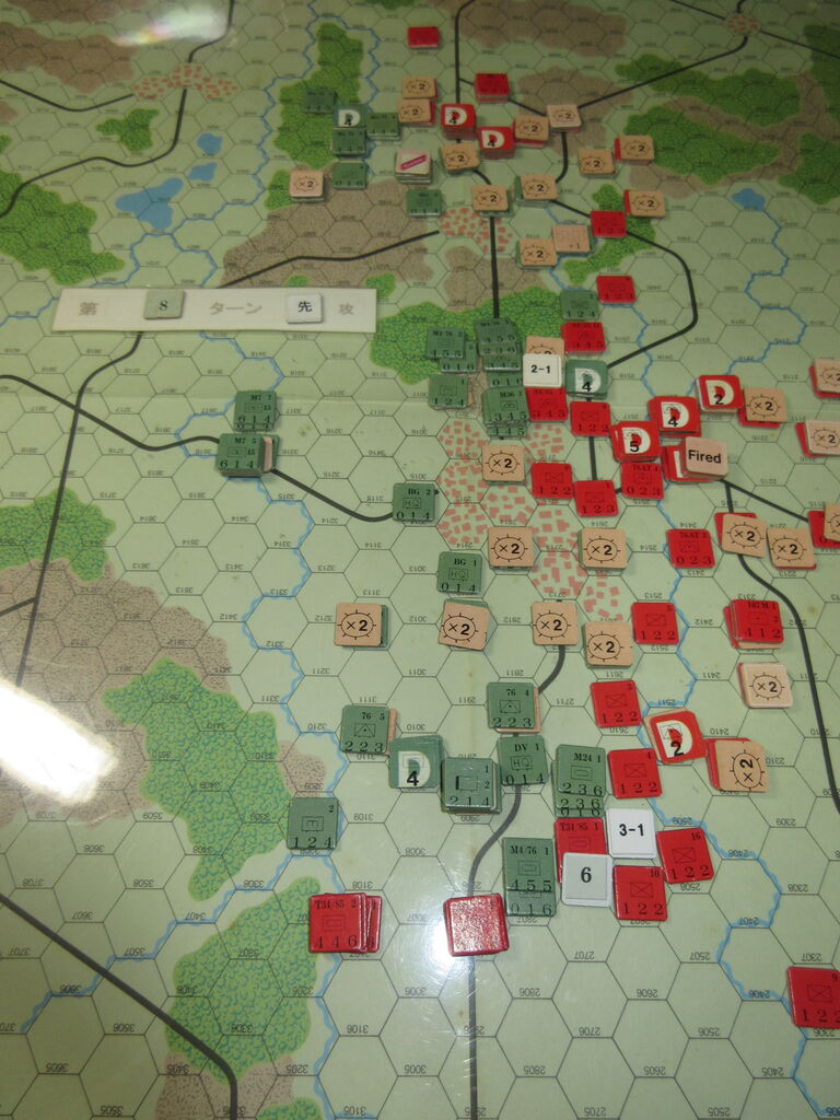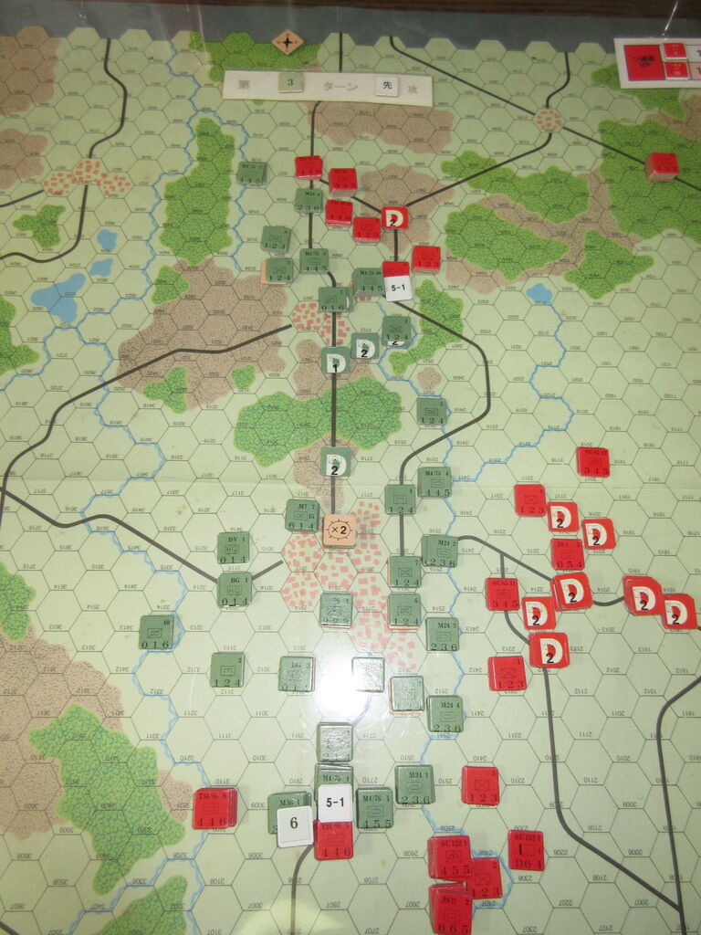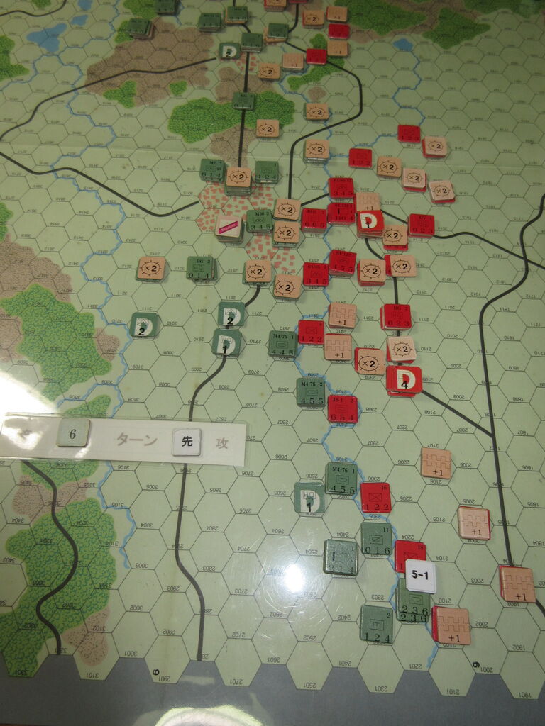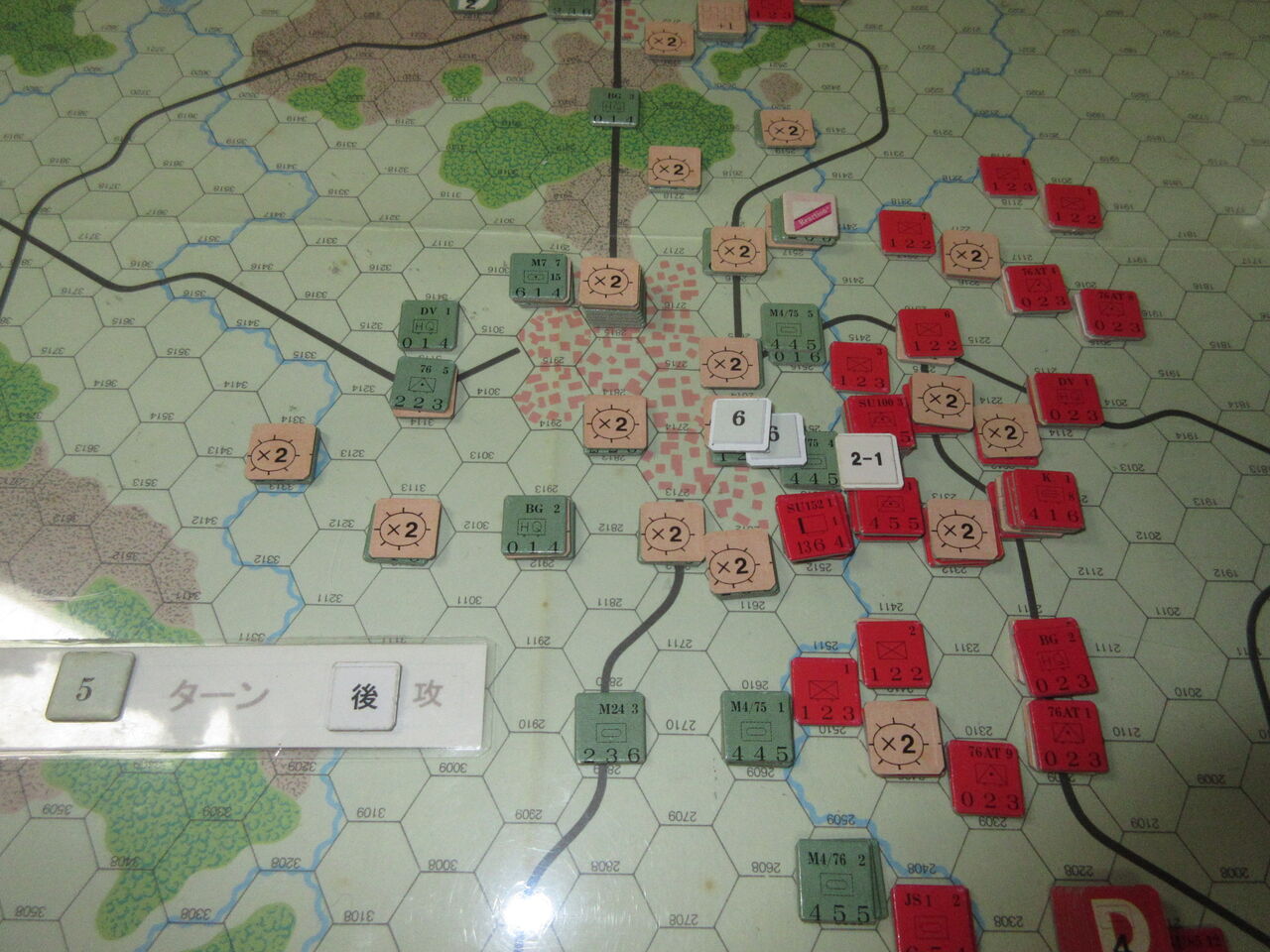 ソ連軍ターン、南部の戦線を整理すると、手薄になった中央でAFVと突撃砲による31火力の攻撃を行います。圧倒的な火力差でしたが、アメリカ軍は12火力の防御支援攻撃を行い2:1まで比率を低下させます。が、ソ連軍も意地のDRで、攻撃を成功させます。