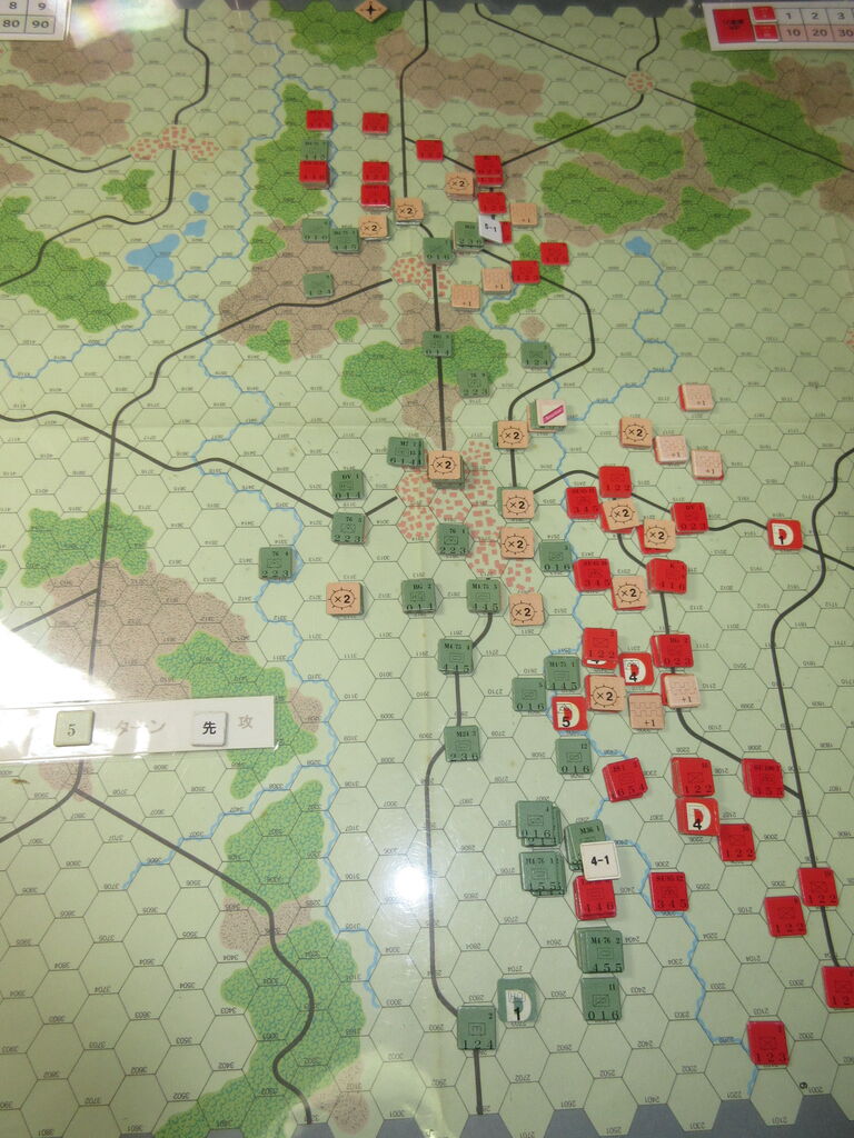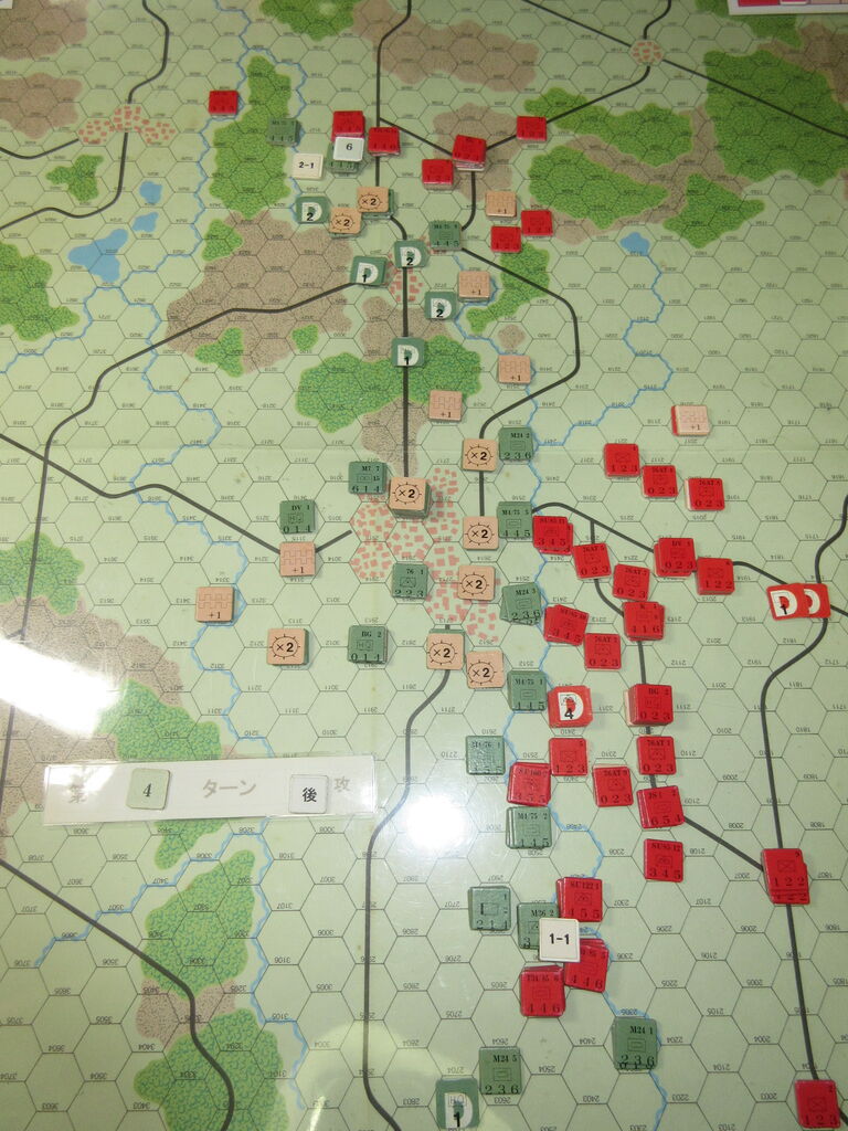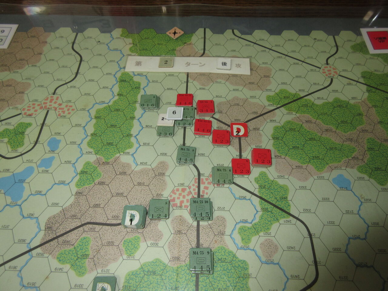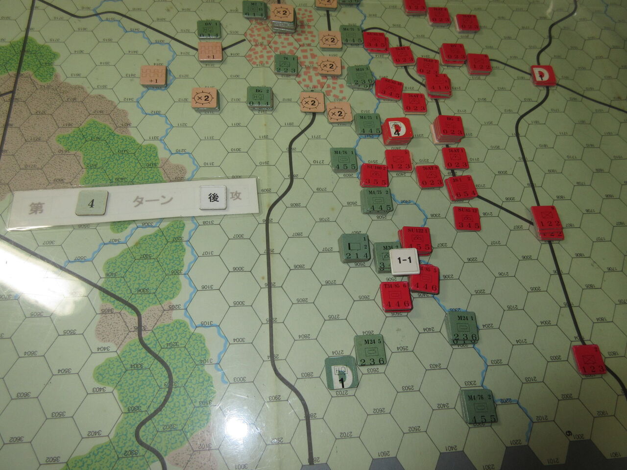 ソ連軍ターン、南部の戦線を整理すると、手薄になった中央でAFVと突撃砲による31火力の攻撃を行います。圧倒的な火力差でしたが、アメリカ軍は12火力の防御支援攻撃を行い2:1まで比率を低下させます。が、ソ連軍も意地のDRで、攻撃を成功させます。