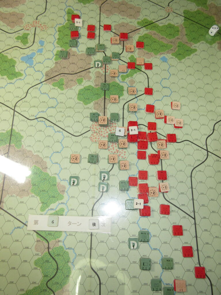 第6ターンのアメリカ軍ターン、南部の戦闘団司令部が2ターン連続で回復できず(確率は11%、どうなってるんじゃい!)。やむなく、中央の師団司令部を、こちらに差し向けることに。優勢ではあるものの下手な攻撃はCの可能性があるため、歩兵に対してのみ、5:1攻撃をかけましたが、DRとなって実質的な成果はなし。