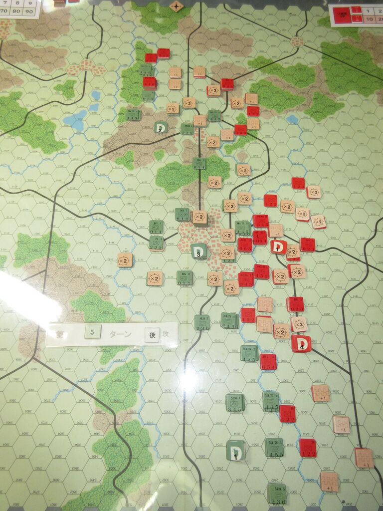 中盤となる第5ターン、アメリカ軍は北部の連絡線を活性化するため、前ターンに北寄りに移していた師団司令部で、戦闘団司令部を回復。これにより、対戦車砲を含む全ユニットが回復し、戦線を引き直します。が、戦力集中ができず、被包囲部隊の救出はならず。