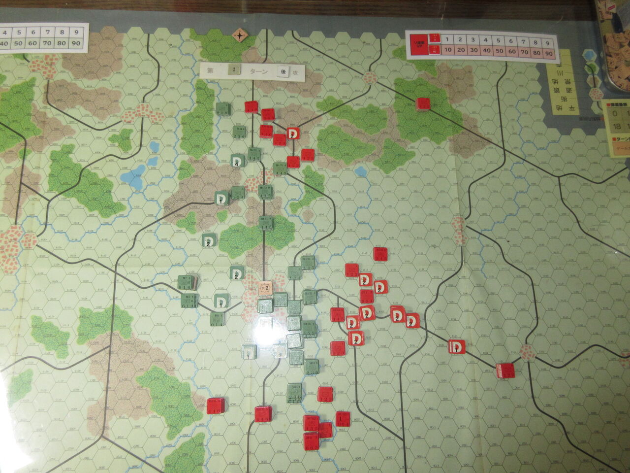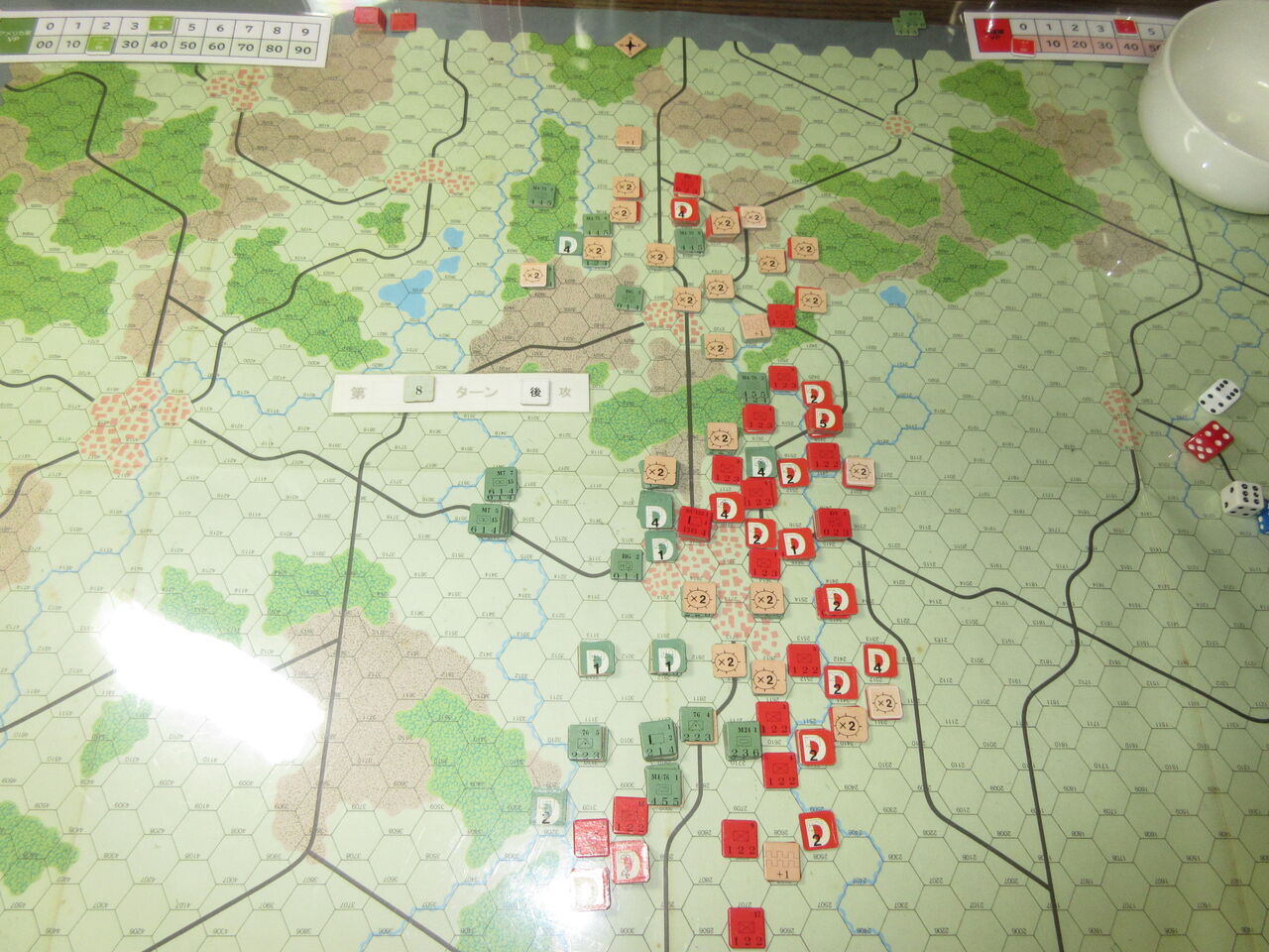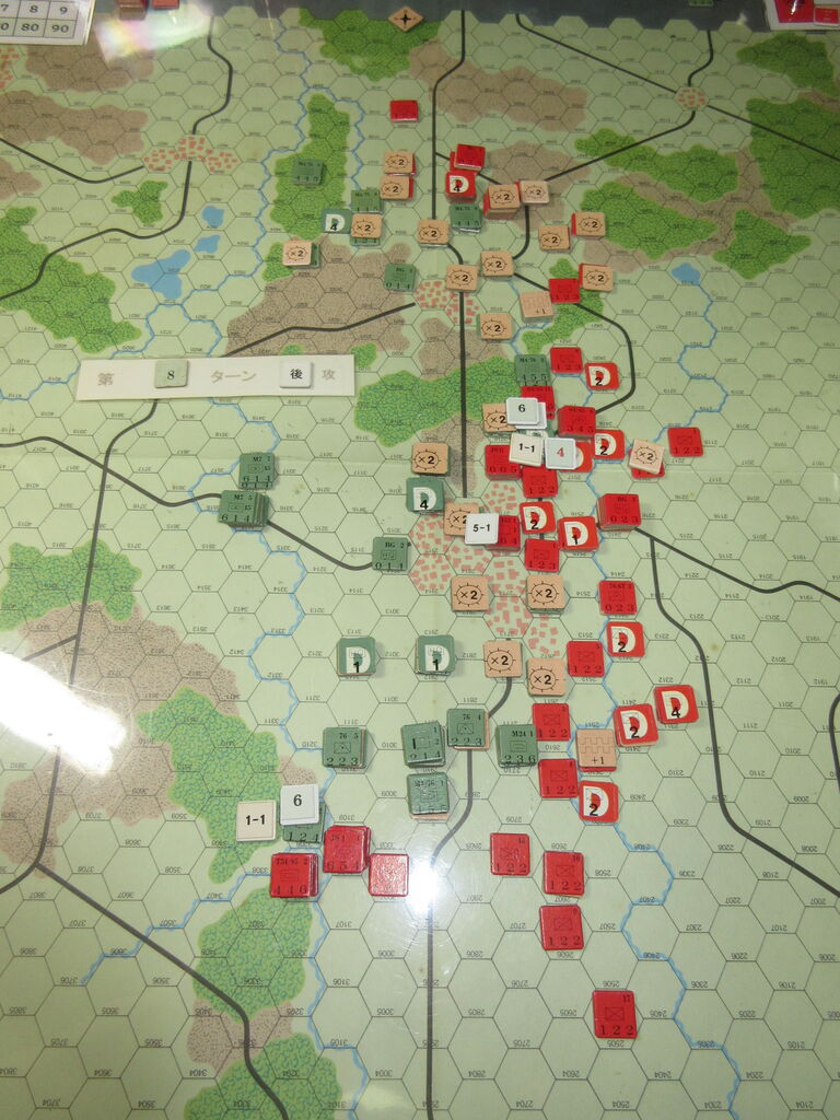 ソ連軍ターン、陣地によって効果は少ないことを承知で、その中央部に高火力攻撃をかけます。集中運用したソ連軍は強力で48火力を集結し、僅か6戦闘力の敵に襲いかかります。アメリカ軍は8戦力のリアクション部隊と6砲撃力を注ぎ込んで、2:1まで戦闘比を低下させます。が、ソ連軍の気迫が勝り、DRに。戦闘団司令部が健在のため、アメリカ軍は直後に回復できるのですが、戦線をじりじりと押し上げます。