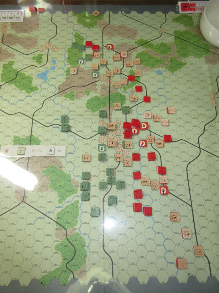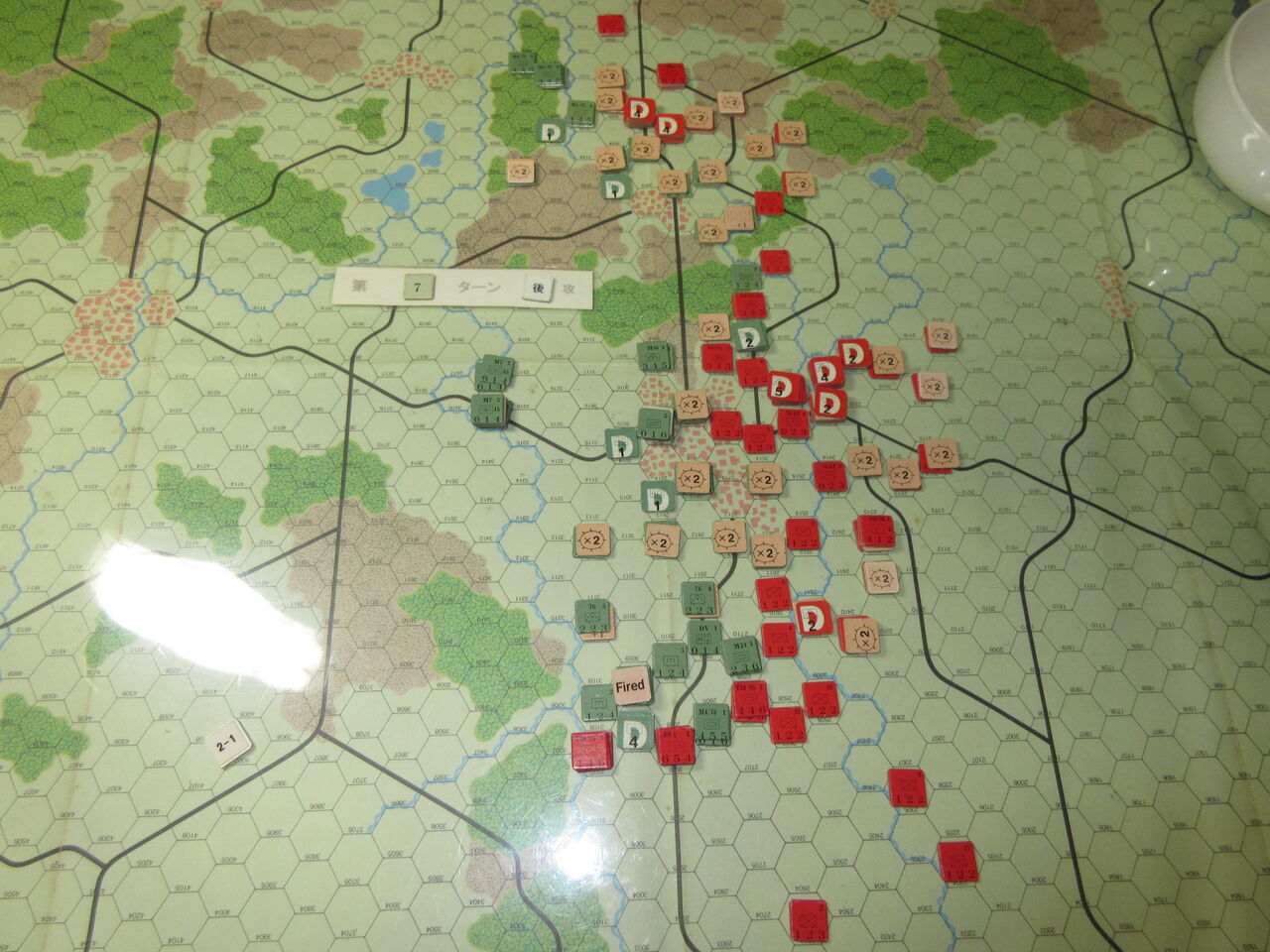 第7ターン、VPで優位に立っているアメリカ軍は、無理は禁物と南部の部隊を主防衛線に撤収させ、余剰部隊を中央に転用して、前線を強化します。北部では、混乱状態のM4がなぜか離脱に失敗し続け、戦線にやや偏りが出ます。