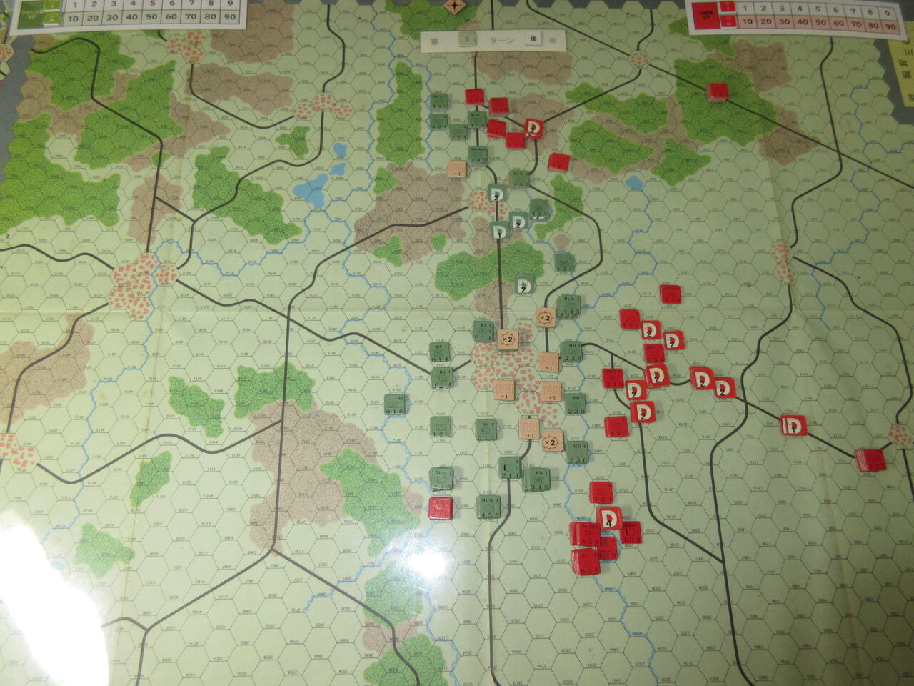 第3ターンのアメリカ軍ターン、中央の間隙を対戦車砲と機械化歩兵の展開で埋めると、南北で反撃に出ます。北部では、前衛の歩兵中隊に5:1攻撃をかけますが、こちらはDRに止まります(確率は1/2)。南部では先鋒のT34スタックに砲兵も注ぎ込んで5:1攻撃をしますが、こちらもダイスに恵まれずDRに。敵の南部戦線に穴が空きますが、市街地を押さえ、VPで優越するアメリカ軍は、防御を優先して突出せず。