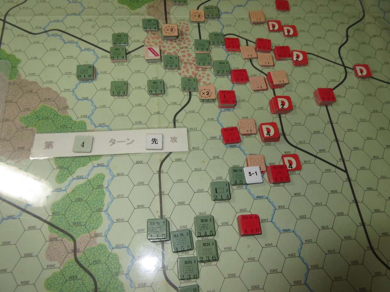 北部では、戦闘集団HQが活性化したため、全部隊が敵に対峙する形で展開します。そのうち、快速のT34とSU85の9ユニットで、敵のM4+偵察部隊に、威力偵察攻撃をかけます。戦闘比は最高の5:1でしたが、アメリカ軍が早速、M7の防御支援砲撃(6火力)を実行し、2:1まで低下。それでも、精鋭の赤軍戦車部隊はDRとし、敵を戦術的に後退させます。