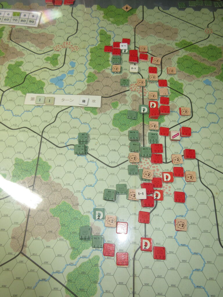 ソ連軍ターン、敵の攻勢失敗の隙を突き、北部で機械化歩兵を5:1で殲滅(3VPを獲得)。さらに、北の中央部を守る歩兵をに5:1をかけるも、アメリカ軍の必死の防御砲撃支援で2:1に低下。それでも、DRとして、一時的に戦線を麻痺させ、ソ連軍機甲部隊の突進で、敵の北部戦線は崩壊の一歩手前まで行きます。