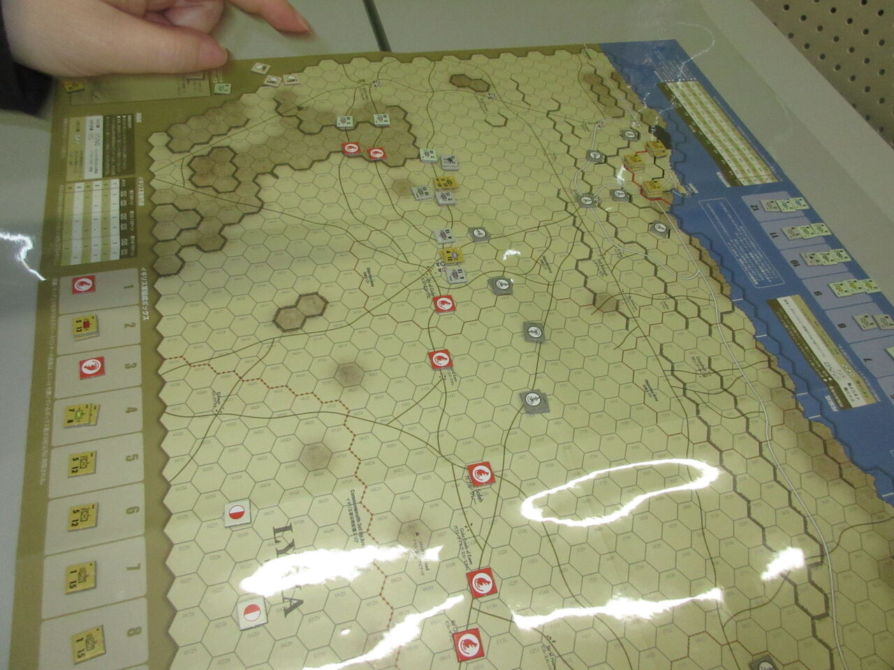 すっかり定番となったラインさんとDas Reichさんのエポック詣で、「砂漠の狐」(CMJ)を連戦。第1戦はドイツ軍(Das Reich)が、あえてドイツ軍が内陸から突進し、罠を仕掛けて包囲するはずが、ダミーカウンターの番号の読み違え(!)もあって、不発。突っこみすぎたドイツ装甲師団が包囲される展開となり、ラインさんの初勝利となりました。